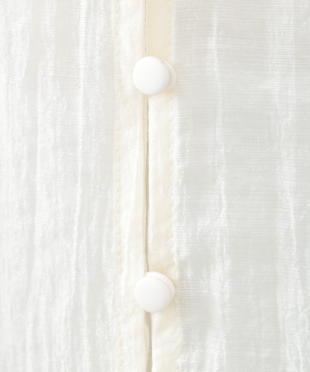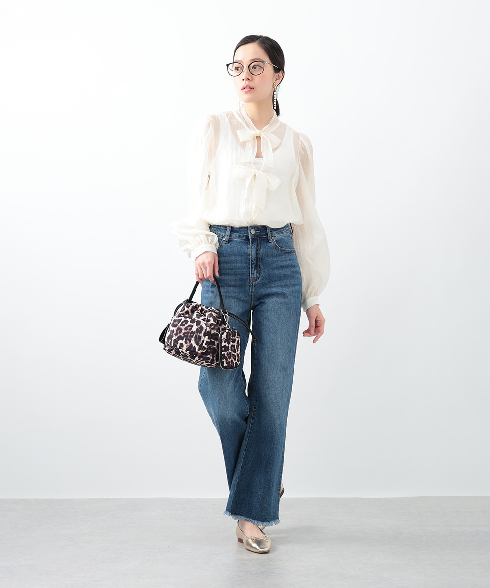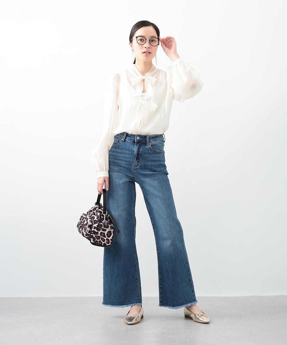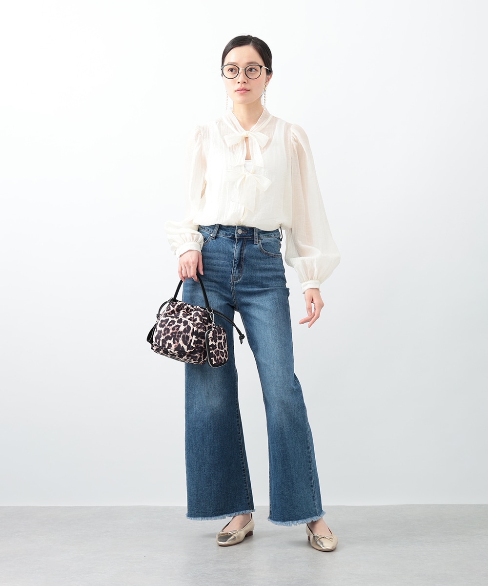 フロントのダブルリボンが女性らしいアクセントになるブラウス。透け感のあるシアー素材で柔らかく仕立て、スタイリングに軽やかな雰囲気を演出します。ふんわりとした立体的なスリーブがポイント。デニムと合わせて甘さを抑えたコーディネートもおすすめです。
