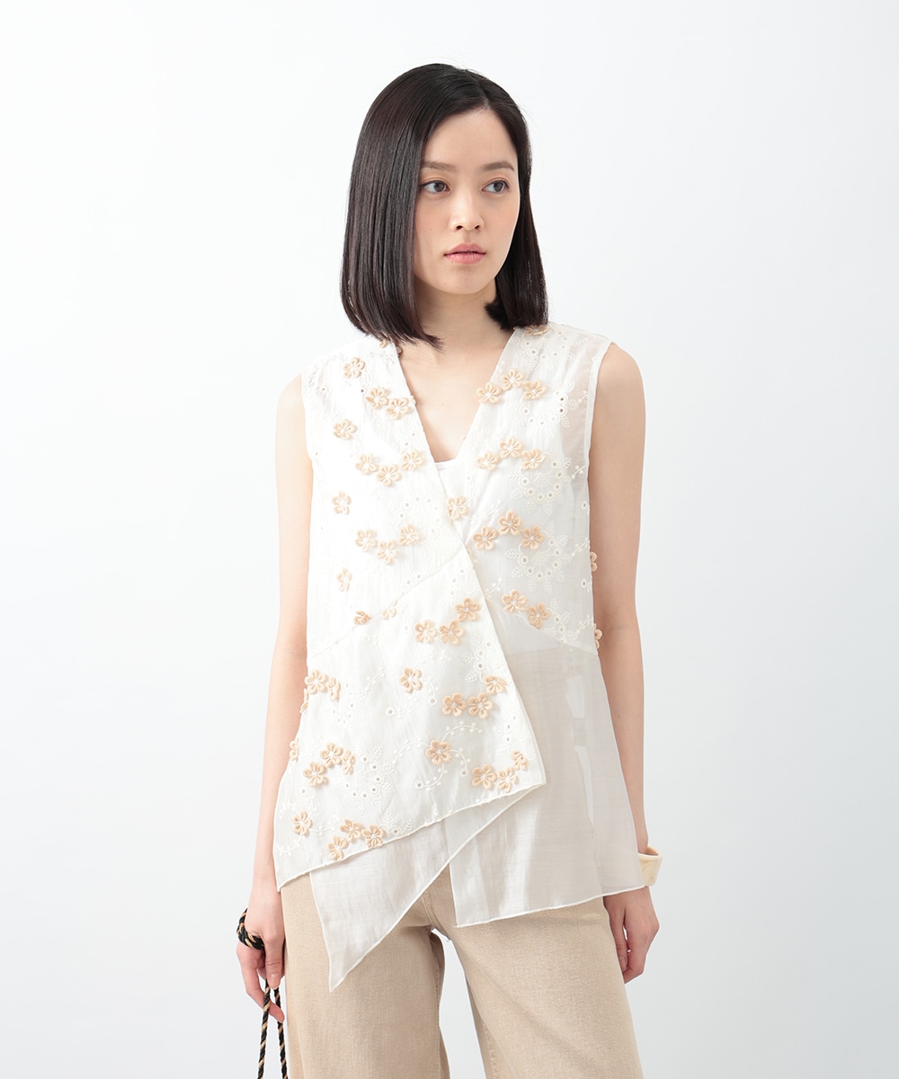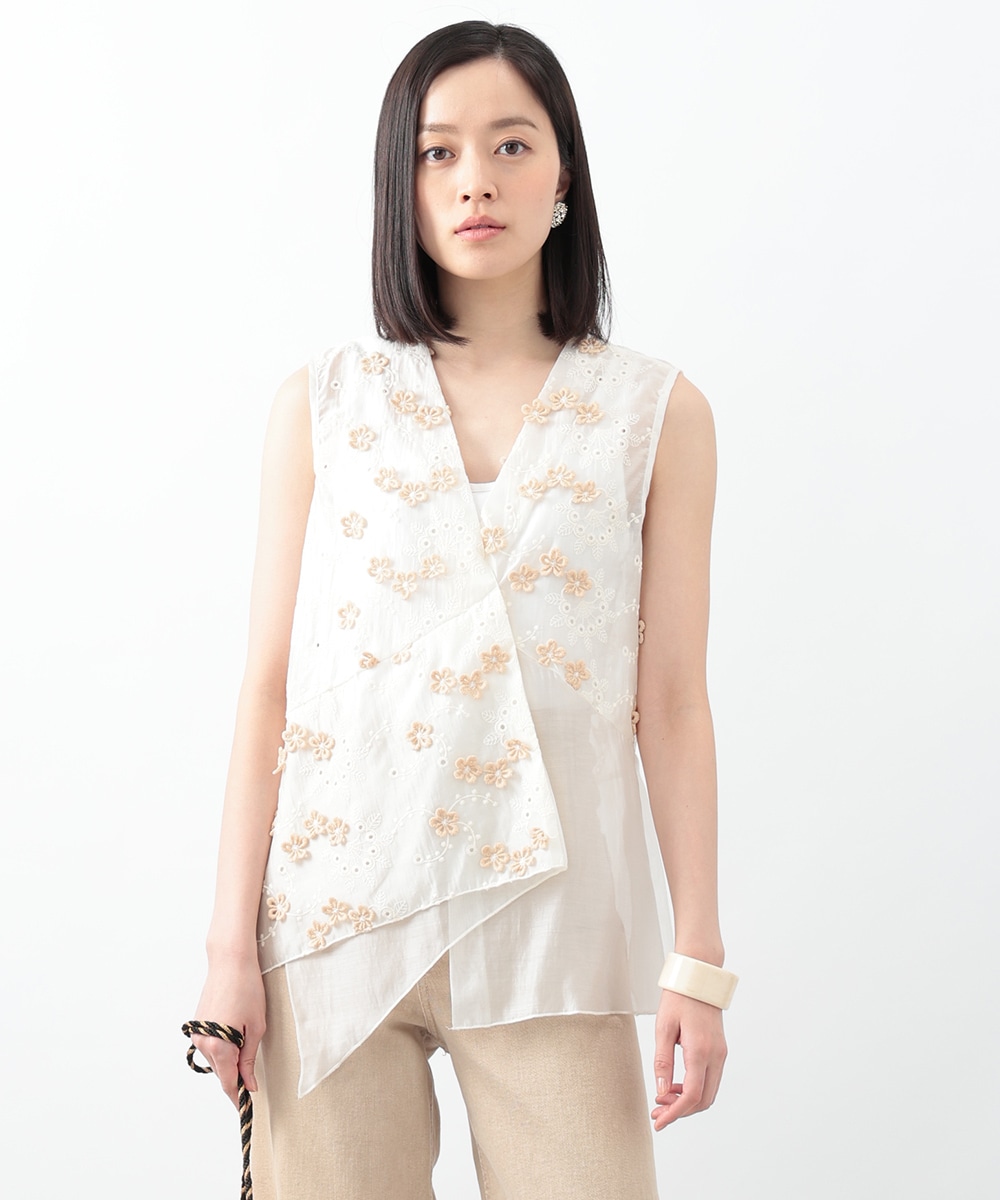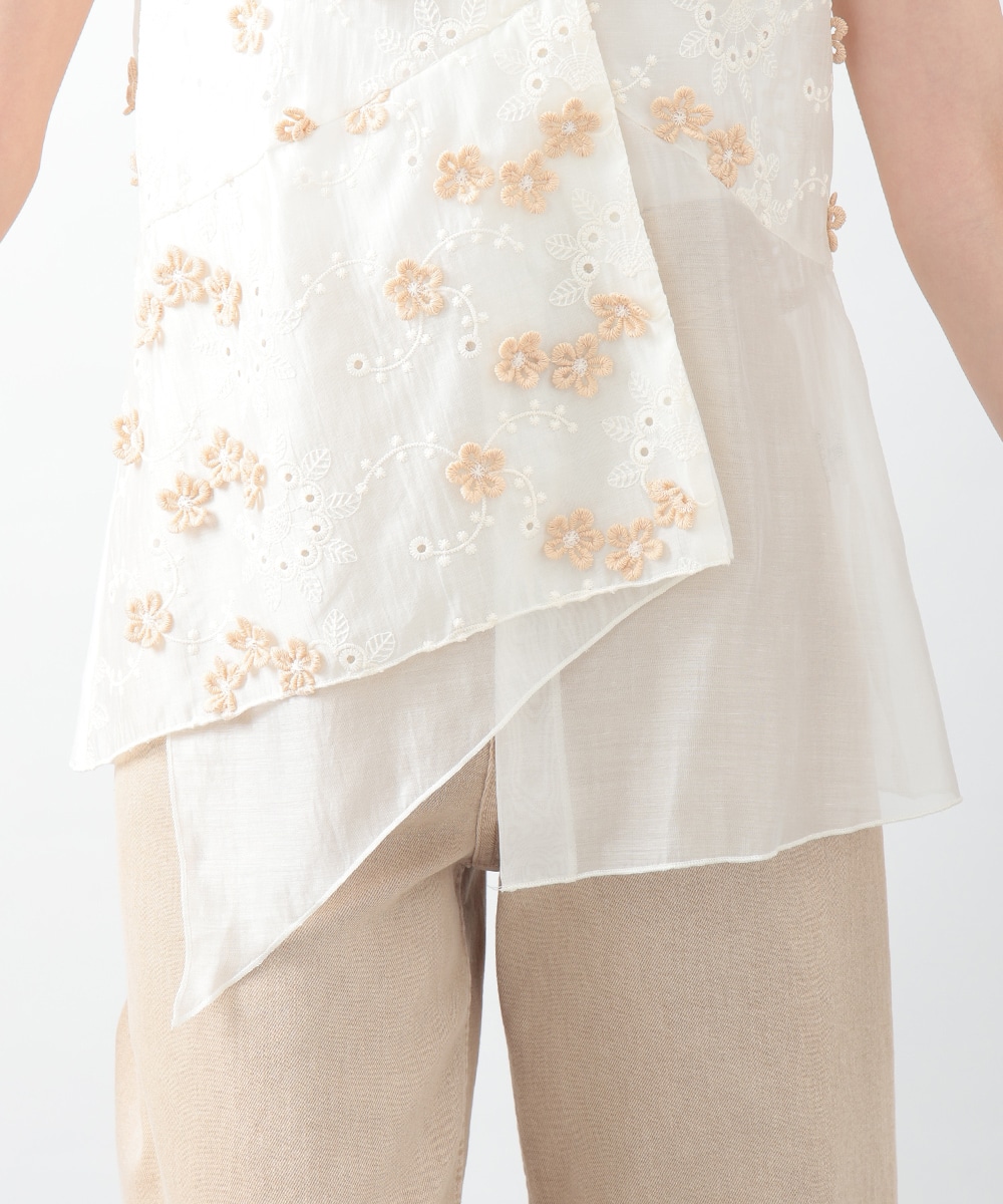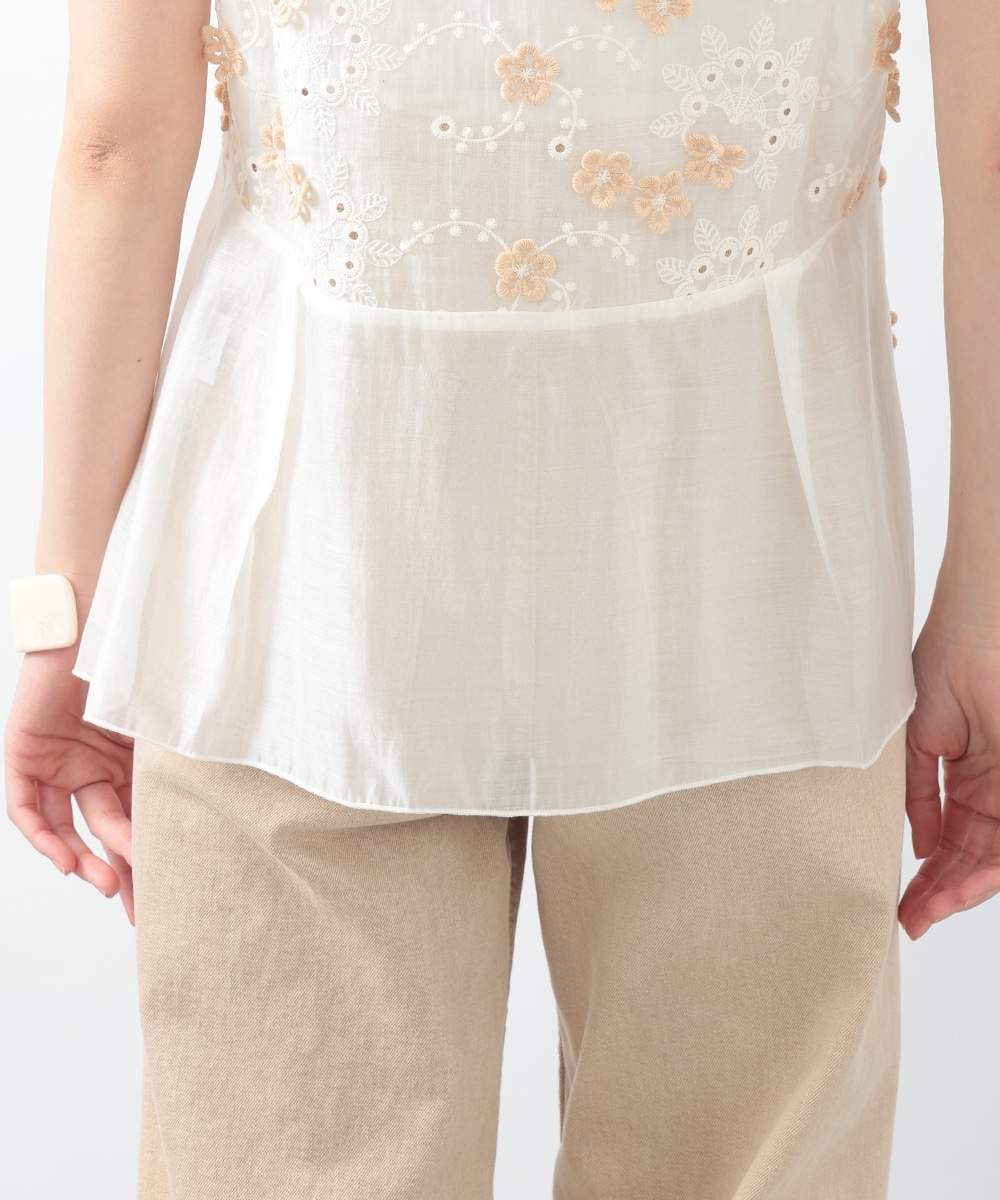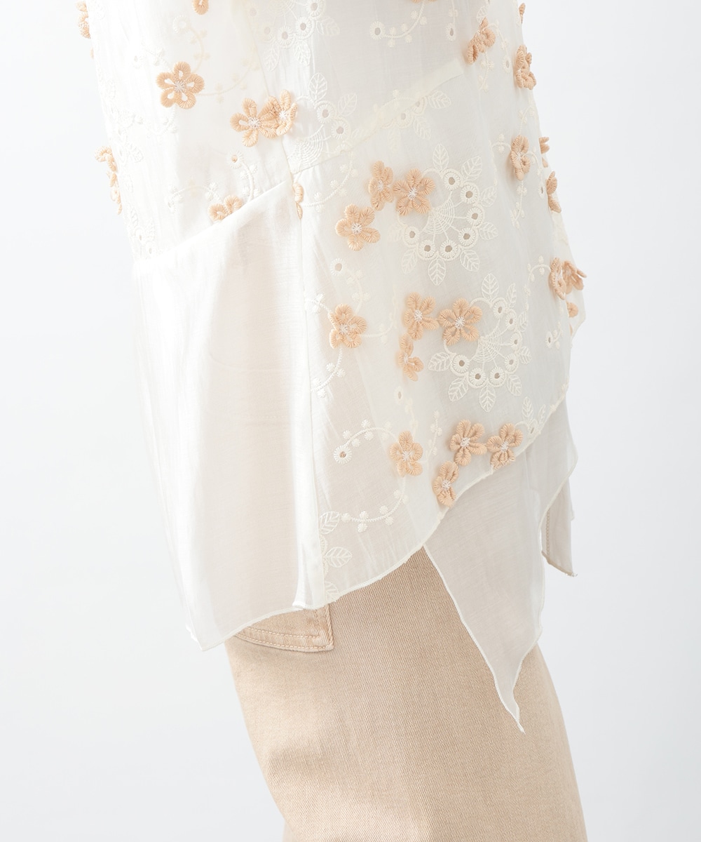 フラワーモチーフのデザインがシーズンムードを高めるブラウス。透け感のある素材を使用しており、軽やかな着心地を楽しめます。裾の切り替えデザインで立体感のあるシルエットを演出。ストレートパンツと合わせたきれいめなコーディネートがおすすめです。