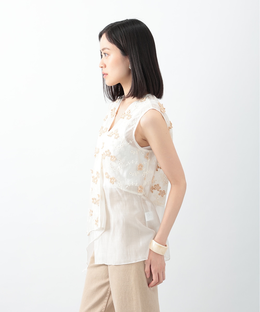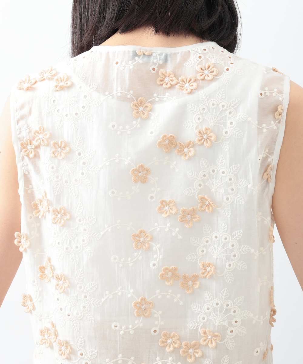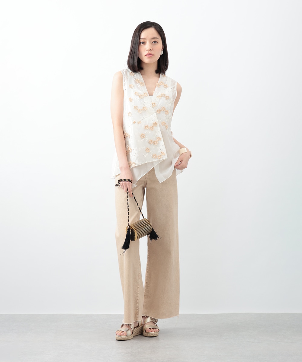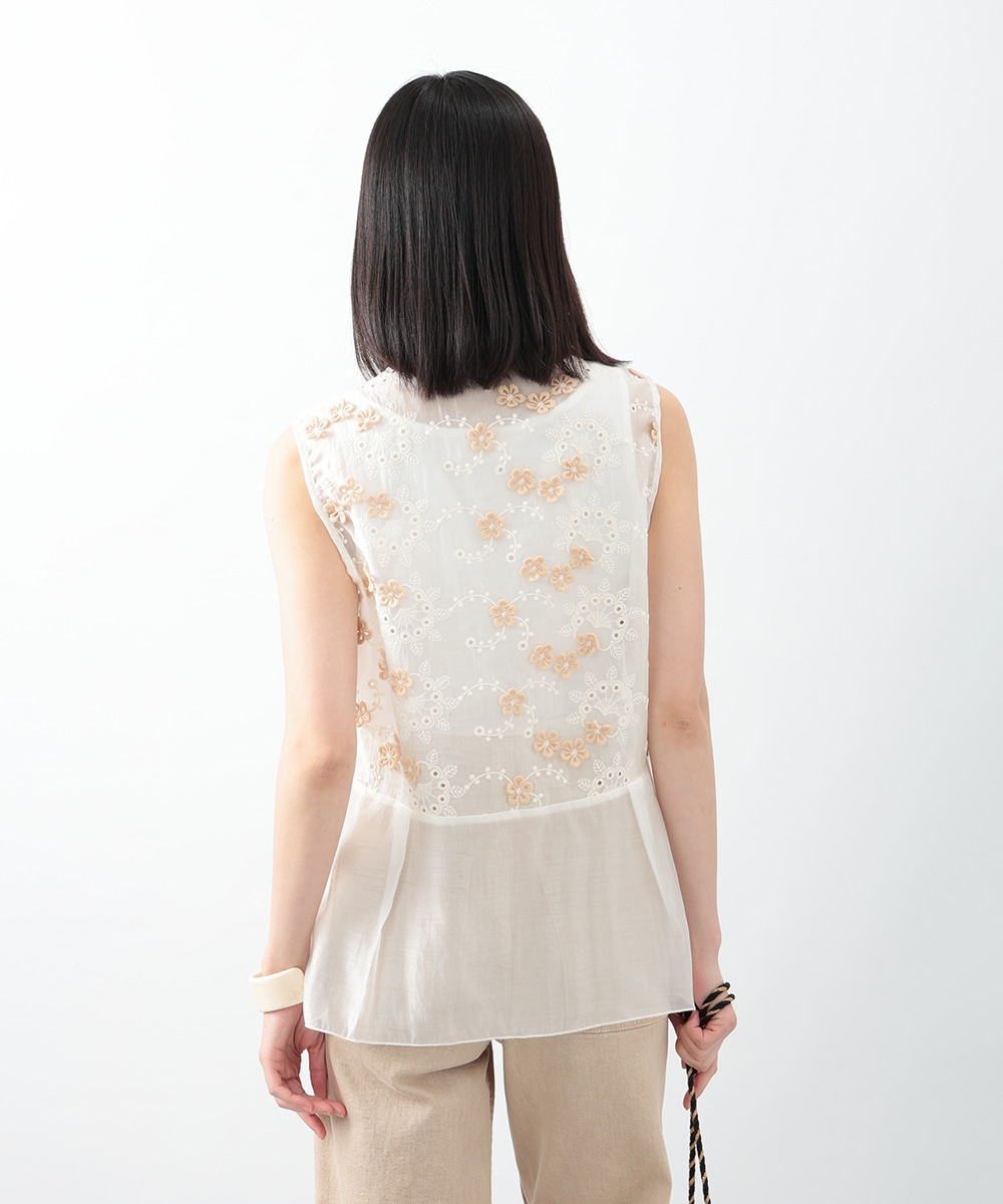 フラワーモチーフのデザインがシーズンムードを高めるブラウス。透け感のある素材を使用しており、軽やかな着心地を楽しめます。裾の切り替えデザインで立体感のあるシルエットを演出。ストレートパンツと合わせたきれいめなコーディネートがおすすめです。