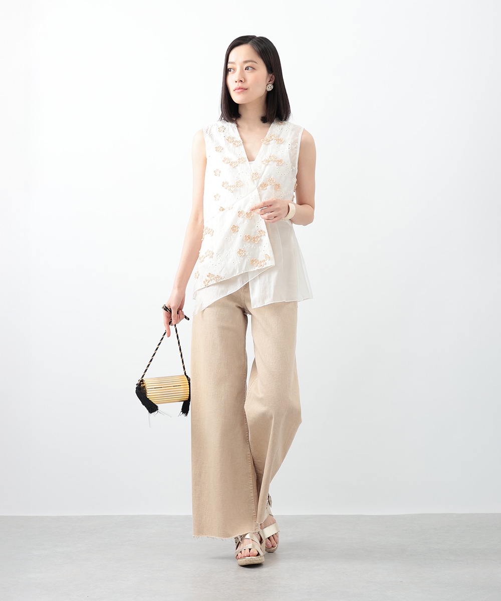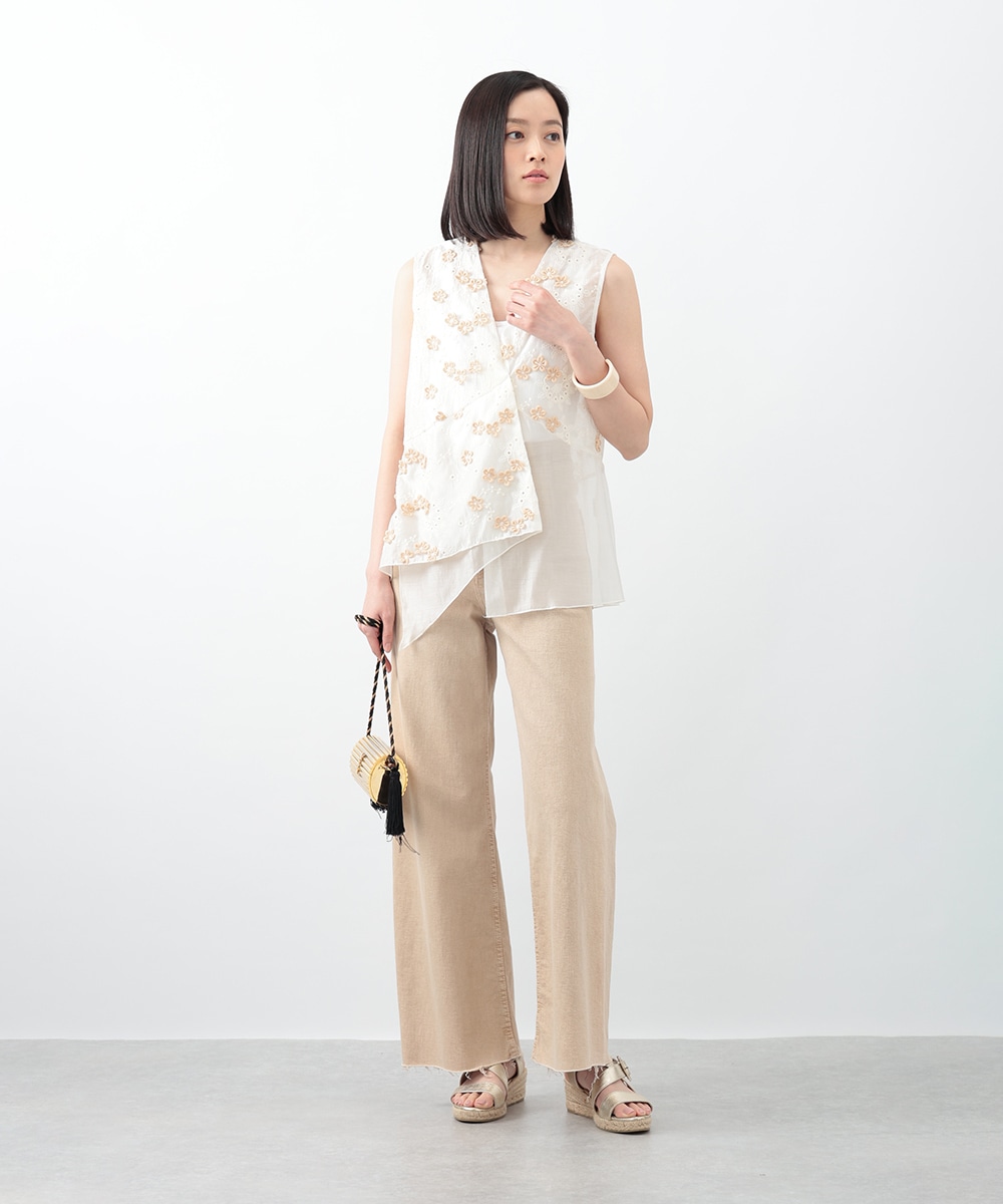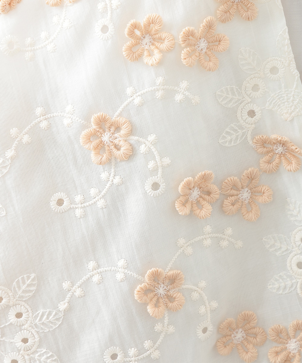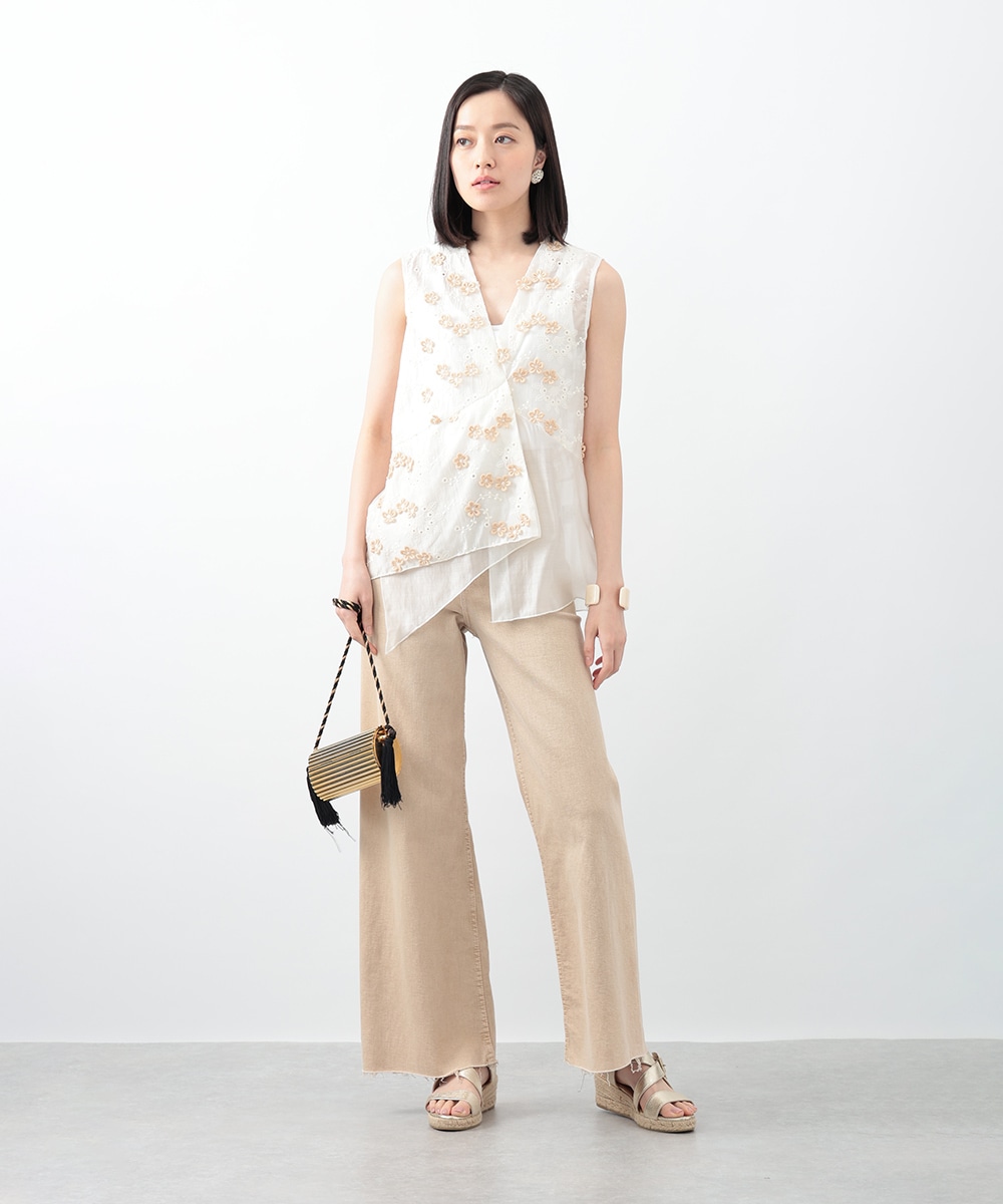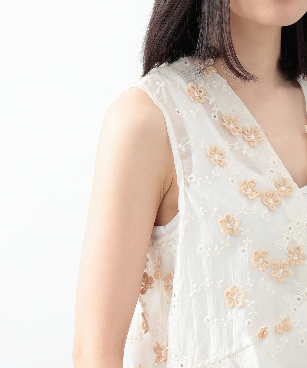 フラワーモチーフのデザインがシーズンムードを高めるブラウス。透け感のある素材を使用しており、軽やかな着心地を楽しめます。裾の切り替えデザインで立体感のあるシルエットを演出。ストレートパンツと合わせたきれいめなコーディネートがおすすめです。