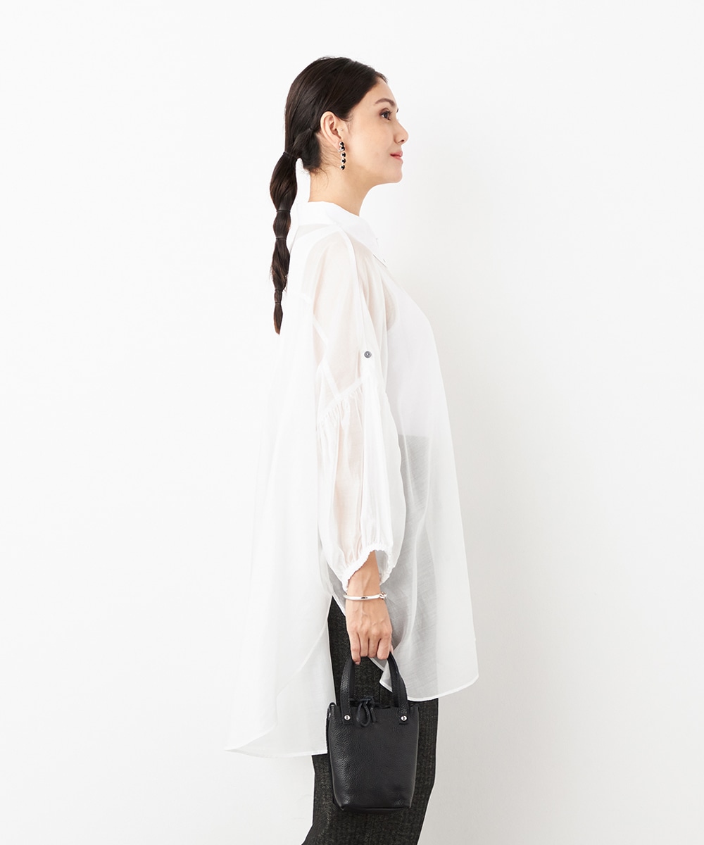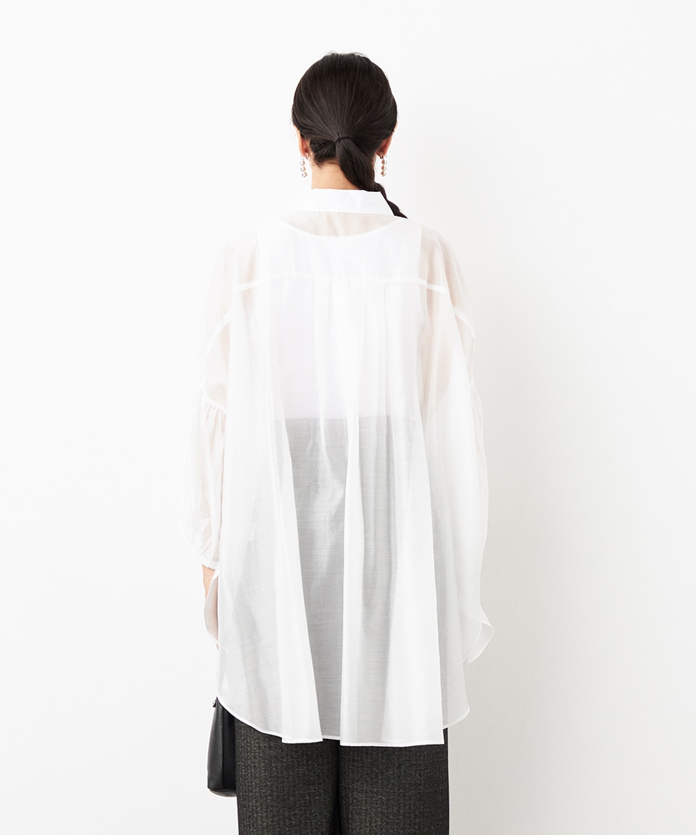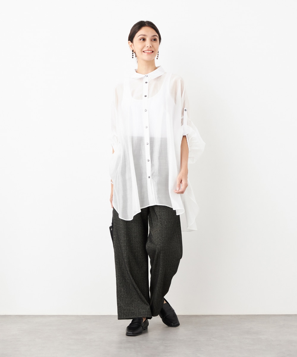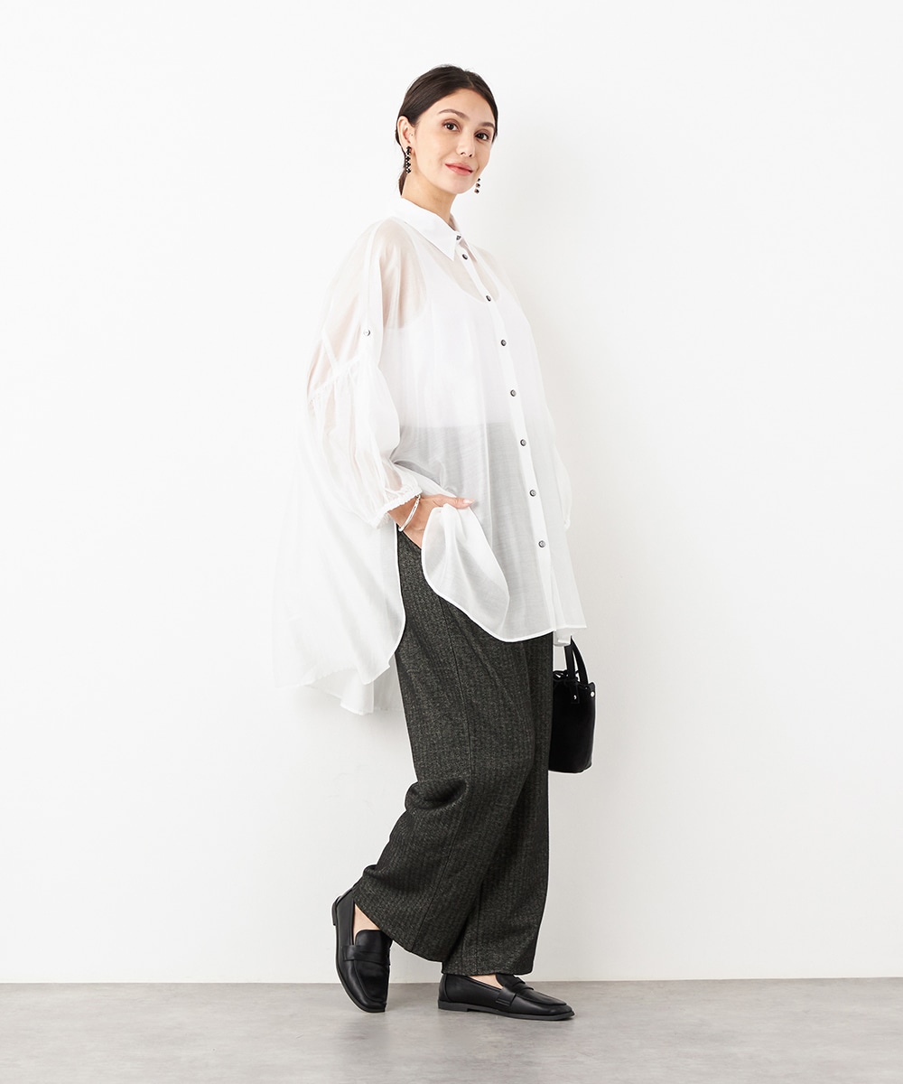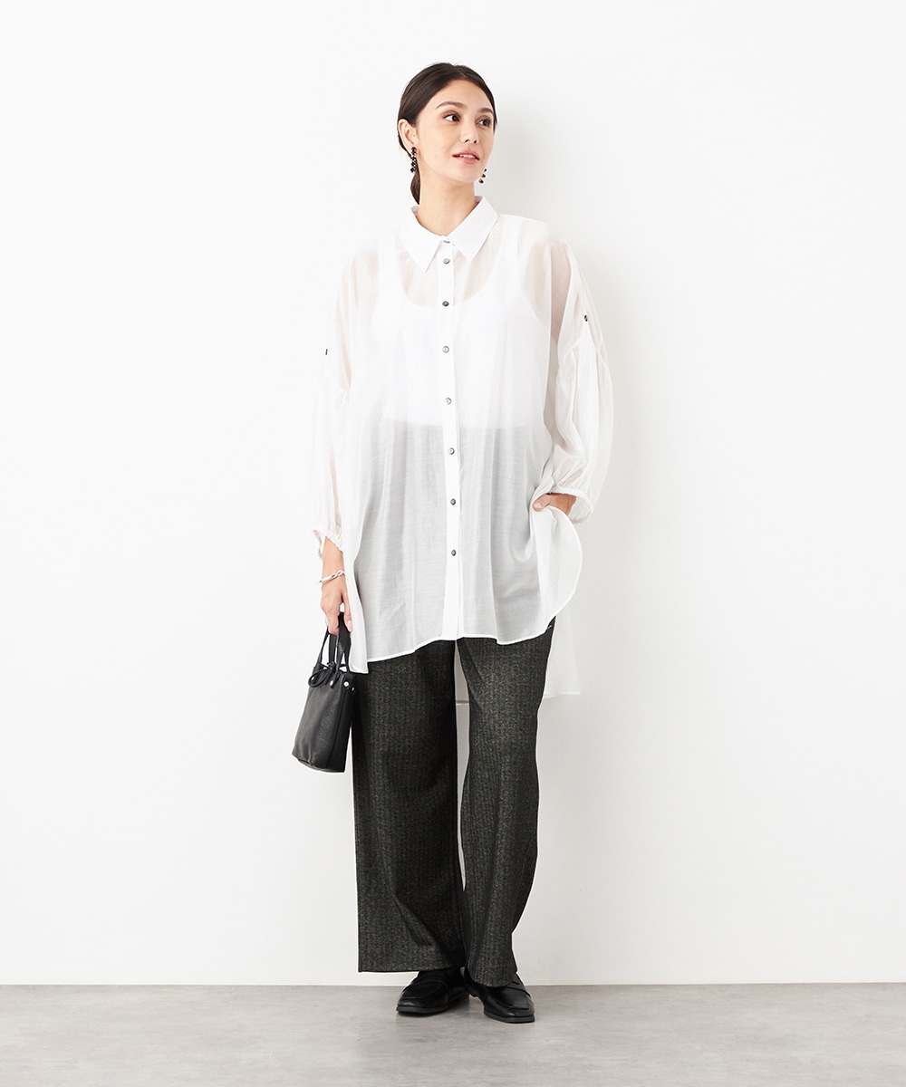薄手で繊細な透け感があり、フェミニンな印象です。ドロップショルダーのゆったりとしたシルエットや袖のボリュームが今年らしさのポイント。袖口裏のベルトをボタンで留めるアレンジも楽しめます。寒い時季にはインにタートルトップスを合わせても素敵です。トレンドのイエローは差し色としても活躍します。