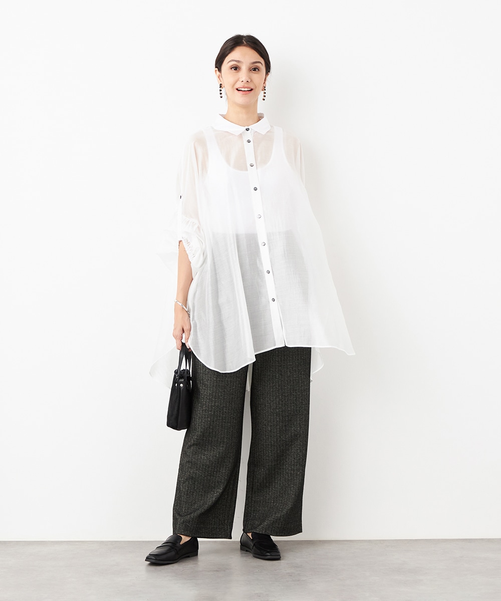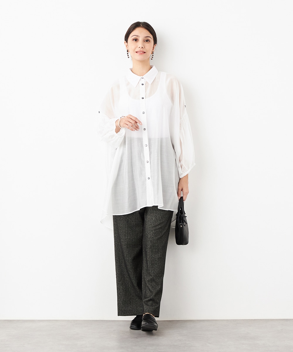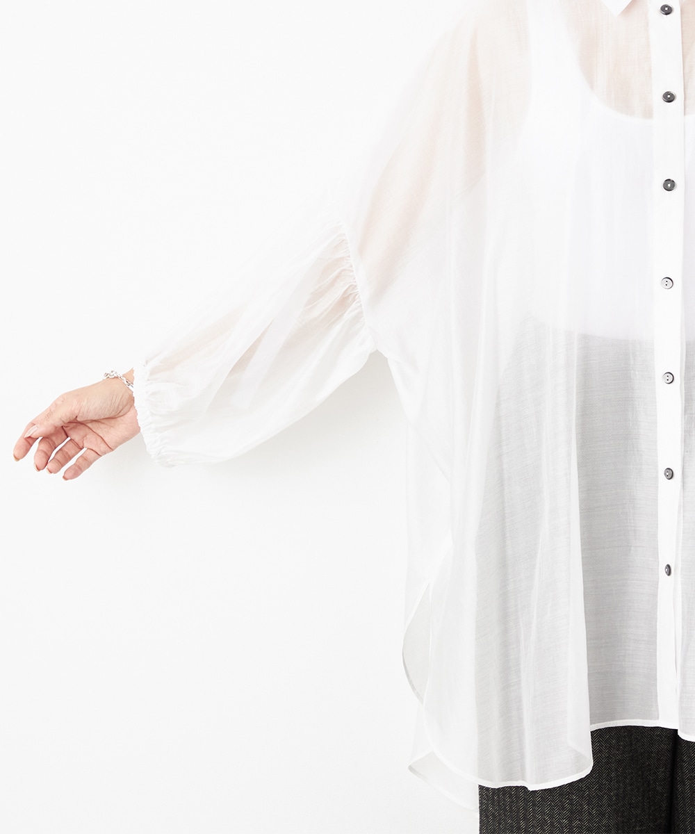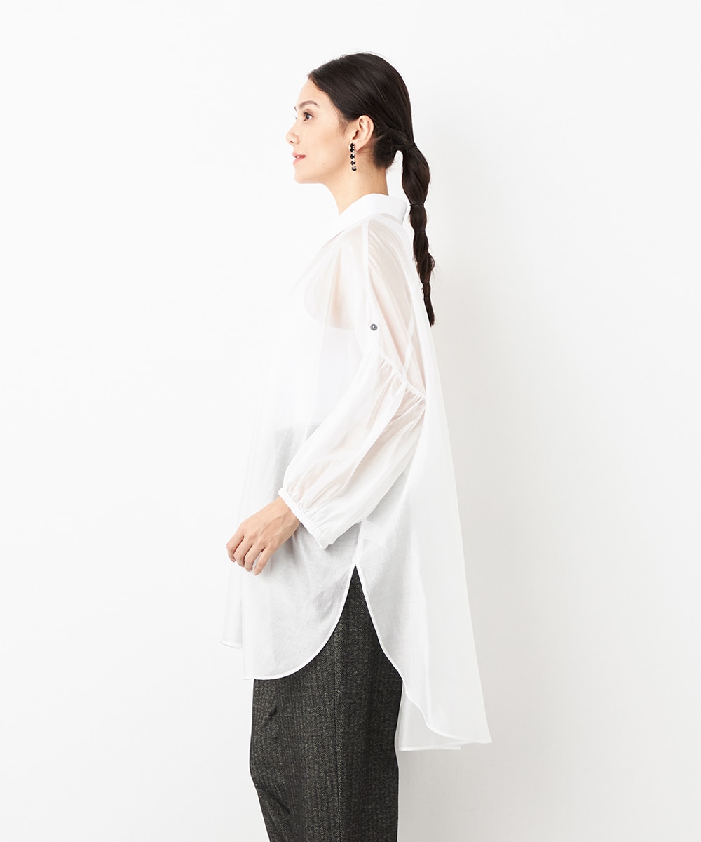 薄手で繊細な透け感があり、フェミニンな印象です。ドロップショルダーのゆったりとしたシルエットや袖のボリュームが今年らしさのポイント。袖口裏のベルトをボタンで留めるアレンジも楽しめます。寒い時季にはインにタートルトップスを合わせても素敵です。トレンドのイエローは差し色としても活躍します。