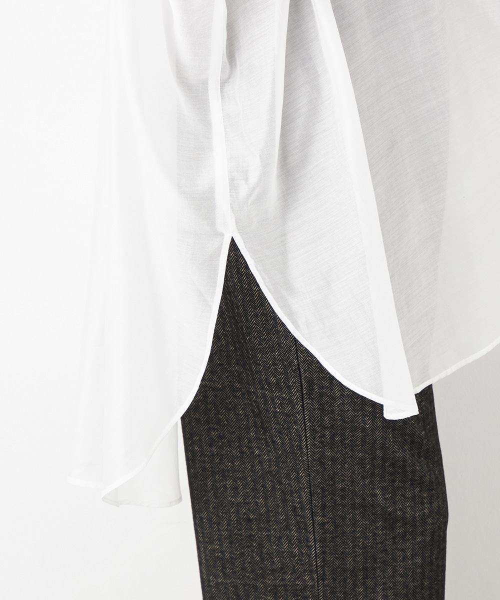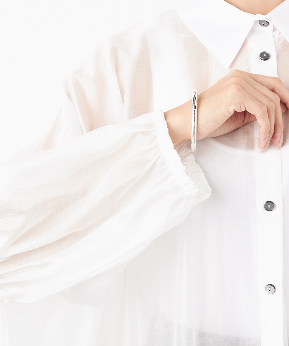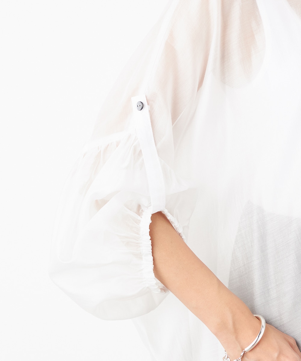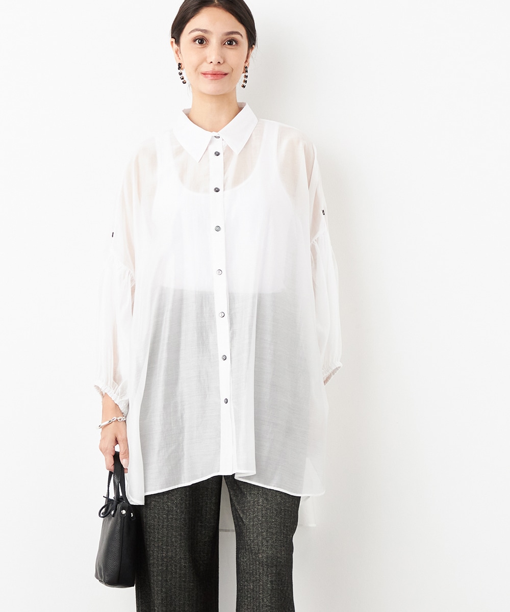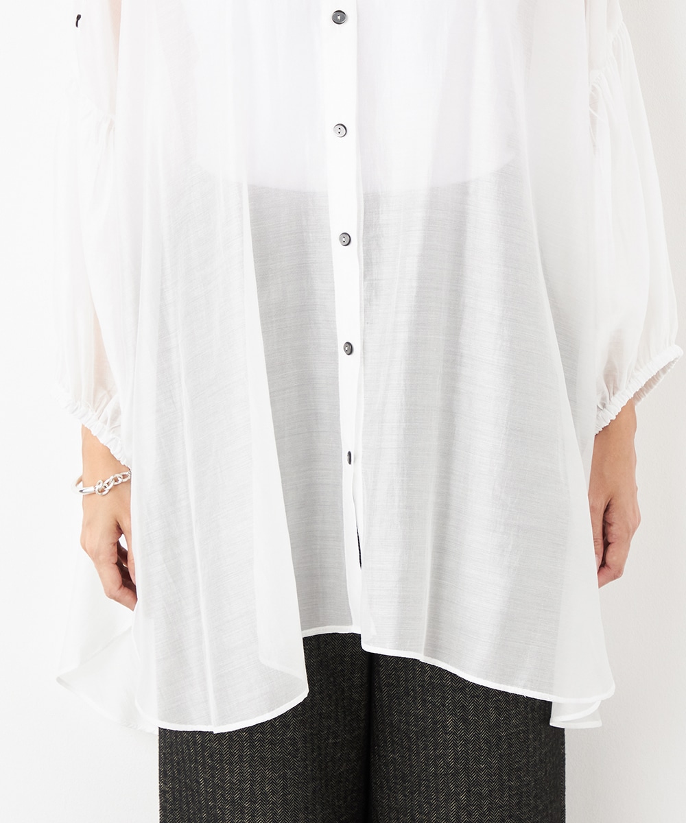 薄手で繊細な透け感があり、フェミニンな印象です。ドロップショルダーのゆったりとしたシルエットや袖のボリュームが今年らしさのポイント。袖口裏のベルトをボタンで留めるアレンジも楽しめます。寒い時季にはインにタートルトップスを合わせても素敵です。トレンドのイエローは差し色としても活躍します。