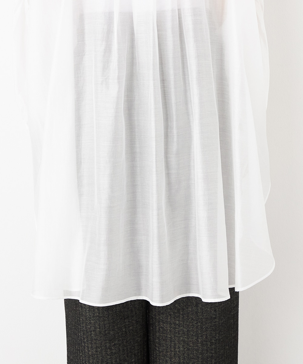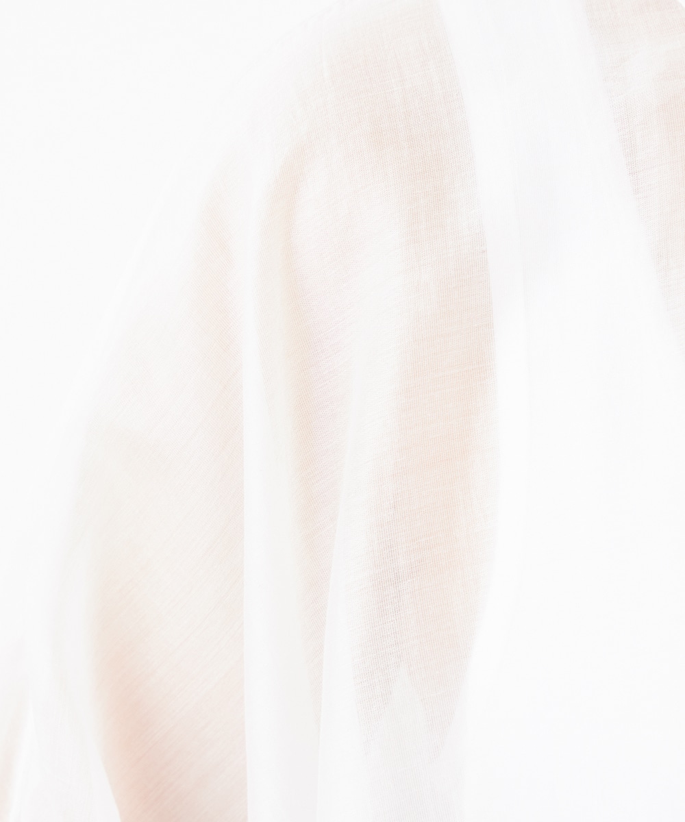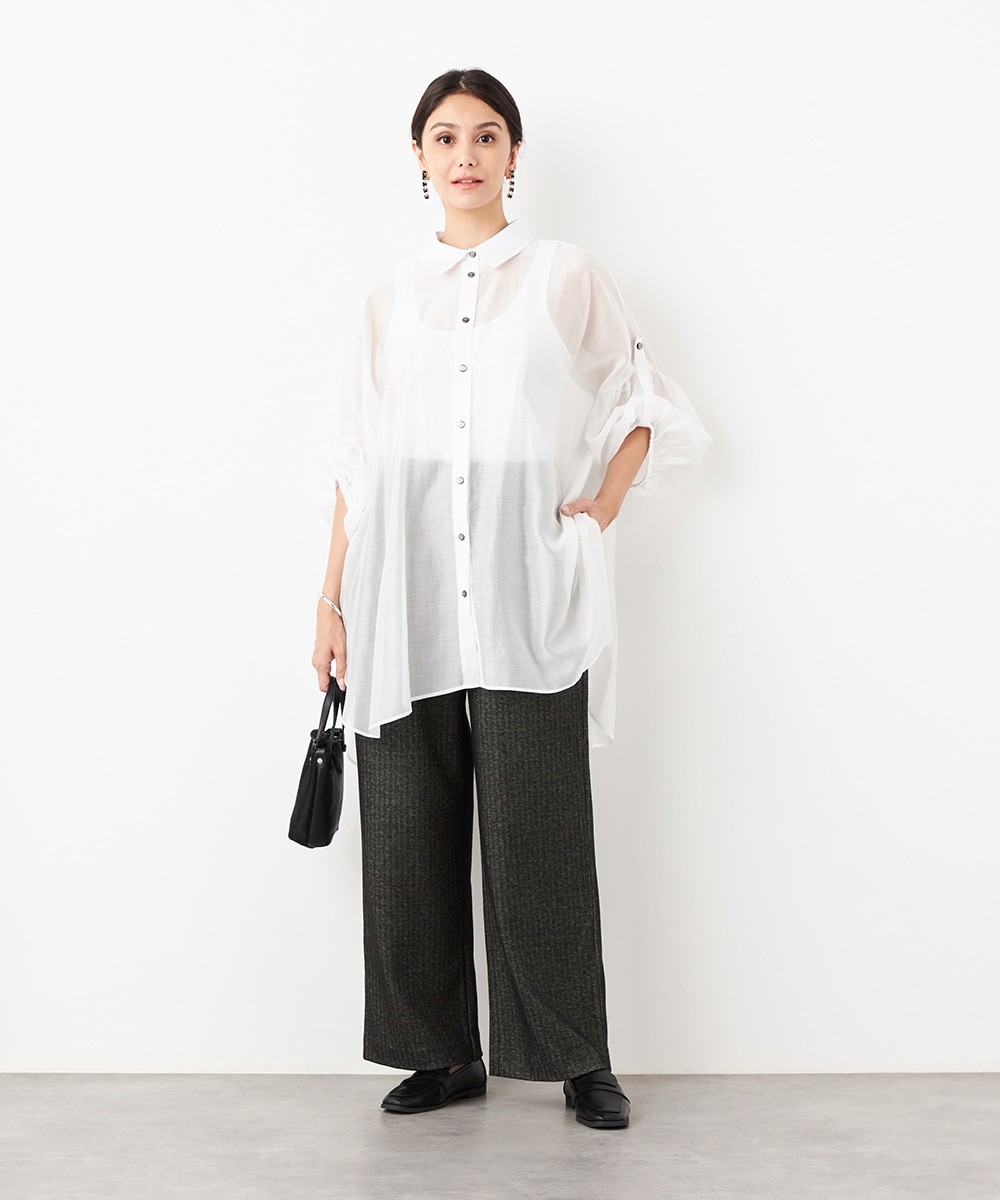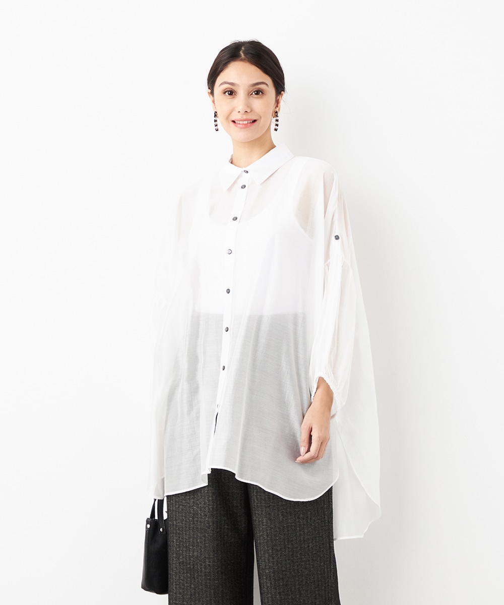 薄手で繊細な透け感があり、フェミニンな印象です。ドロップショルダーのゆったりとしたシルエットや袖のボリュームが今年らしさのポイント。袖口裏のベルトをボタンで留めるアレンジも楽しめます。寒い時季にはインにタートルトップスを合わせても素敵です。トレンドのイエローは差し色としても活躍します。