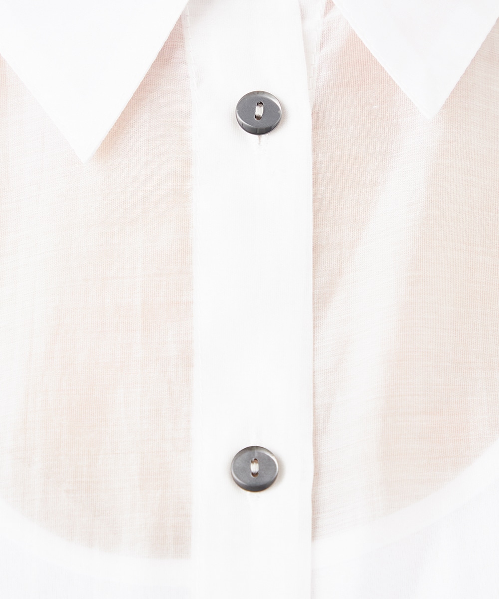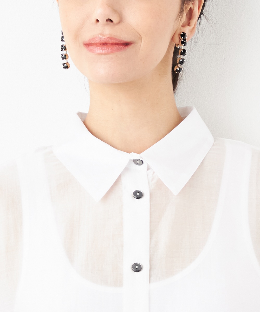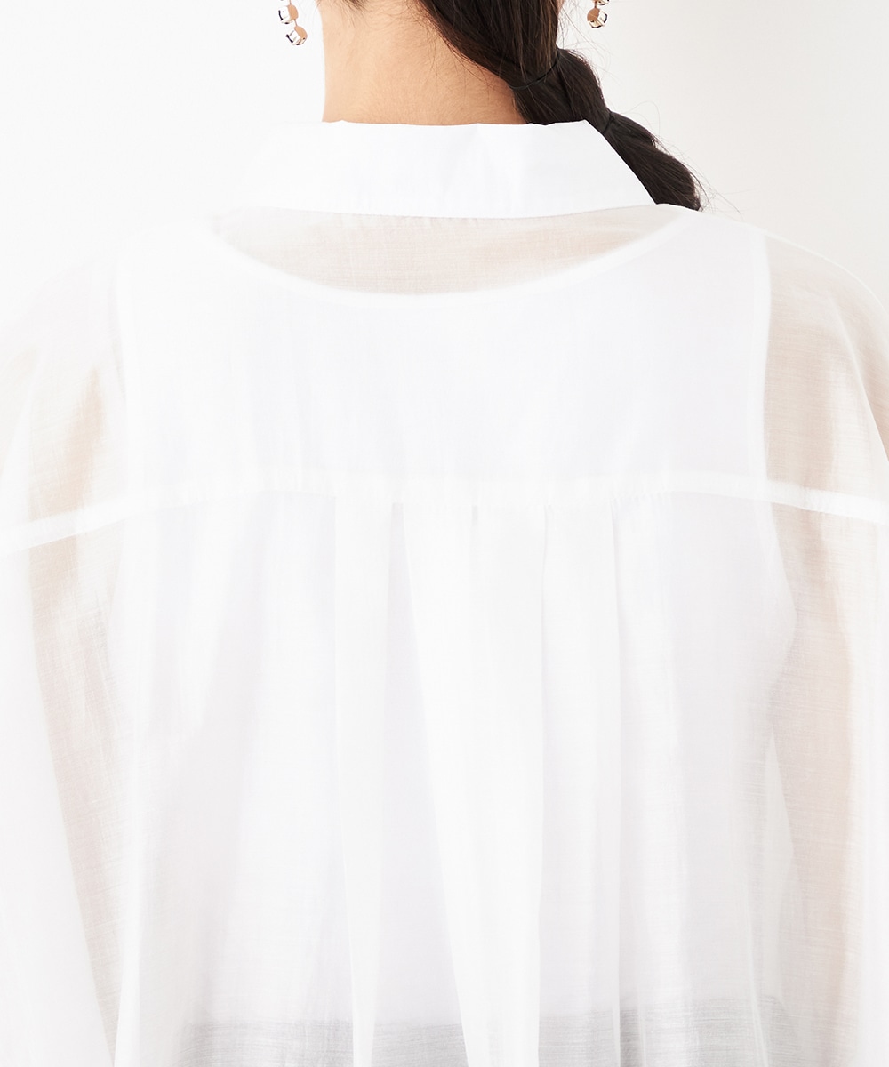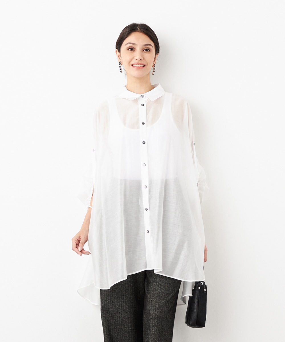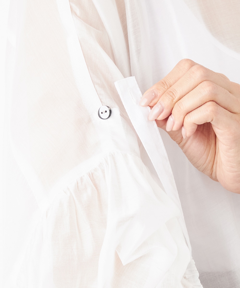 薄手で繊細な透け感があり、フェミニンな印象です。ドロップショルダーのゆったりとしたシルエットや袖のボリュームが今年らしさのポイント。袖口裏のベルトをボタンで留めるアレンジも楽しめます。寒い時季にはインにタートルトップスを合わせても素敵です。トレンドのイエローは差し色としても活躍します。