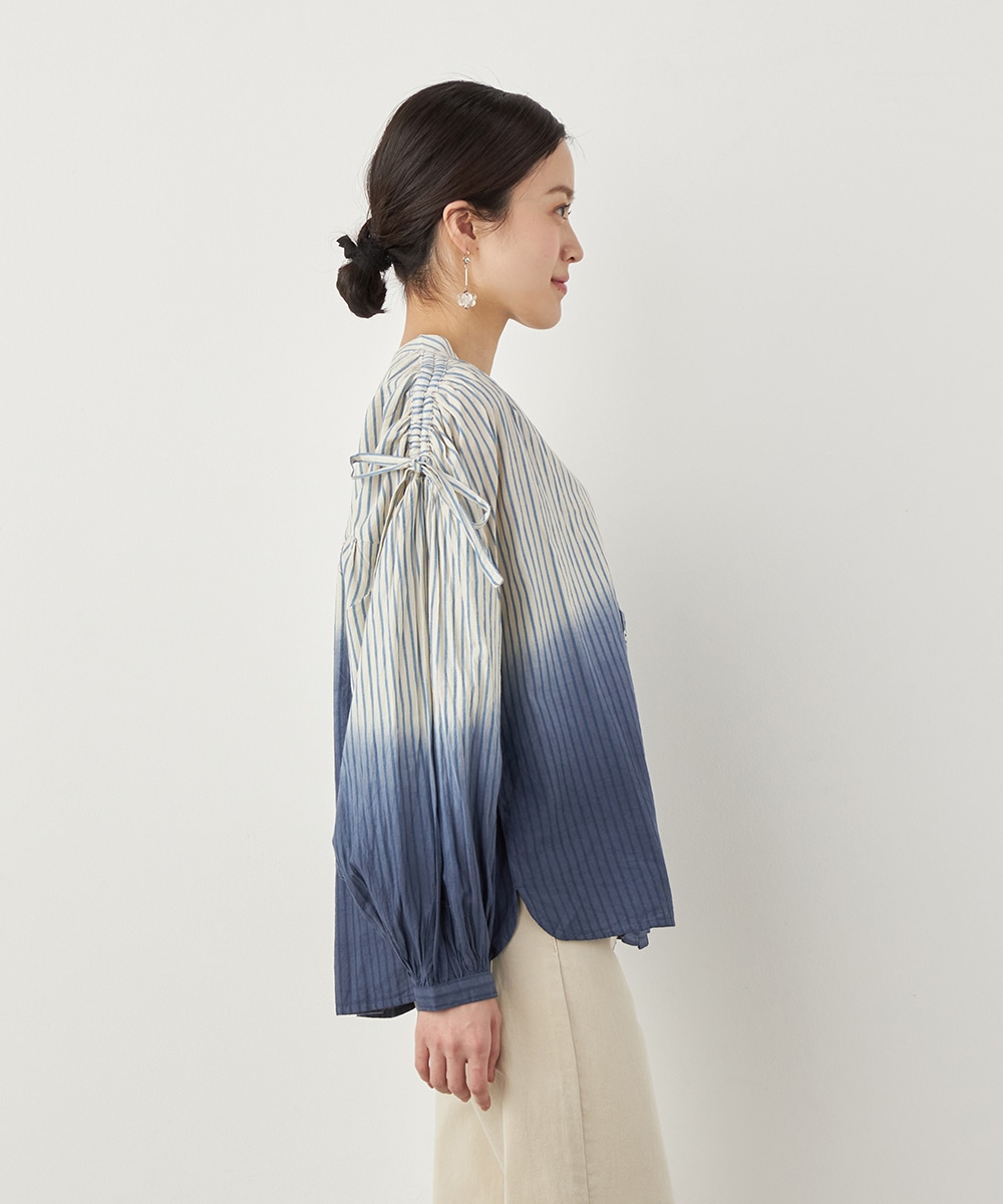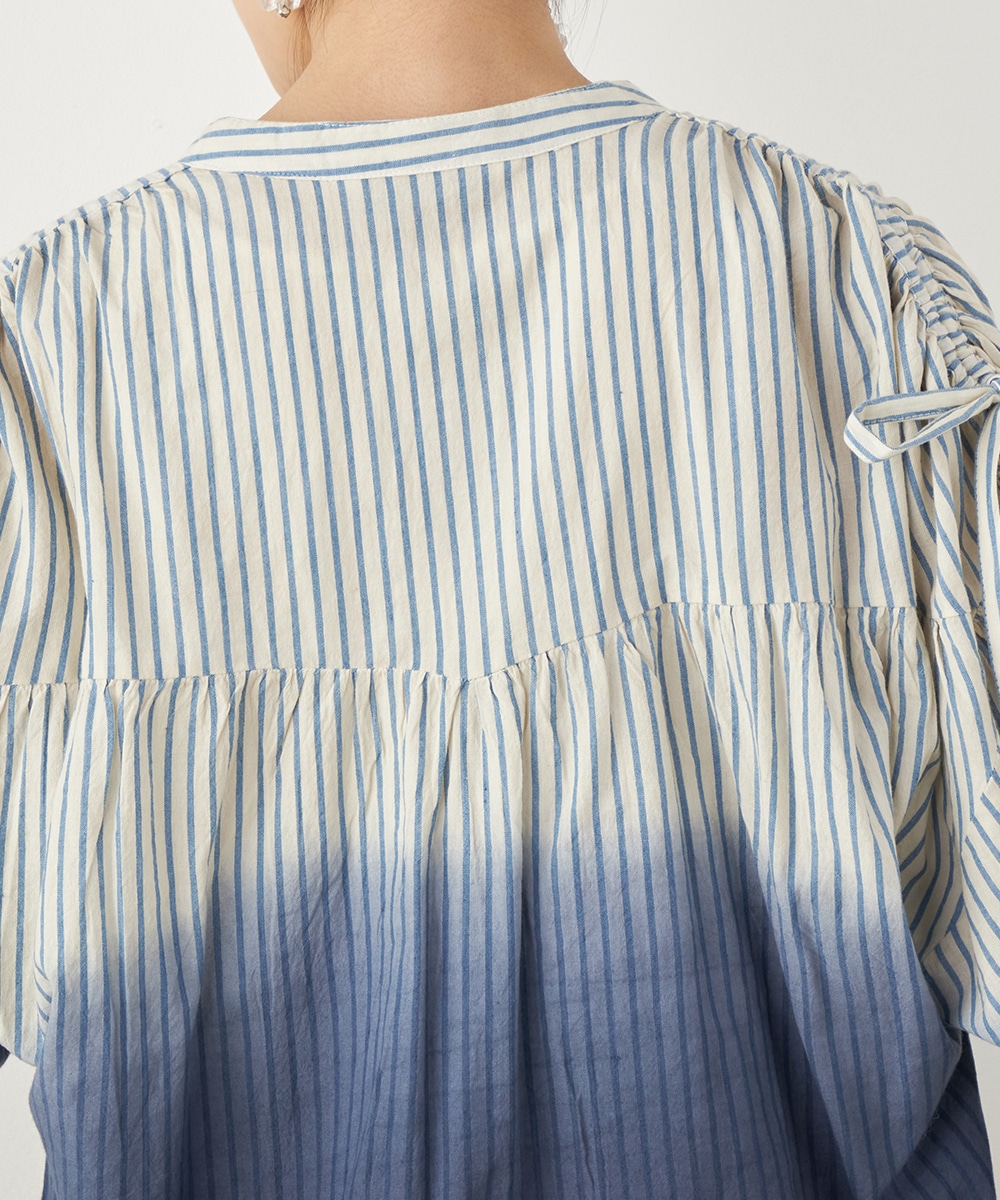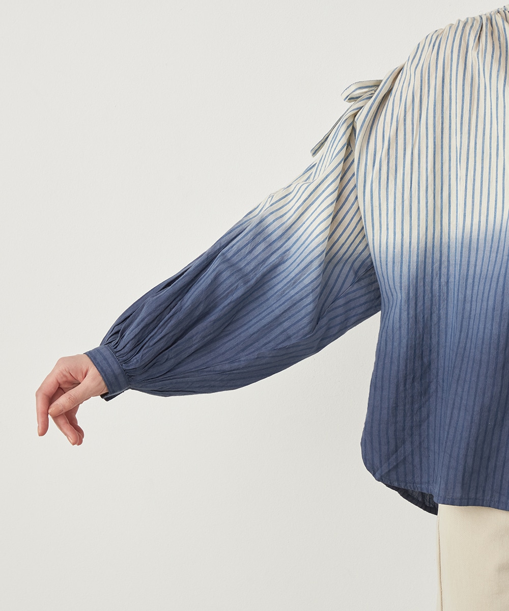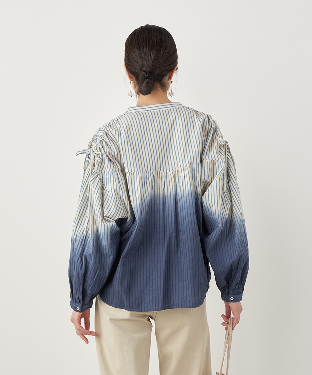 段染め調のグラデーションカラーが目を引きます。シルエットのボリュームやドロップショルダーのリラックス感がトレンドにマッチ。肩には同素材のリボンをあしらい、キュートなワンポイントをプラスしています。ギャザーのくしゅくしゅ感も印象的です。フェイスラインがすっきりと見える立ち襟を採用しています。