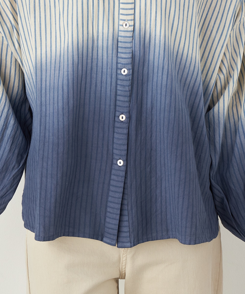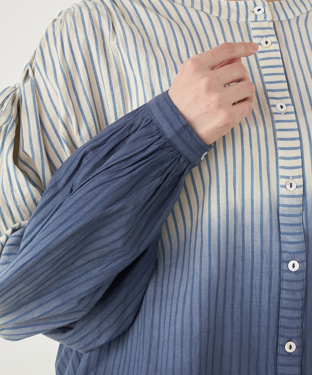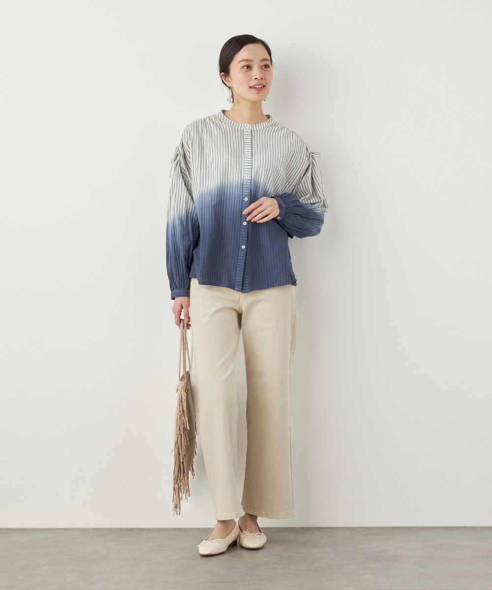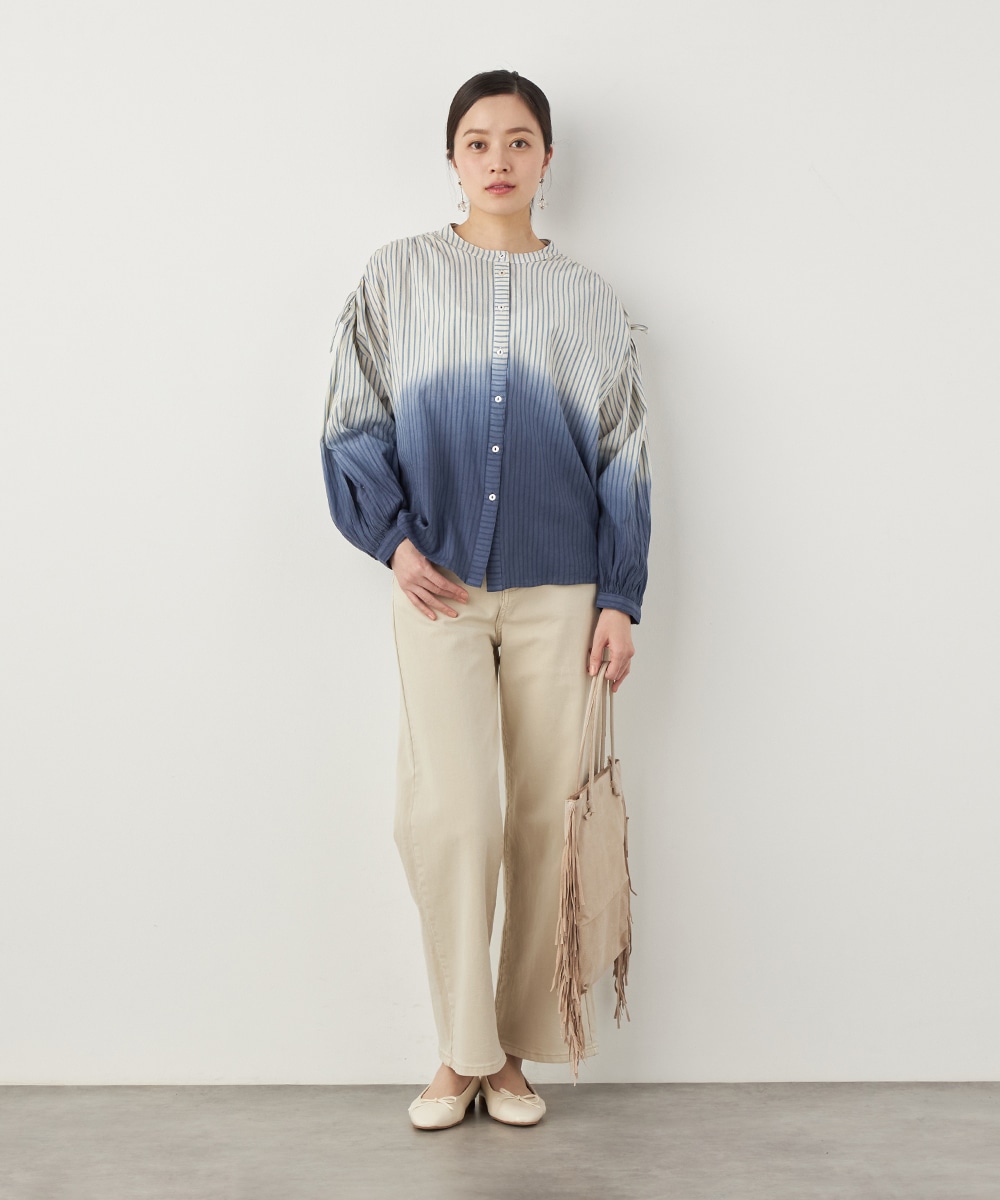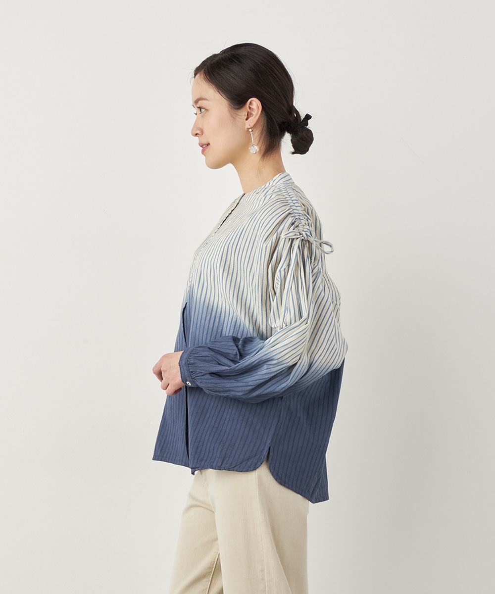 段染め調のグラデーションカラーが目を引きます。シルエットのボリュームやドロップショルダーのリラックス感がトレンドにマッチ。肩には同素材のリボンをあしらい、キュートなワンポイントをプラスしています。ギャザーのくしゅくしゅ感も印象的です。フェイスラインがすっきりと見える立ち襟を採用しています。