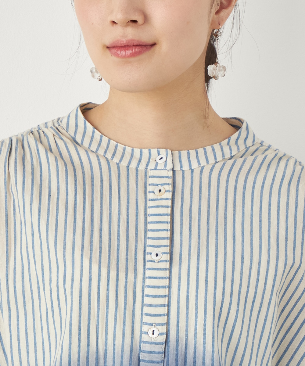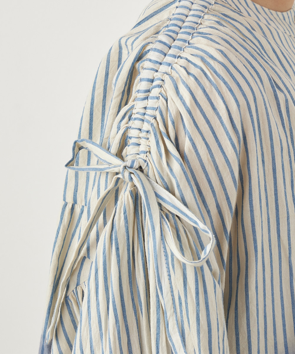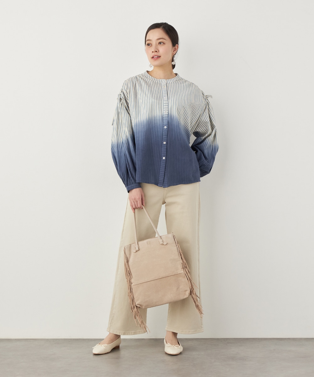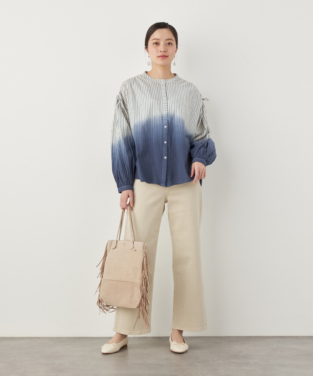 段染め調のグラデーションカラーが目を引きます。シルエットのボリュームやドロップショルダーのリラックス感がトレンドにマッチ。肩には同素材のリボンをあしらい、キュートなワンポイントをプラスしています。ギャザーのくしゅくしゅ感も印象的です。フェイスラインがすっきりと見える立ち襟を採用しています。