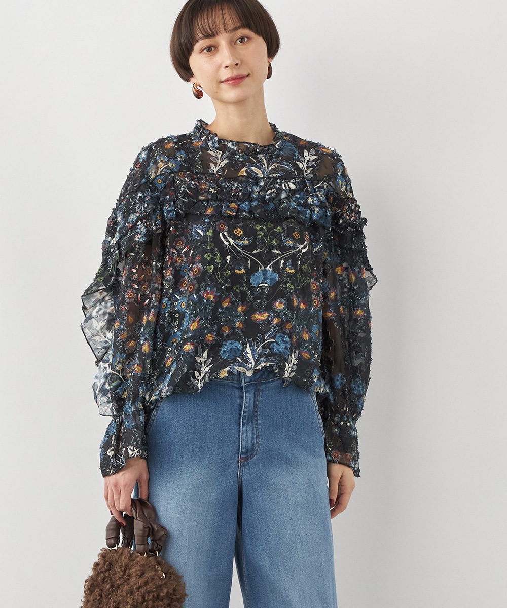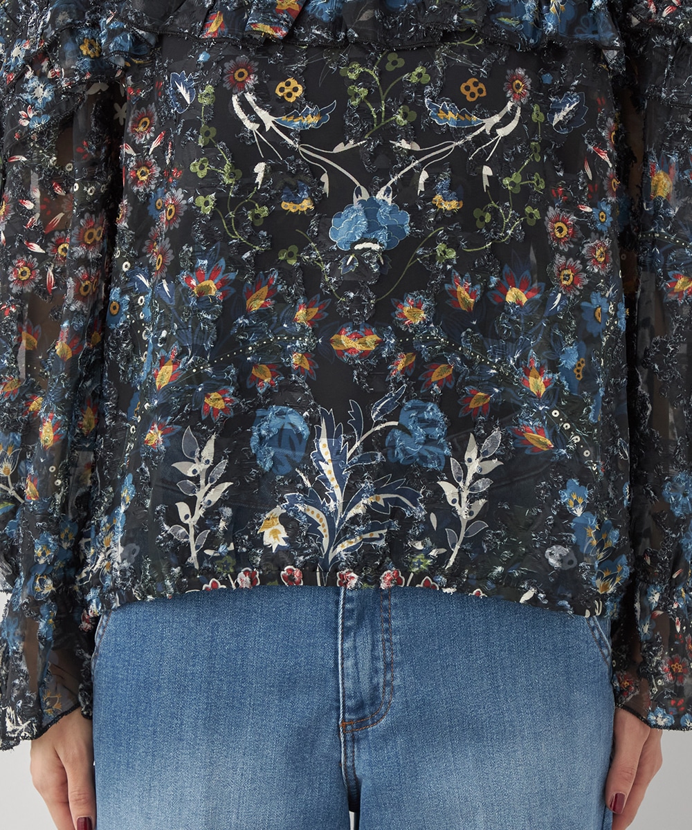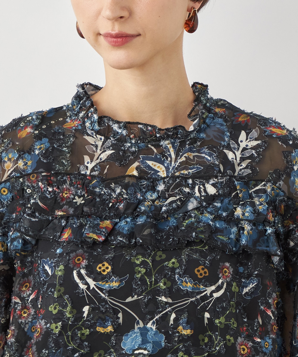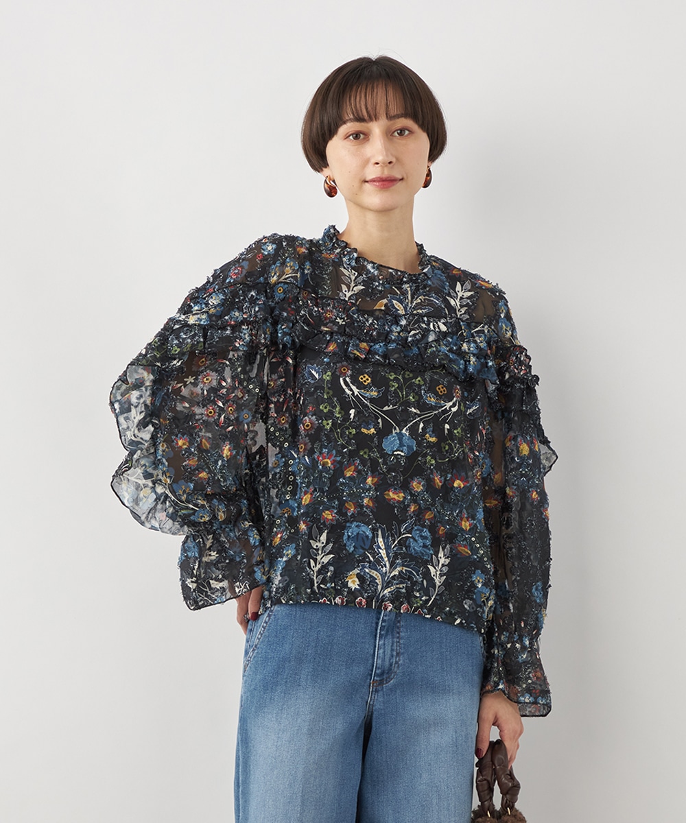 ブラックのベースにカラフルな柄が映え、コーディネートが明るく華やかに仕上がります。凹凸のある表情豊かな表面感も魅力です。生地は薄手で繊細な透け感が見られ、ボリューム十分のフリルも重い印象になりません。シルエットは適度なゆとりで動きやすく、普段のカジュアルにもぴったりです。