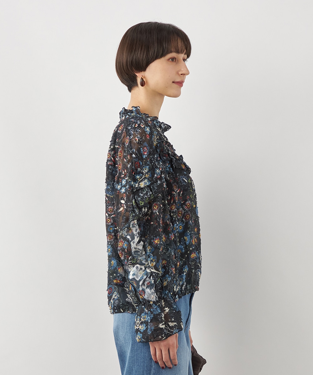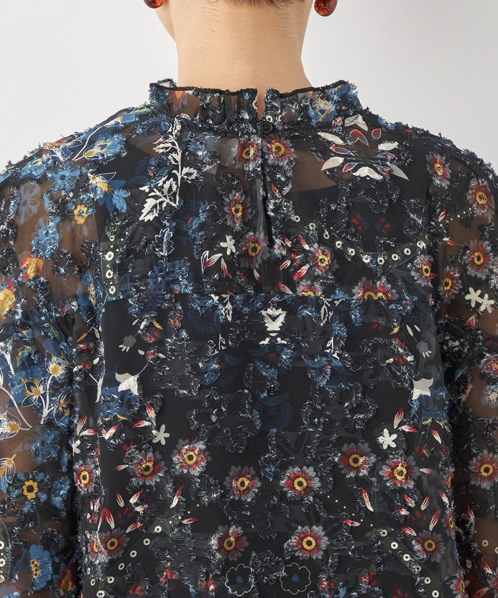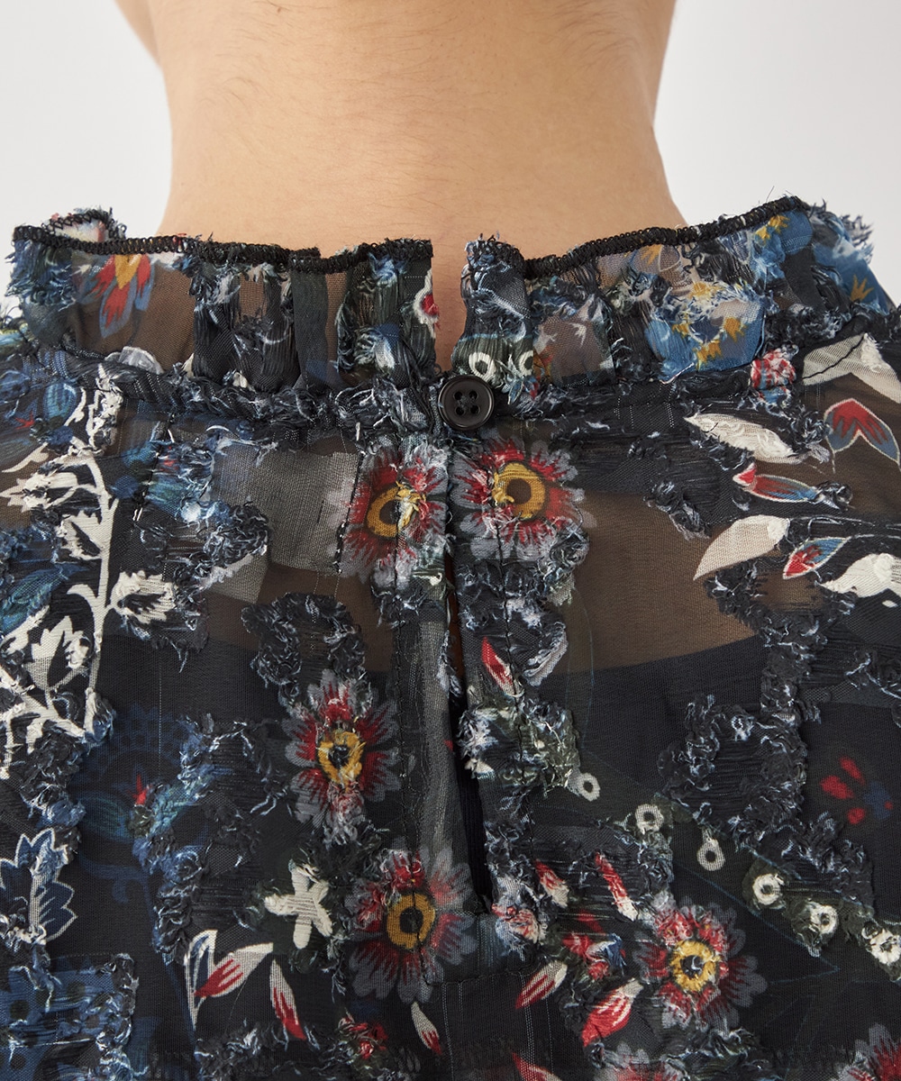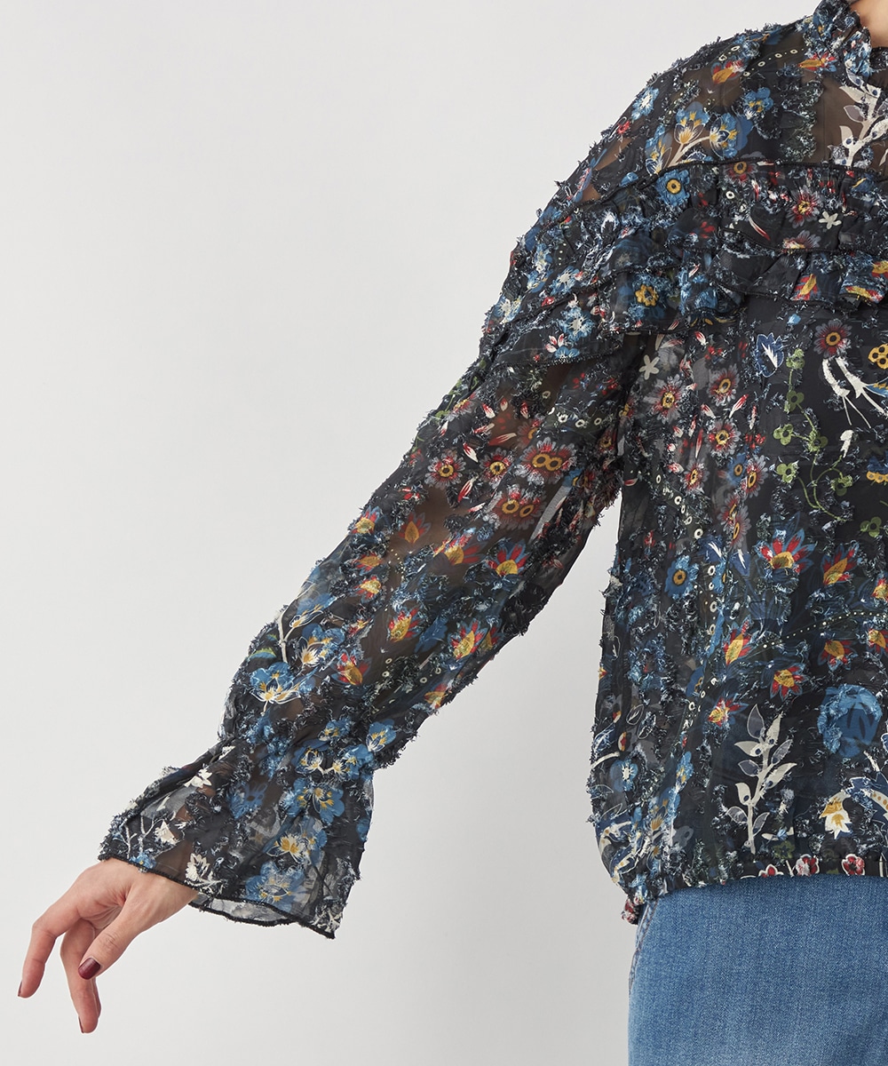 ブラックのベースにカラフルな柄が映え、コーディネートが明るく華やかに仕上がります。凹凸のある表情豊かな表面感も魅力です。生地は薄手で繊細な透け感が見られ、ボリューム十分のフリルも重い印象になりません。シルエットは適度なゆとりで動きやすく、普段のカジュアルにもぴったりです。