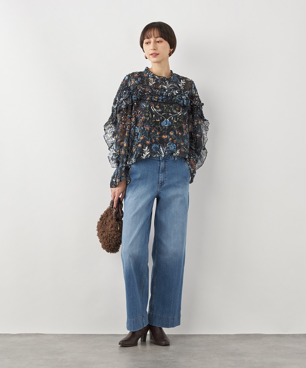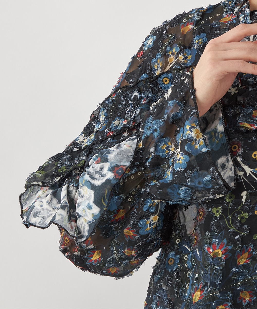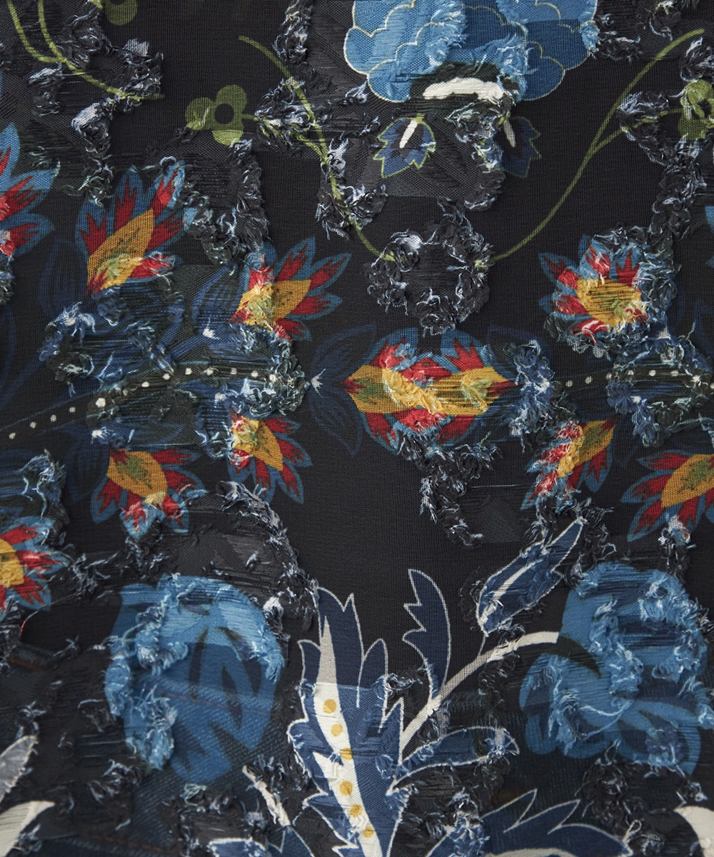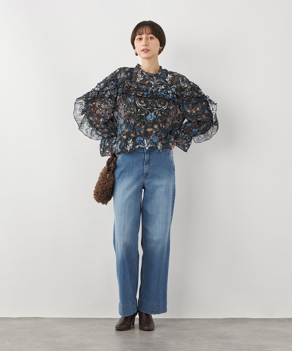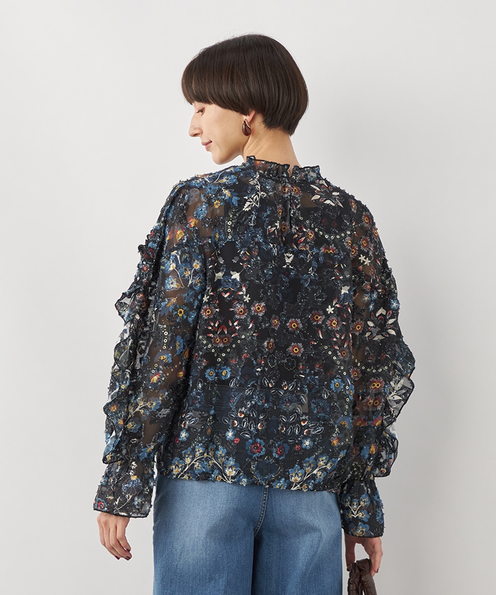ブラックのベースにカラフルな柄が映え、コーディネートが明るく華やかに仕上がります。凹凸のある表情豊かな表面感も魅力です。生地は薄手で繊細な透け感が見られ、ボリューム十分のフリルも重い印象になりません。シルエットは適度なゆとりで動きやすく、普段のカジュアルにもぴったりです。