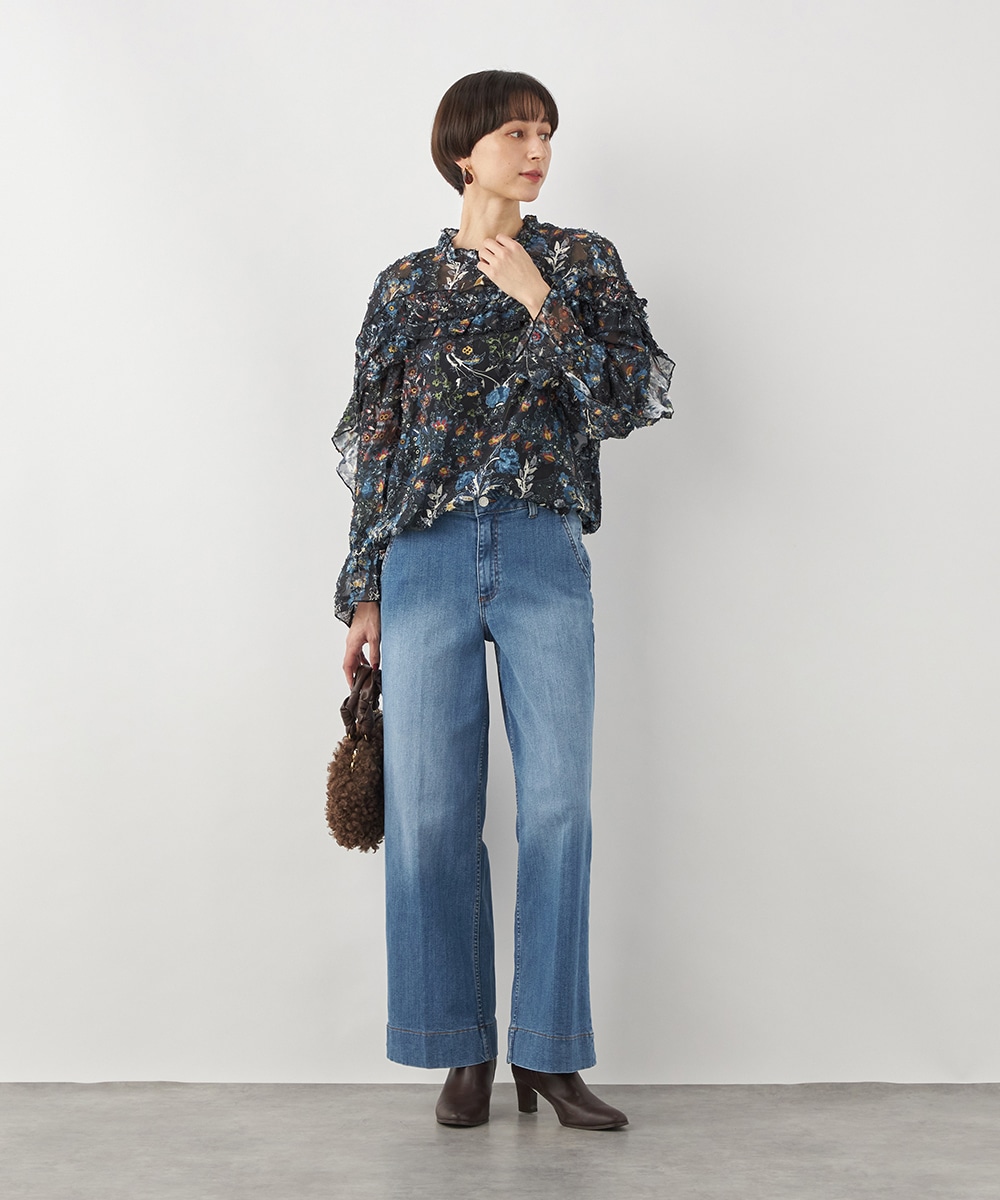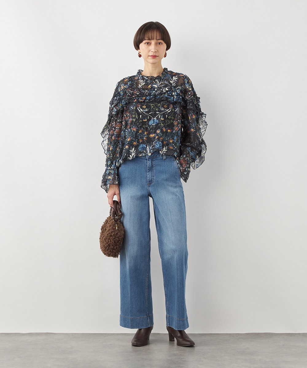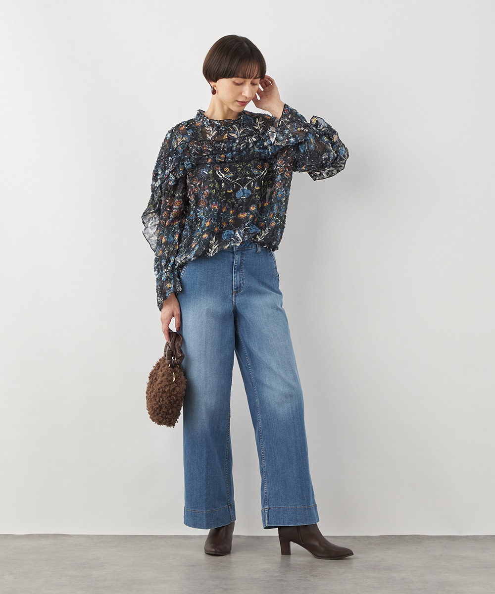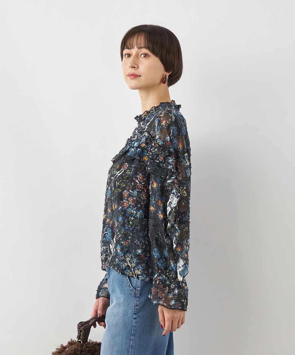 ブラックのベースにカラフルな柄が映え、コーディネートが明るく華やかに仕上がります。凹凸のある表情豊かな表面感も魅力です。生地は薄手で繊細な透け感が見られ、ボリューム十分のフリルも重い印象になりません。シルエットは適度なゆとりで動きやすく、普段のカジュアルにもぴったりです。
