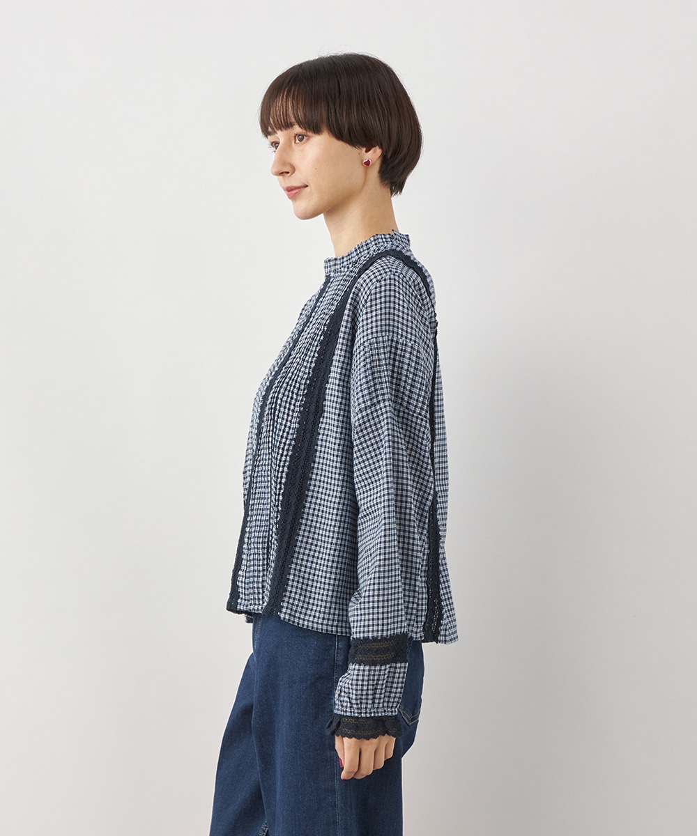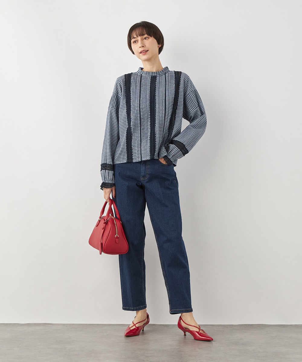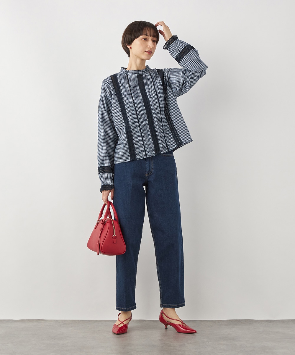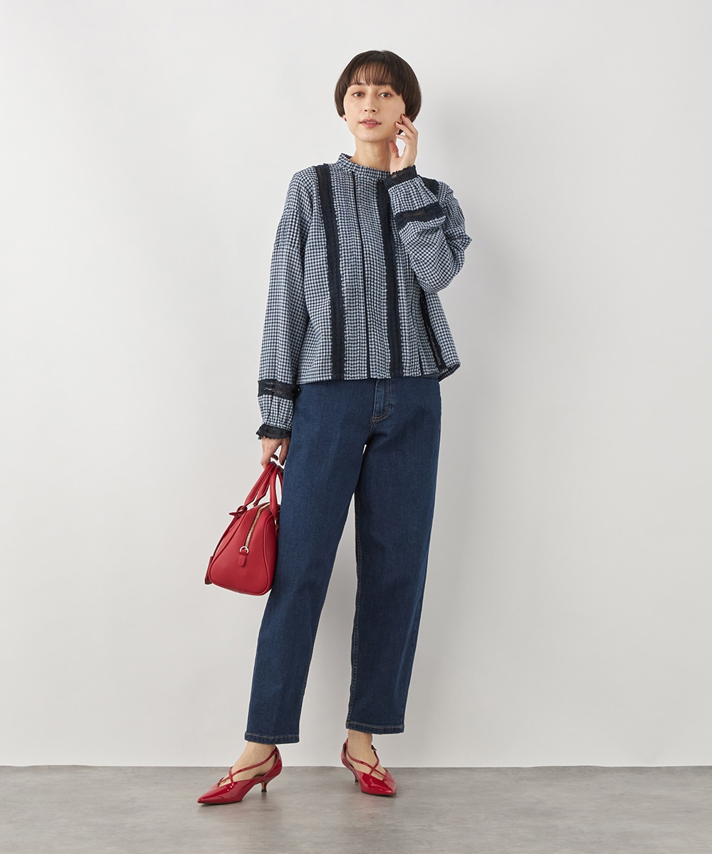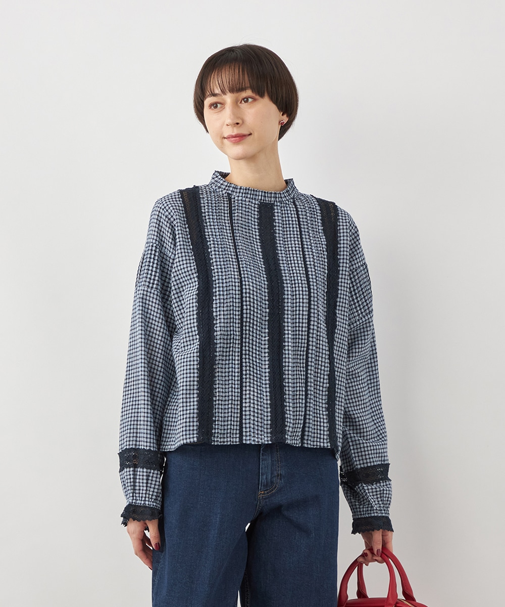 身頃と袖の細かなタックや襟元のフリルなど、こだわりのディテールを取り入れています。シルエットは適度なゆとりがあり、動きやすくて普段のカジュアルにぴったりです。着丈は長すぎず、すっきりと着こなせます。パンツともスカートとも合わせやすく、アレンジ力の高さも魅力です。