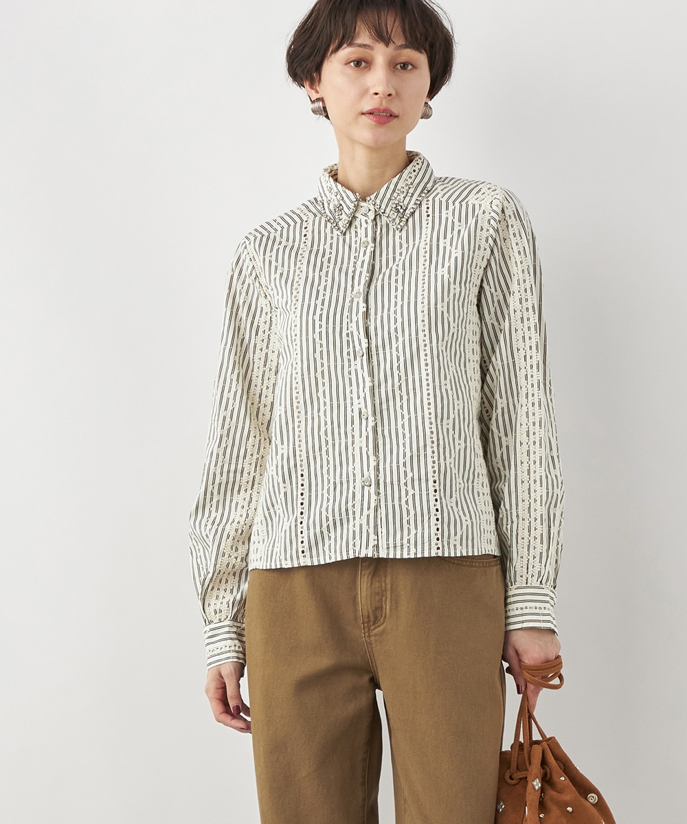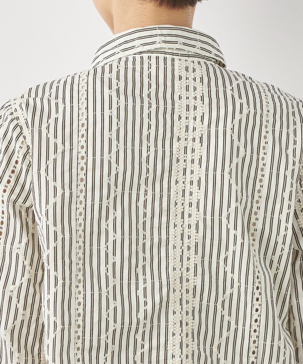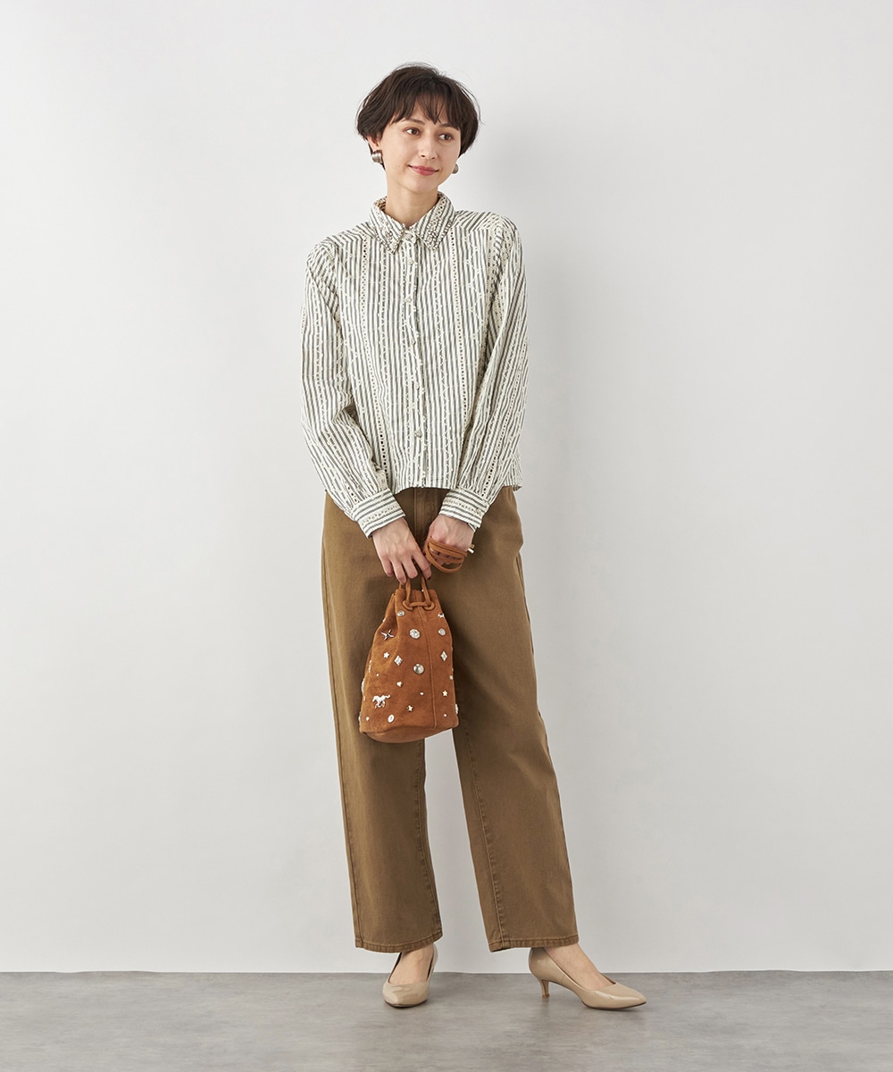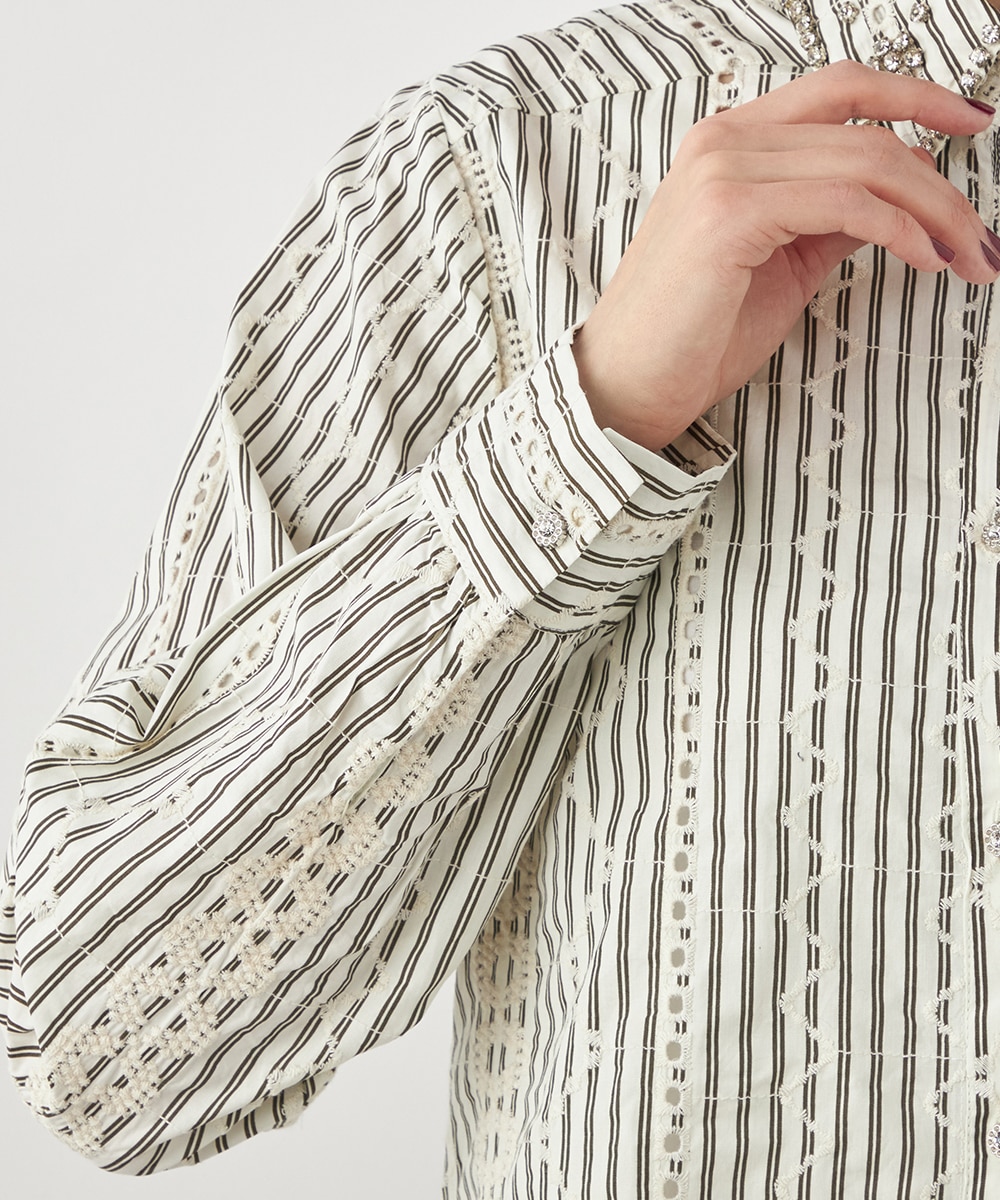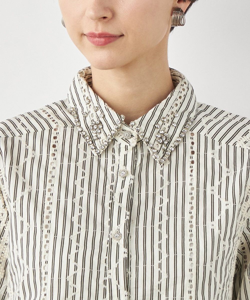 配色には清潔感があり、上品に着こなせます。たっぷりの刺繍とビジューで華やかな雰囲気に仕上げました。きれいな光沢が襟元に加わることで顔映りが良くなるのもポイントです。シルエットは適度なゆとりながらもすっきり。ニットトップスなどとのレイヤードコーディネートもおすすめです。
