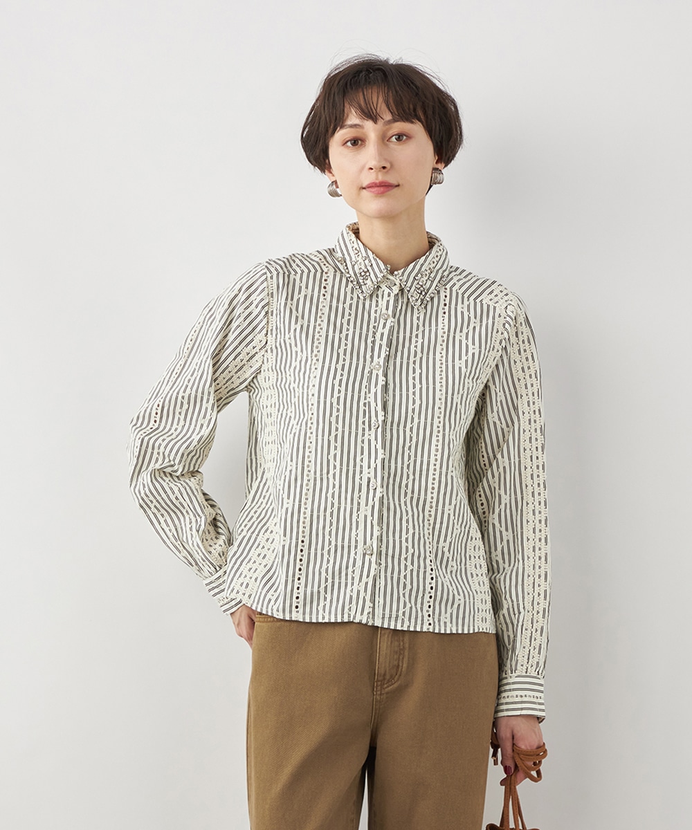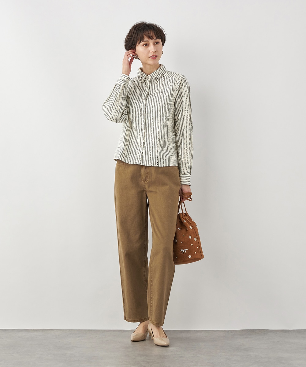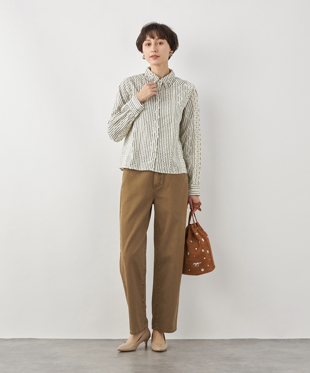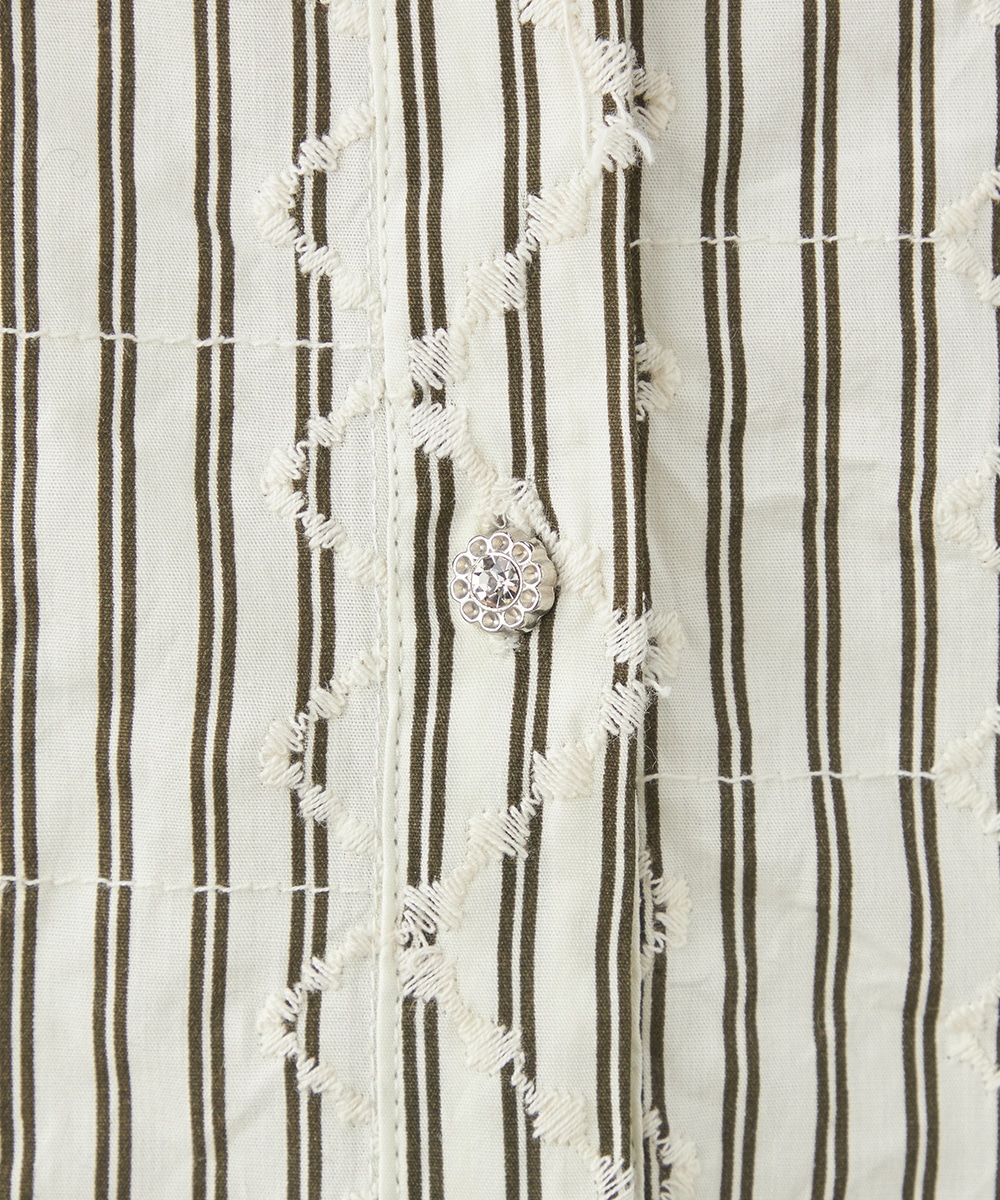 配色には清潔感があり、上品に着こなせます。たっぷりの刺繍とビジューで華やかな雰囲気に仕上げました。きれいな光沢が襟元に加わることで顔映りが良くなるのもポイントです。シルエットは適度なゆとりながらもすっきり。ニットトップスなどとのレイヤードコーディネートもおすすめです。