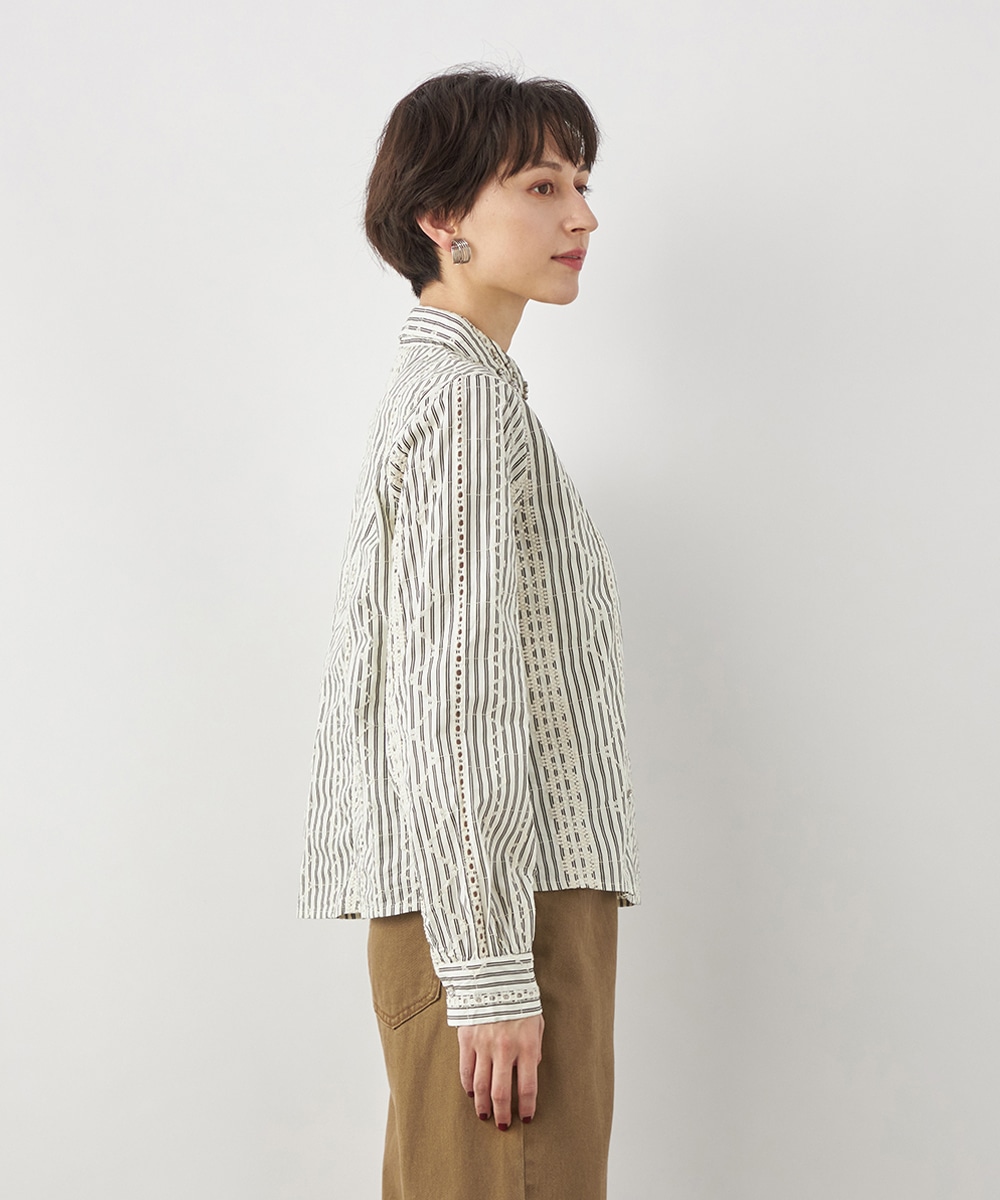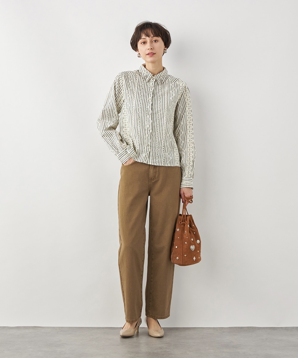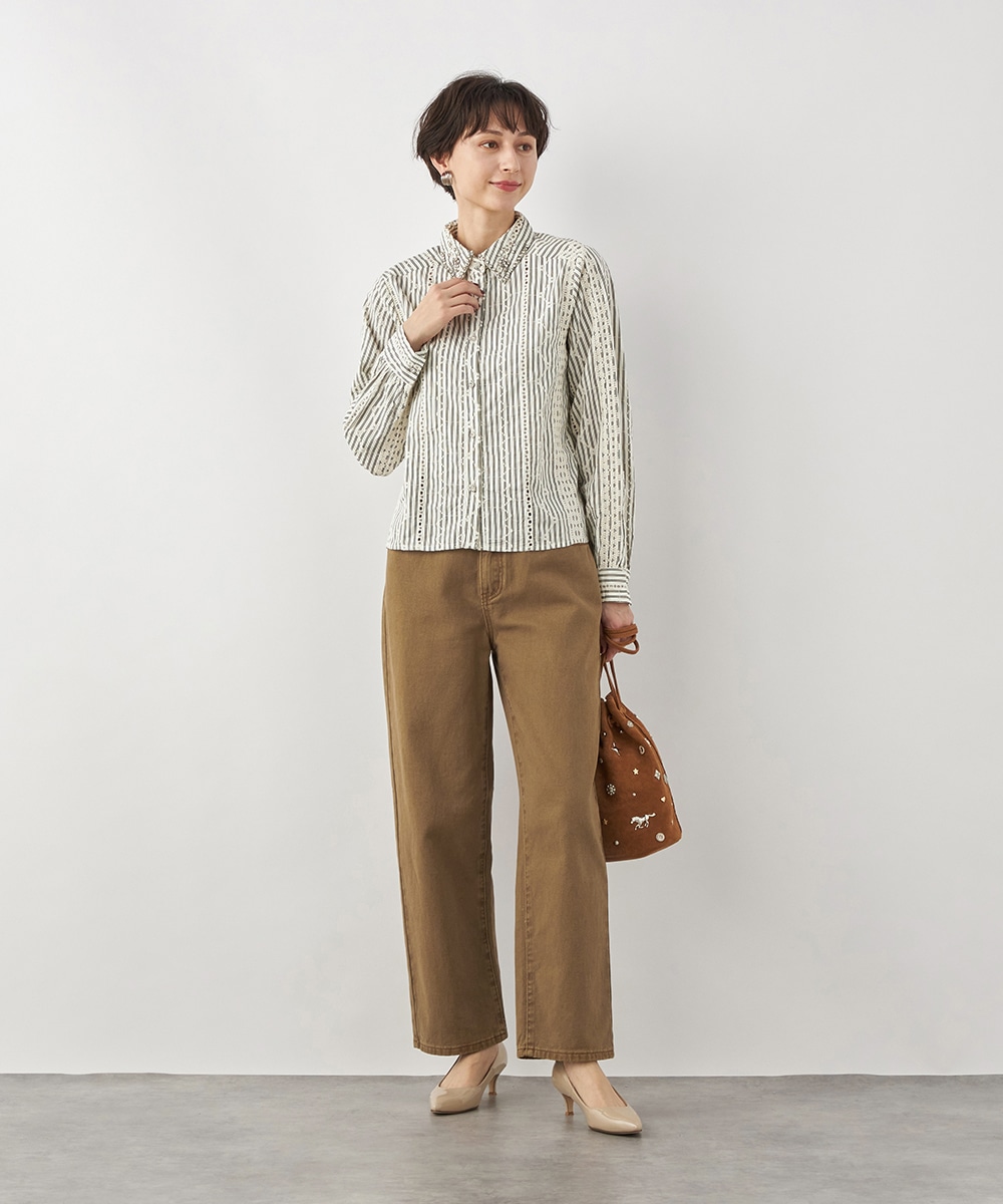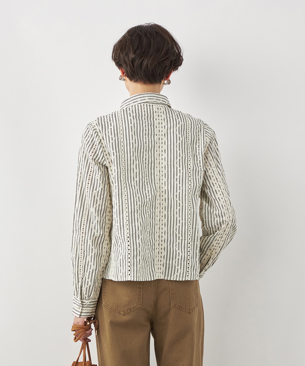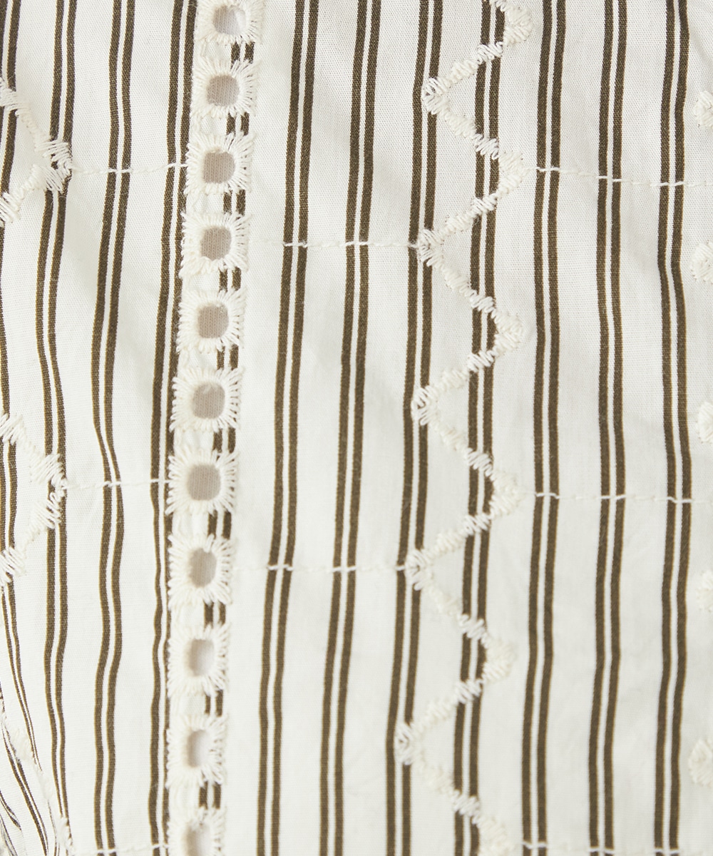 配色には清潔感があり、上品に着こなせます。たっぷりの刺繍とビジューで華やかな雰囲気に仕上げました。きれいな光沢が襟元に加わることで顔映りが良くなるのもポイントです。シルエットは適度なゆとりながらもすっきり。ニットトップスなどとのレイヤードコーディネートもおすすめです。