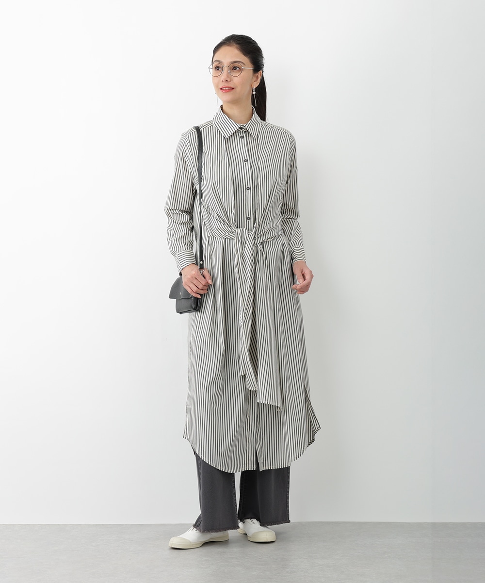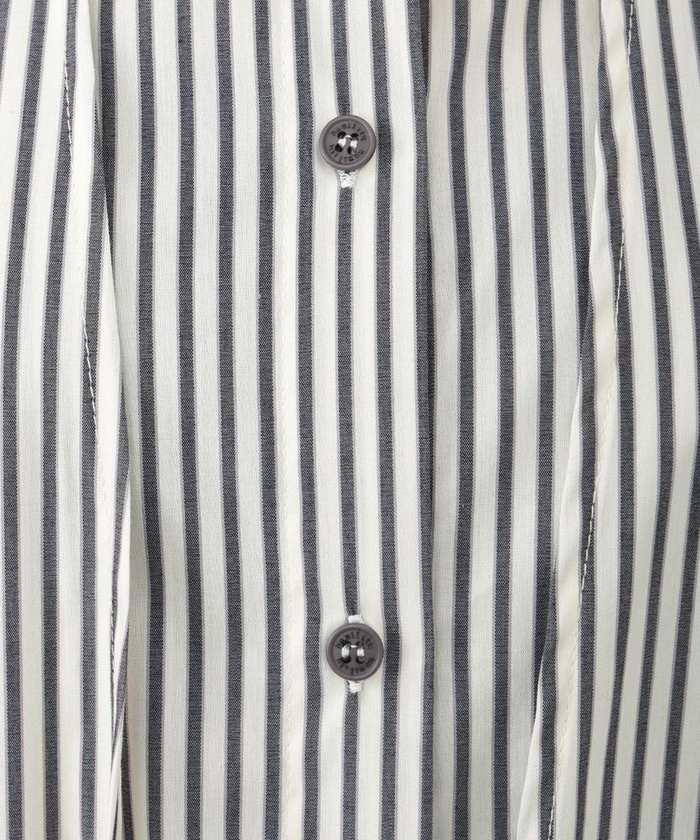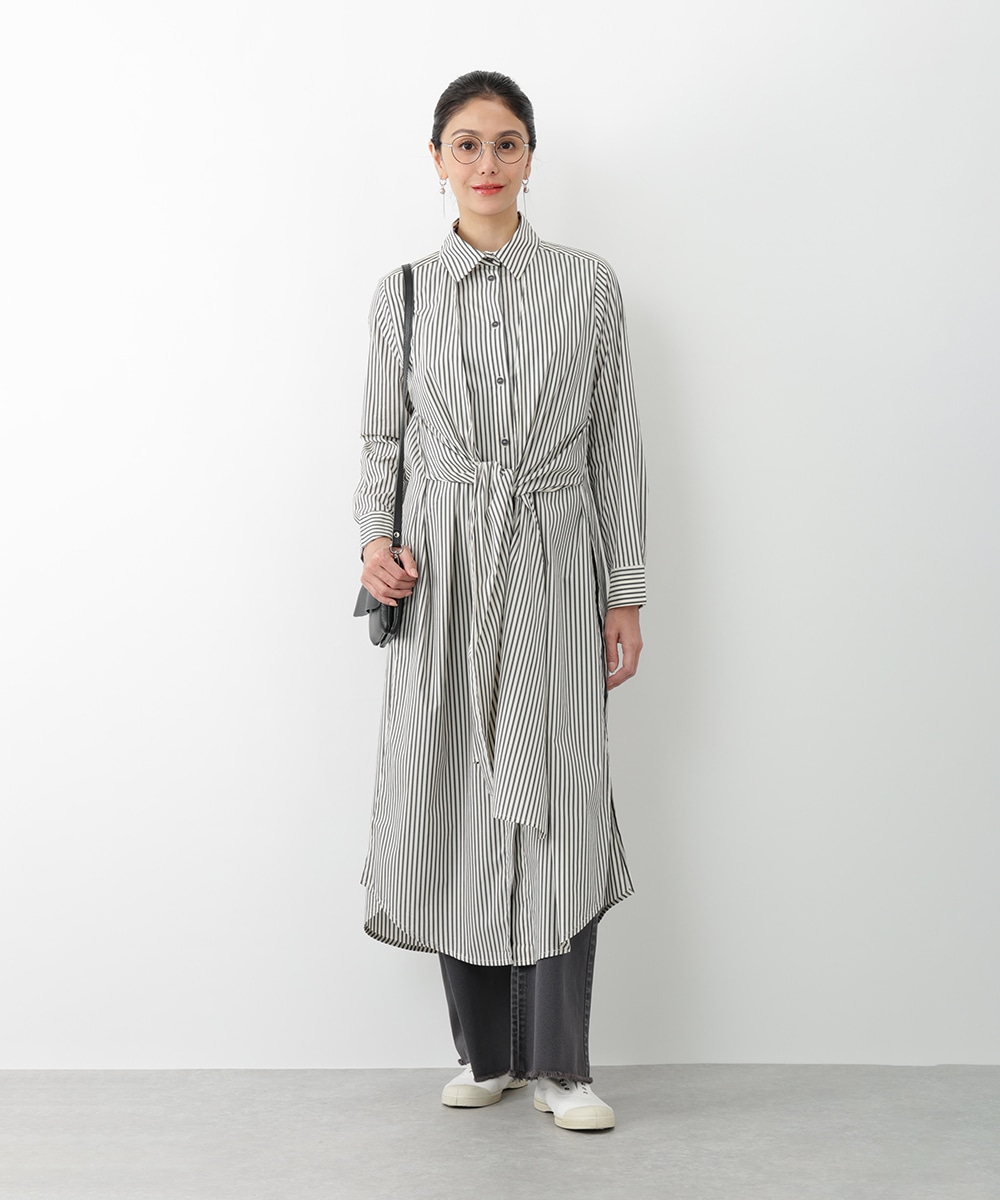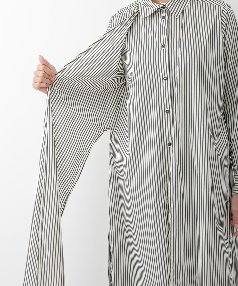 爽やかなムードを演出するストライプ柄のロングシャツ。2枚重なったようなリボンデザインになっており、結んだり垂らしたりとアレンジを楽しめます。サイドに施された大胆なスリットが抜け感をプラス。フロントボタンをアレンジして着用するスタイリングもおすすめです。