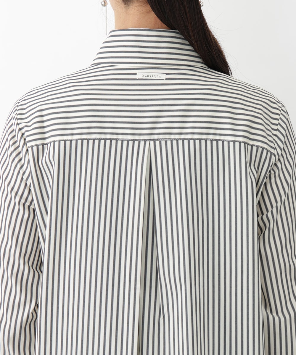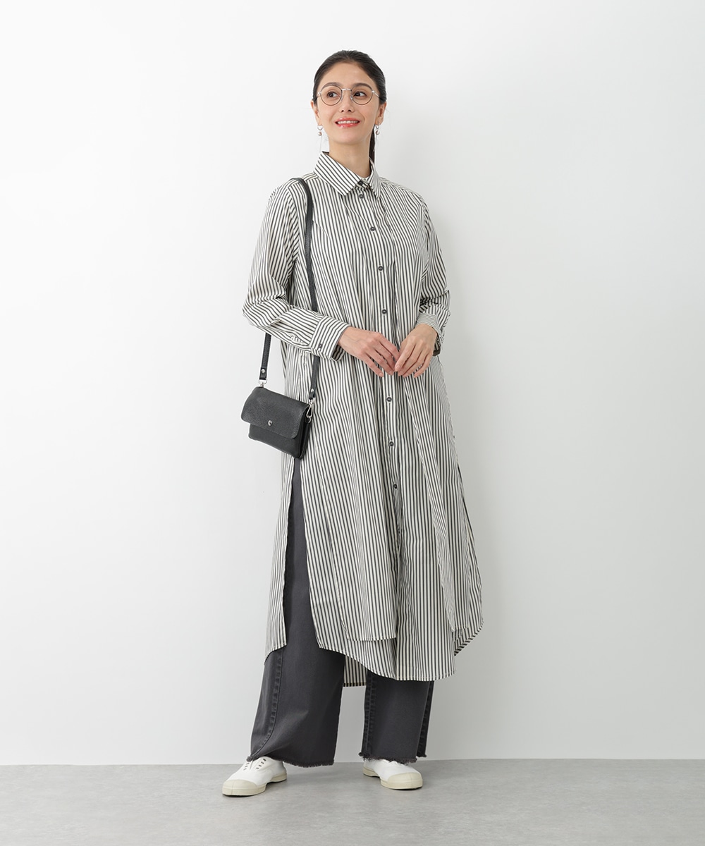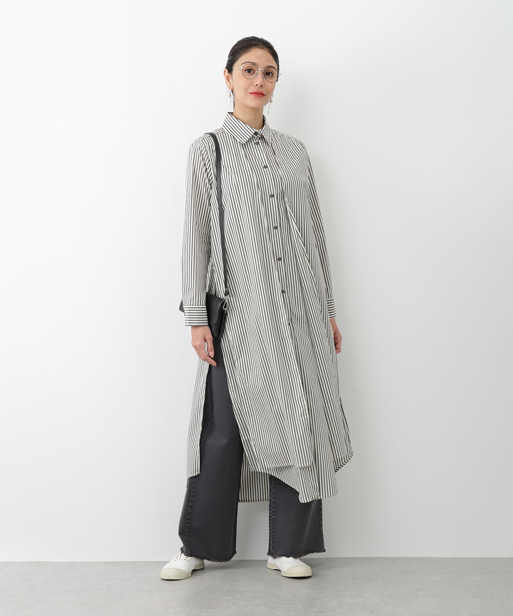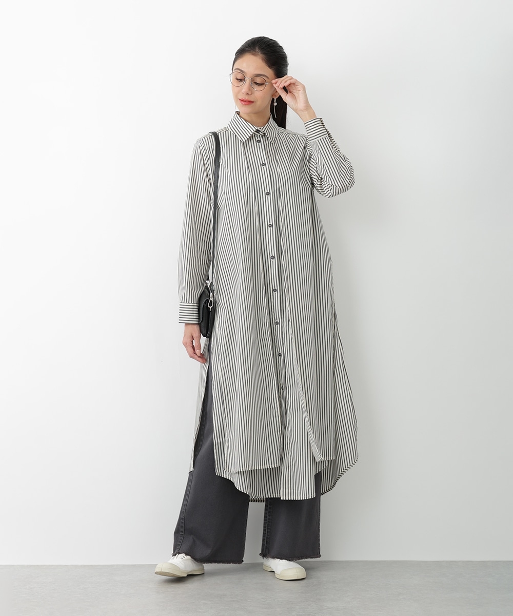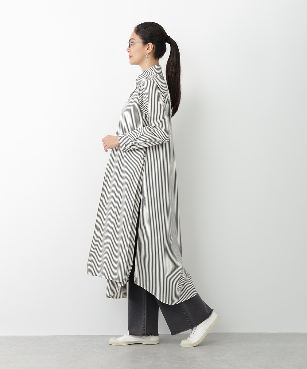 爽やかなムードを演出するストライプ柄のロングシャツ。2枚重なったようなリボンデザインになっており、結んだり垂らしたりとアレンジを楽しめます。サイドに施された大胆なスリットが抜け感をプラス。フロントボタンをアレンジして着用するスタイリングもおすすめです。