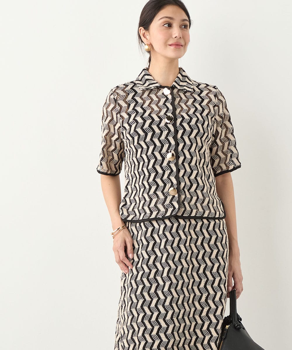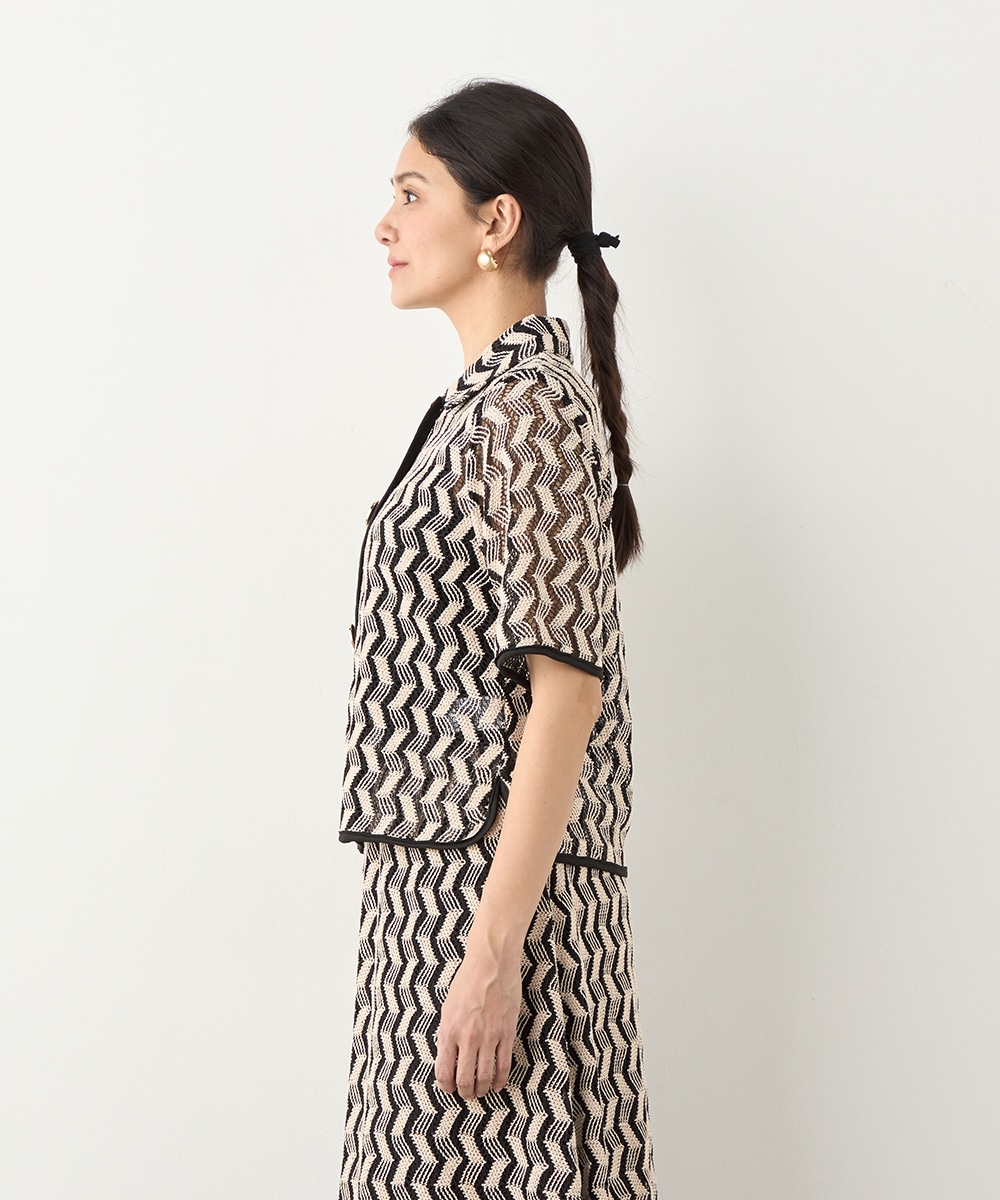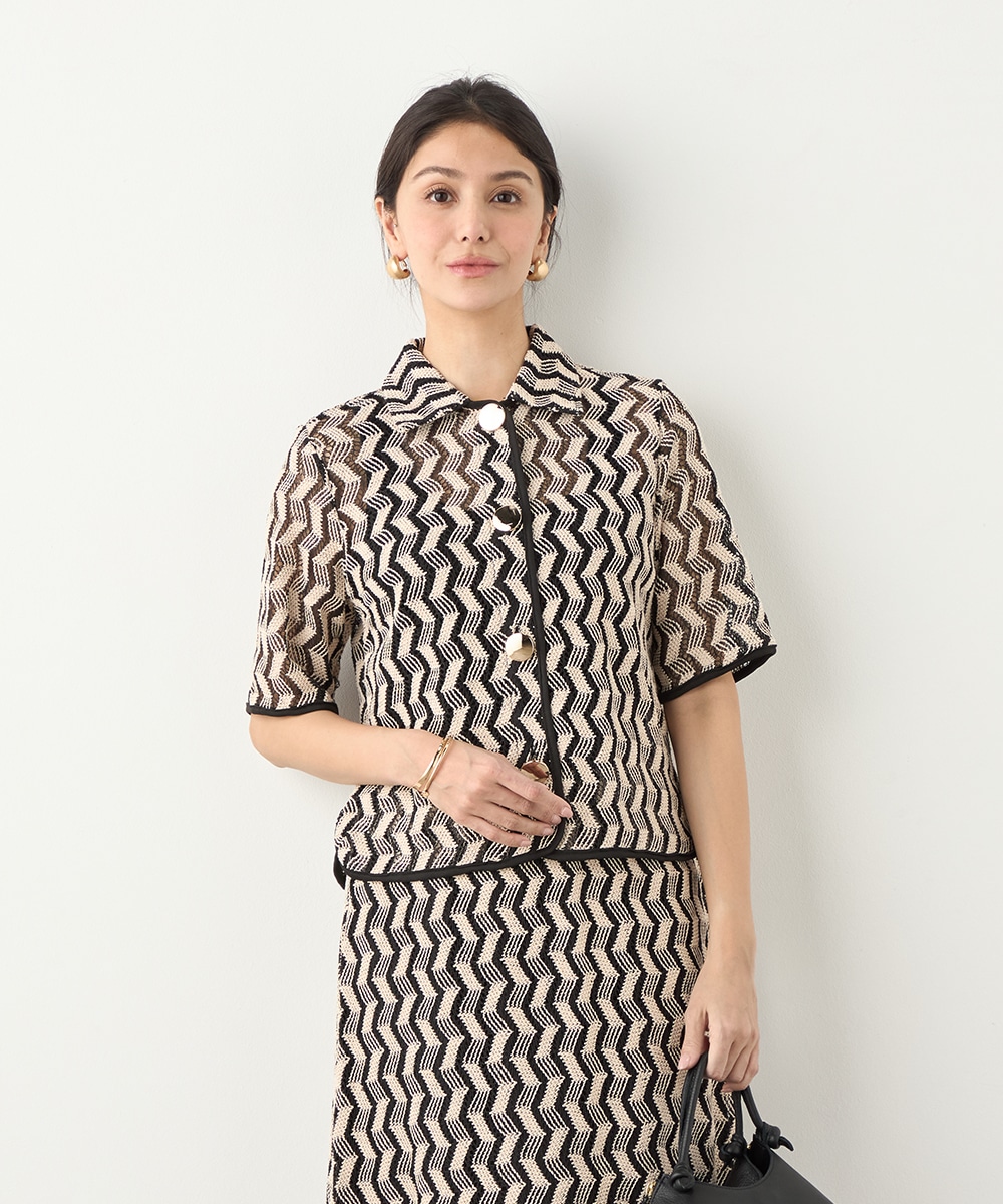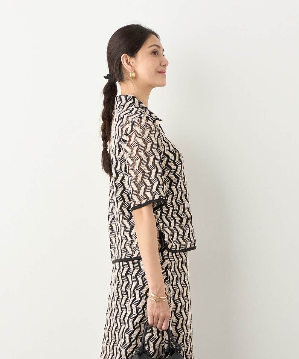 フロントに並ぶ大きなメタルボタンがアクセントとして効いています。五分袖のデザインと少し短めの着丈で軽やかな印象に着こなせます。一枚着としてはもちろん、羽織として取り入れても素敵です。セットアップコーディネートを楽しめる、同素材のスカートもございます。