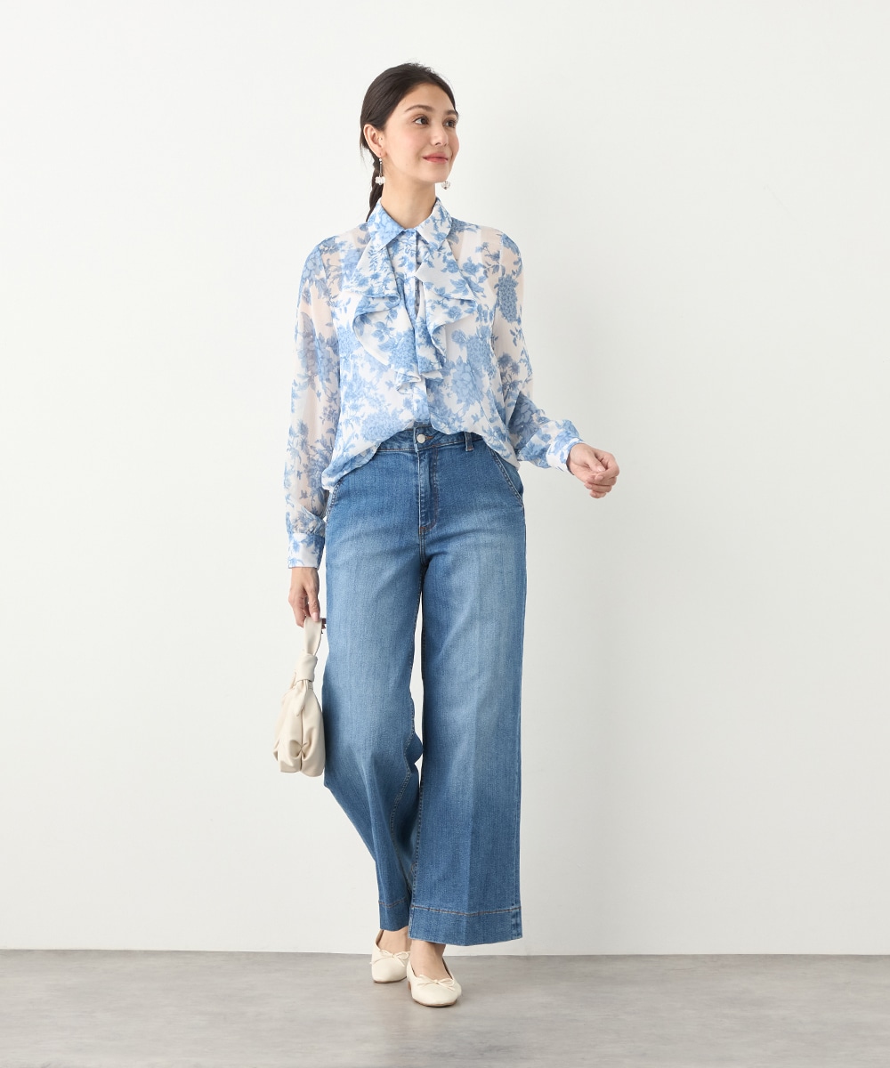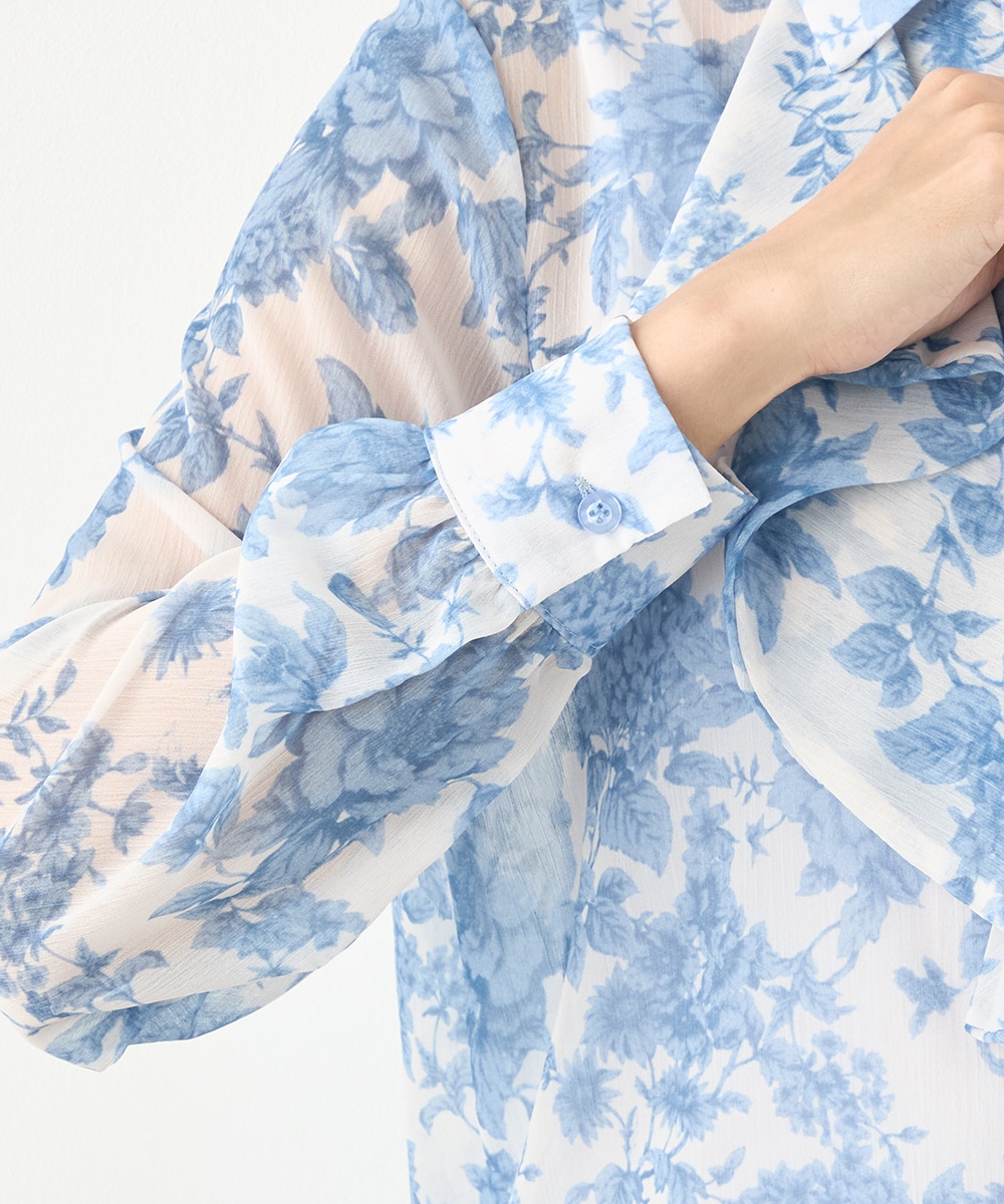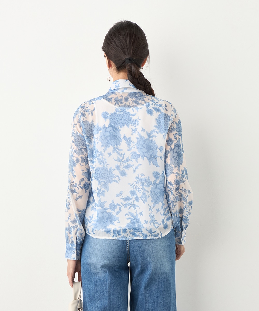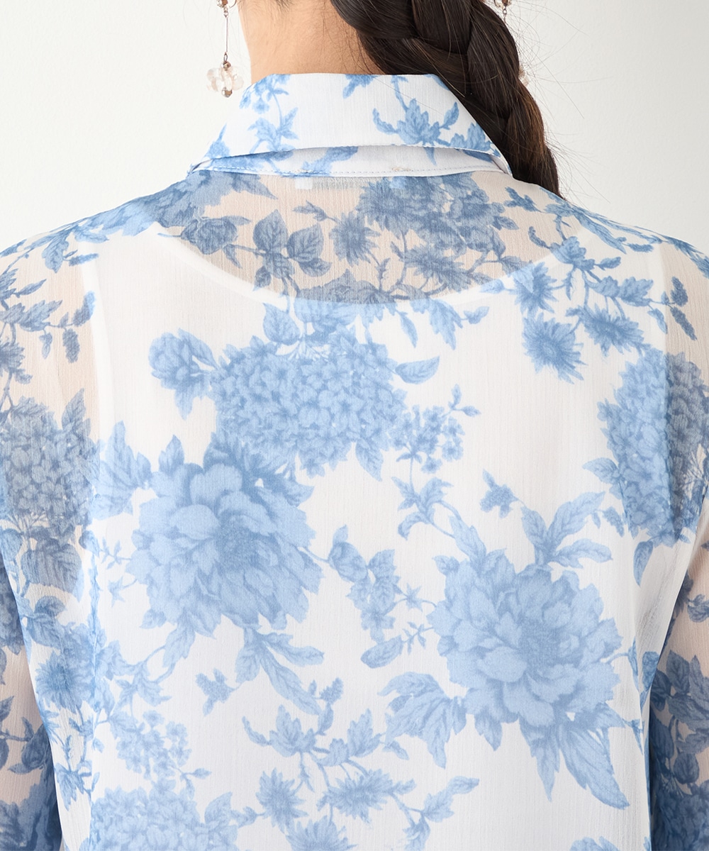 きれいなブルーのカラーがトレンドにマッチ。清潔感やエレガントさもあり、大人っぽいコーディネートに仕上がります。柄の緻密なタッチや生地の繊細な透け感は女性らしさを引き立てるポイントです。着丈は長すぎず、パンツともスカートともバランス良くまとめられます。