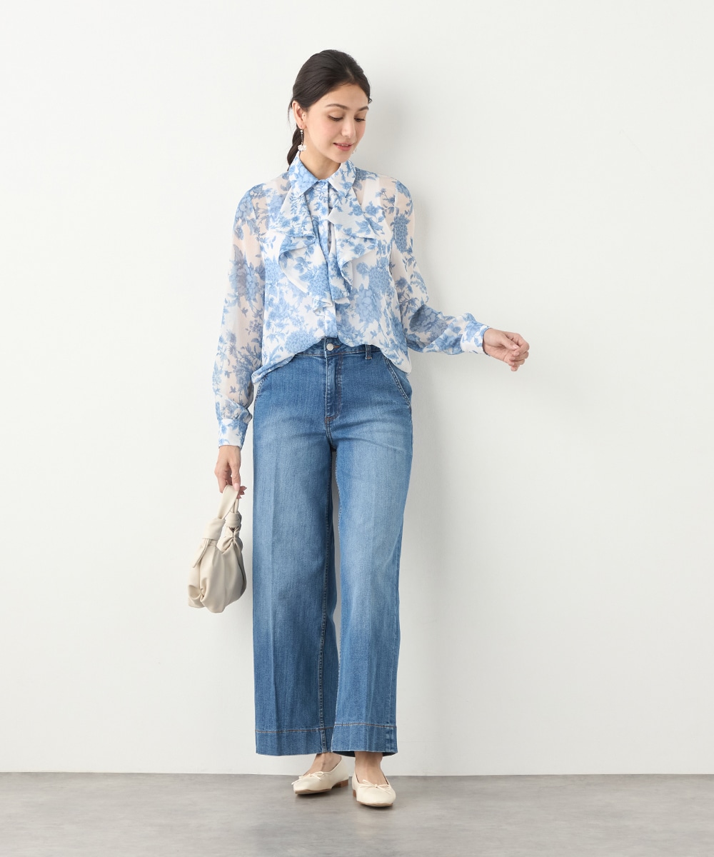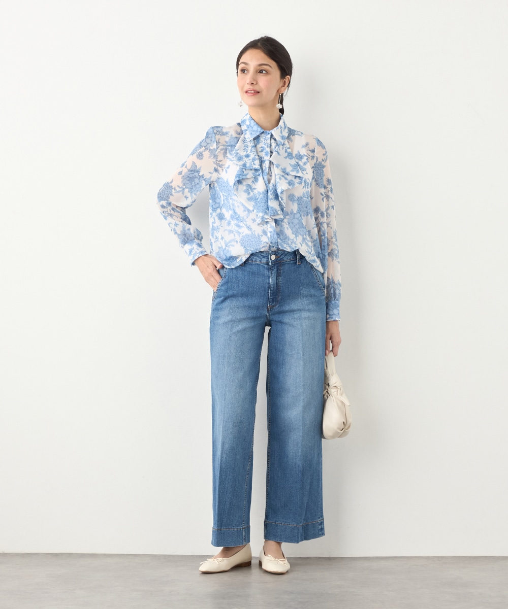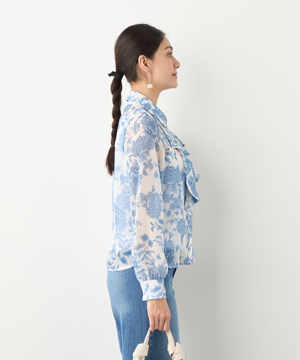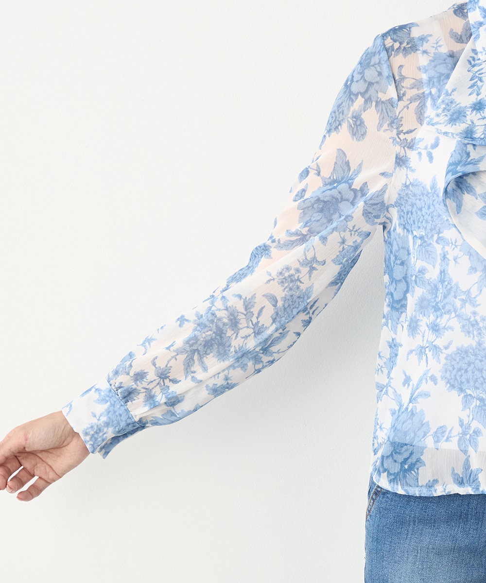 きれいなブルーのカラーがトレンドにマッチ。清潔感やエレガントさもあり、大人っぽいコーディネートに仕上がります。柄の緻密なタッチや生地の繊細な透け感は女性らしさを引き立てるポイントです。着丈は長すぎず、パンツともスカートともバランス良くまとめられます。