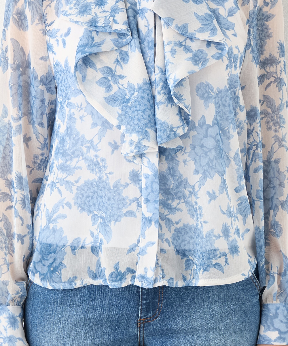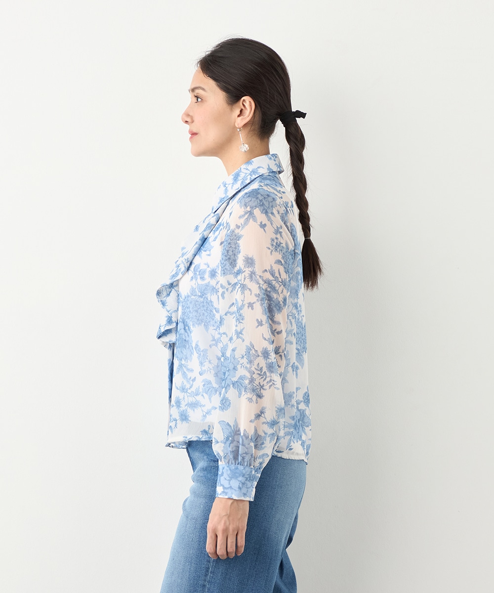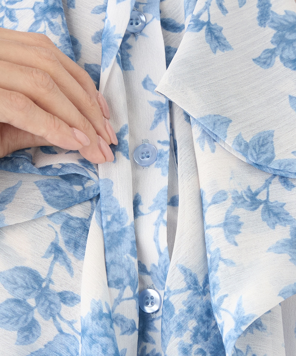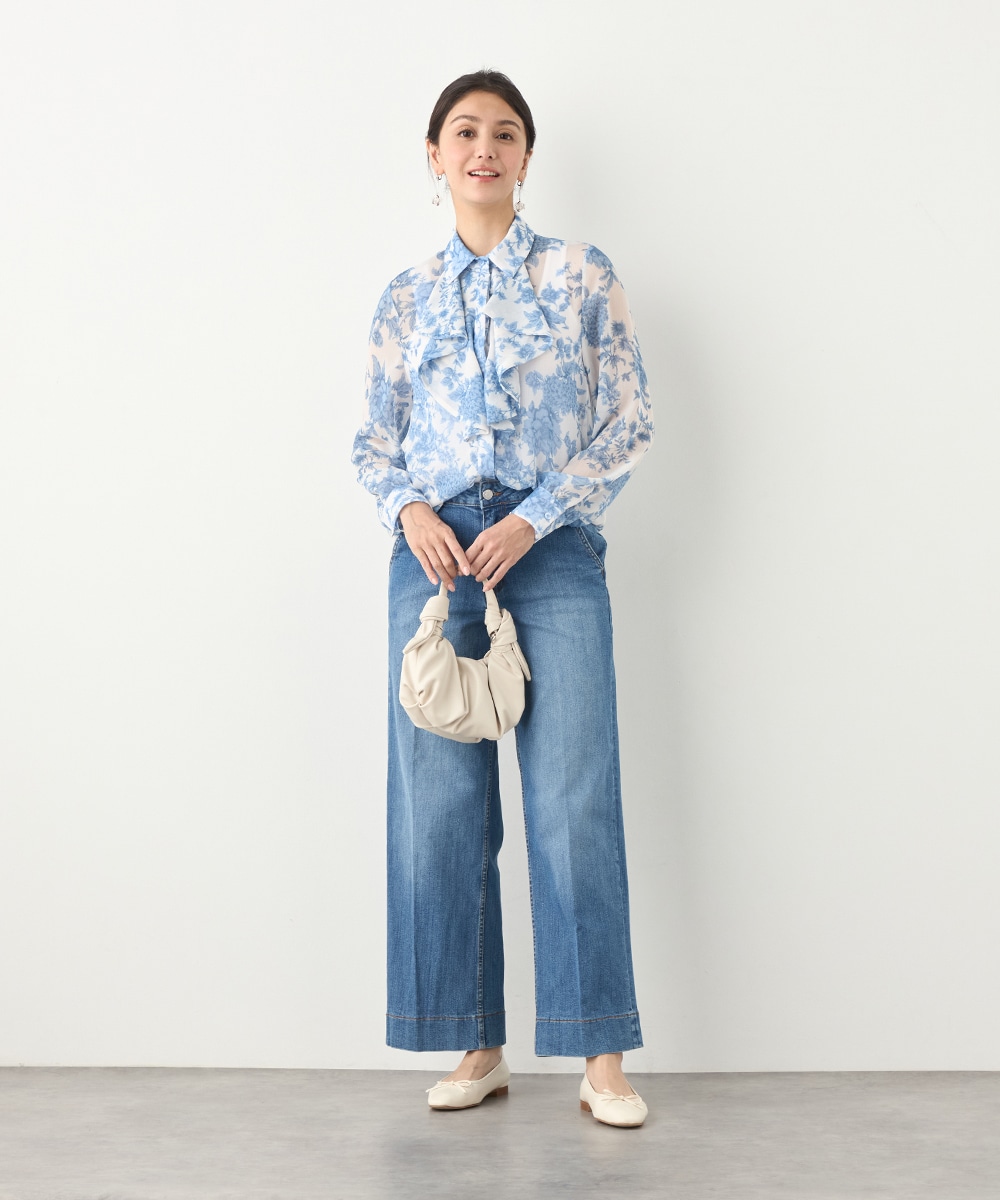 きれいなブルーのカラーがトレンドにマッチ。清潔感やエレガントさもあり、大人っぽいコーディネートに仕上がります。柄の緻密なタッチや生地の繊細な透け感は女性らしさを引き立てるポイントです。着丈は長すぎず、パンツともスカートともバランス良くまとめられます。
