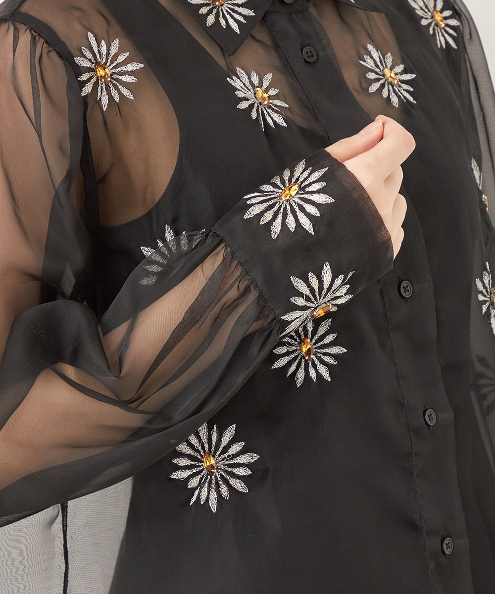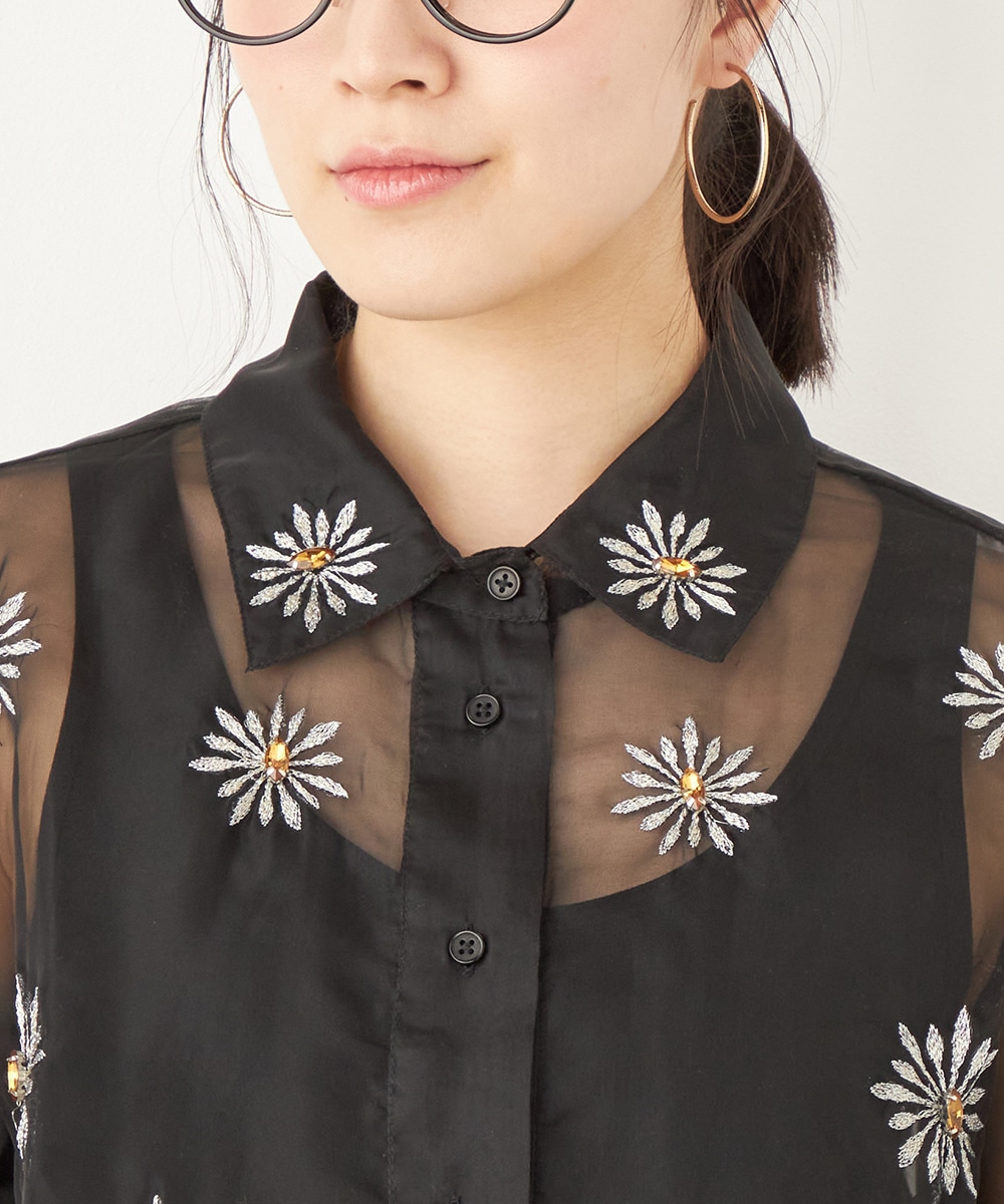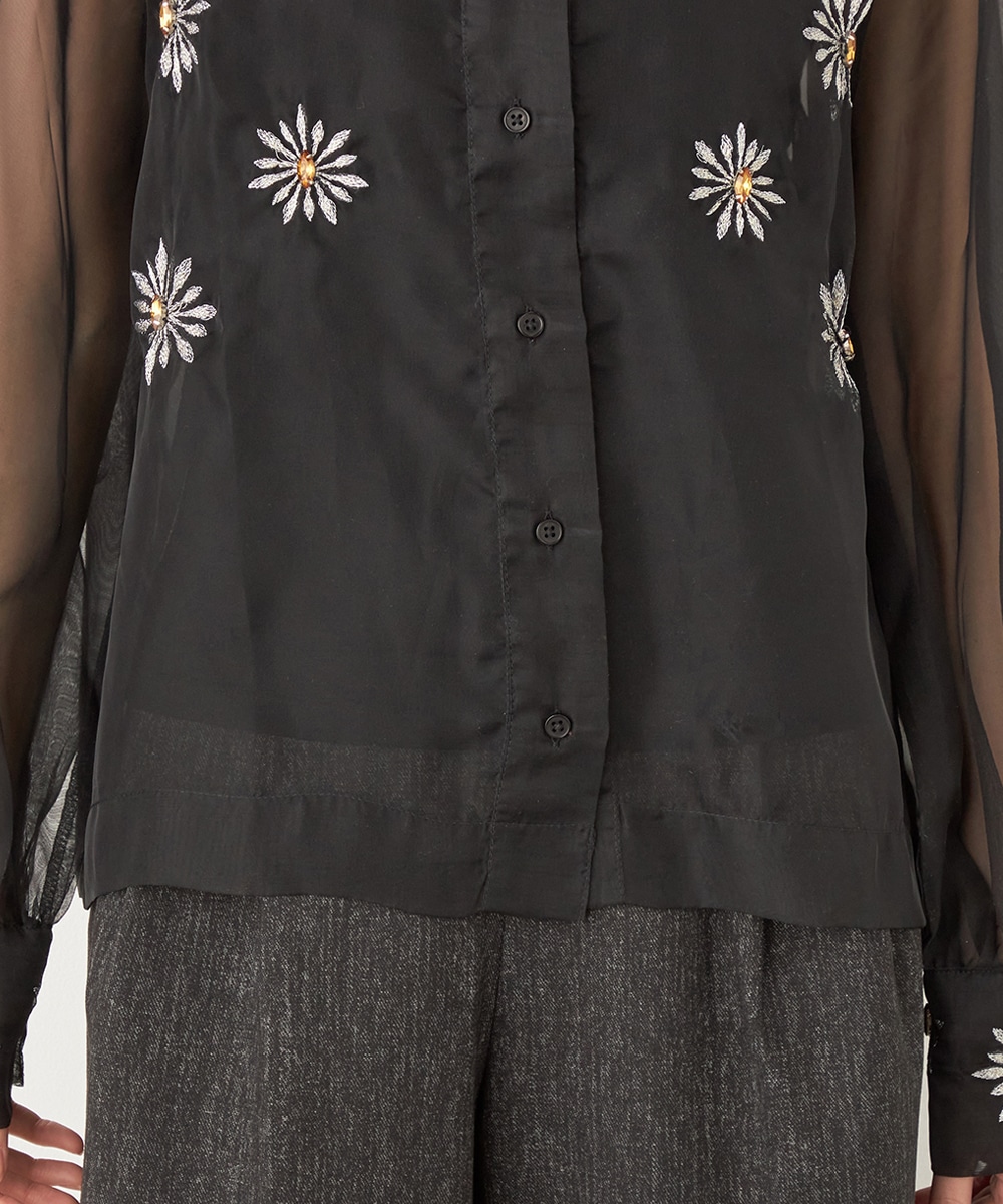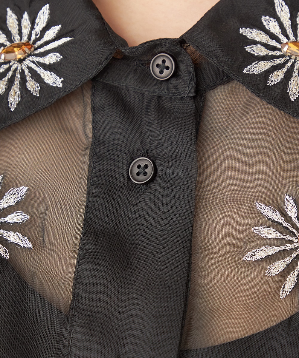 襟元とフロント、袖口にバランス良く刺繍をあしらっています。大ぶりのフラワーの華やかさもこだわりのポイントです。モチーフの中心には煌めくビジューをセットして、より印象的なデザインに仕上げています。繊細な透け感を生かしたレイヤードコーディネートがおすすめです。
