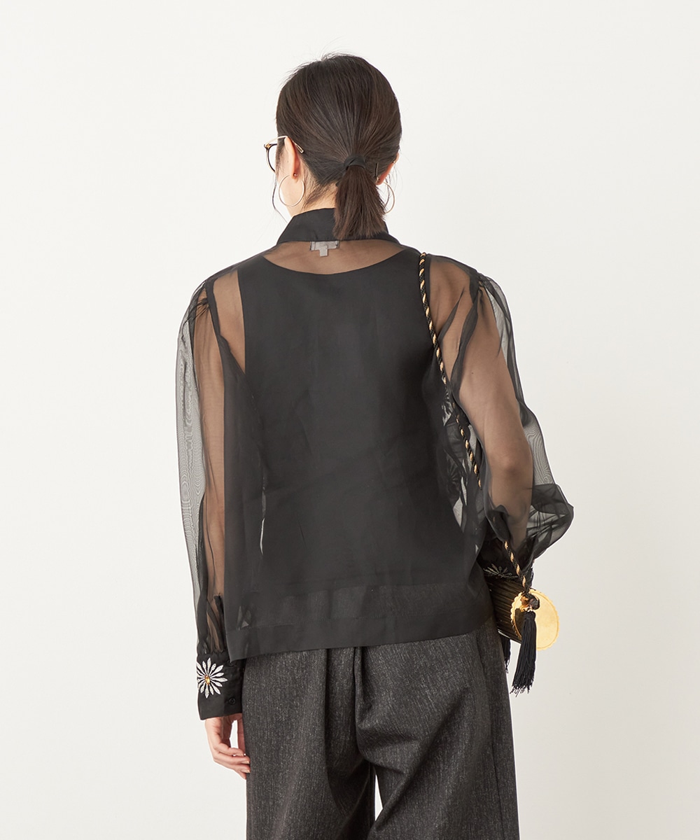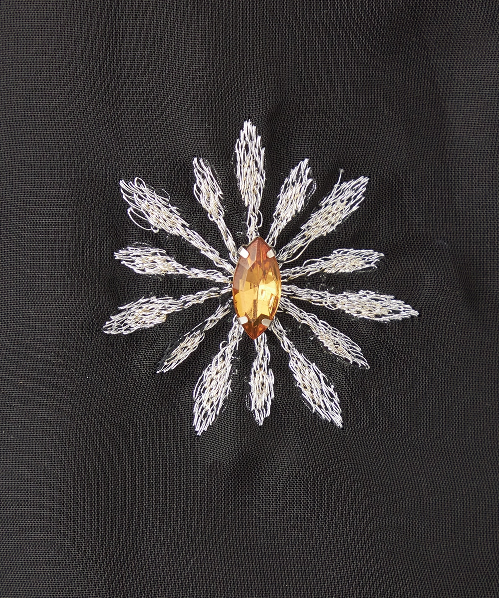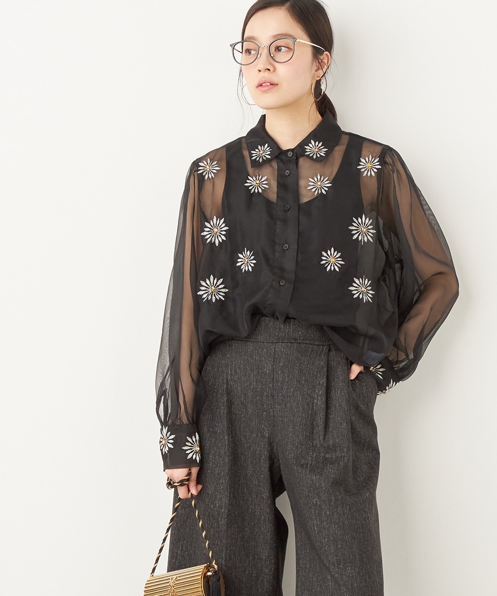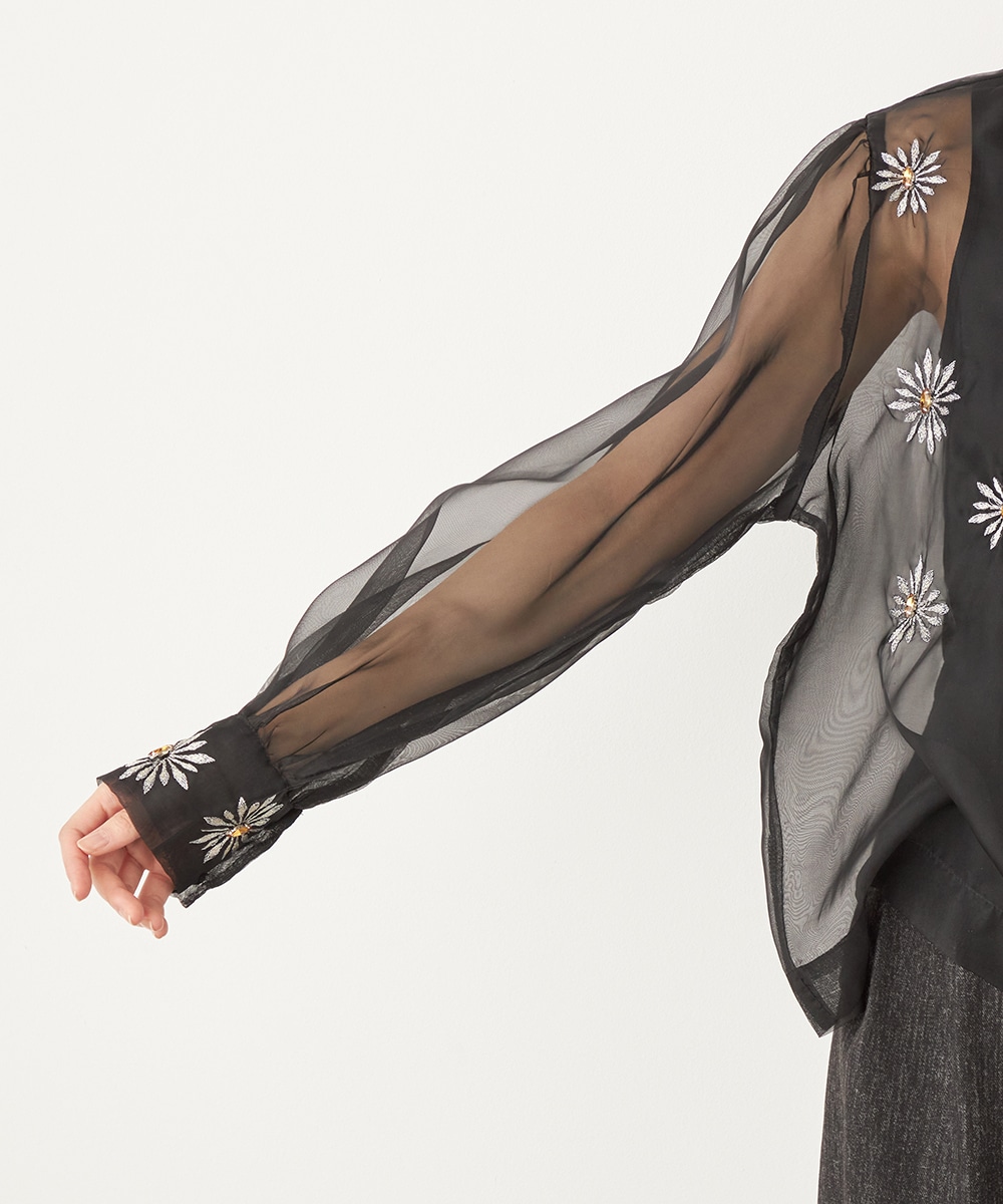 襟元とフロント、袖口にバランス良く刺繍をあしらっています。大ぶりのフラワーの華やかさもこだわりのポイントです。モチーフの中心には煌めくビジューをセットして、より印象的なデザインに仕上げています。繊細な透け感を生かしたレイヤードコーディネートがおすすめです。