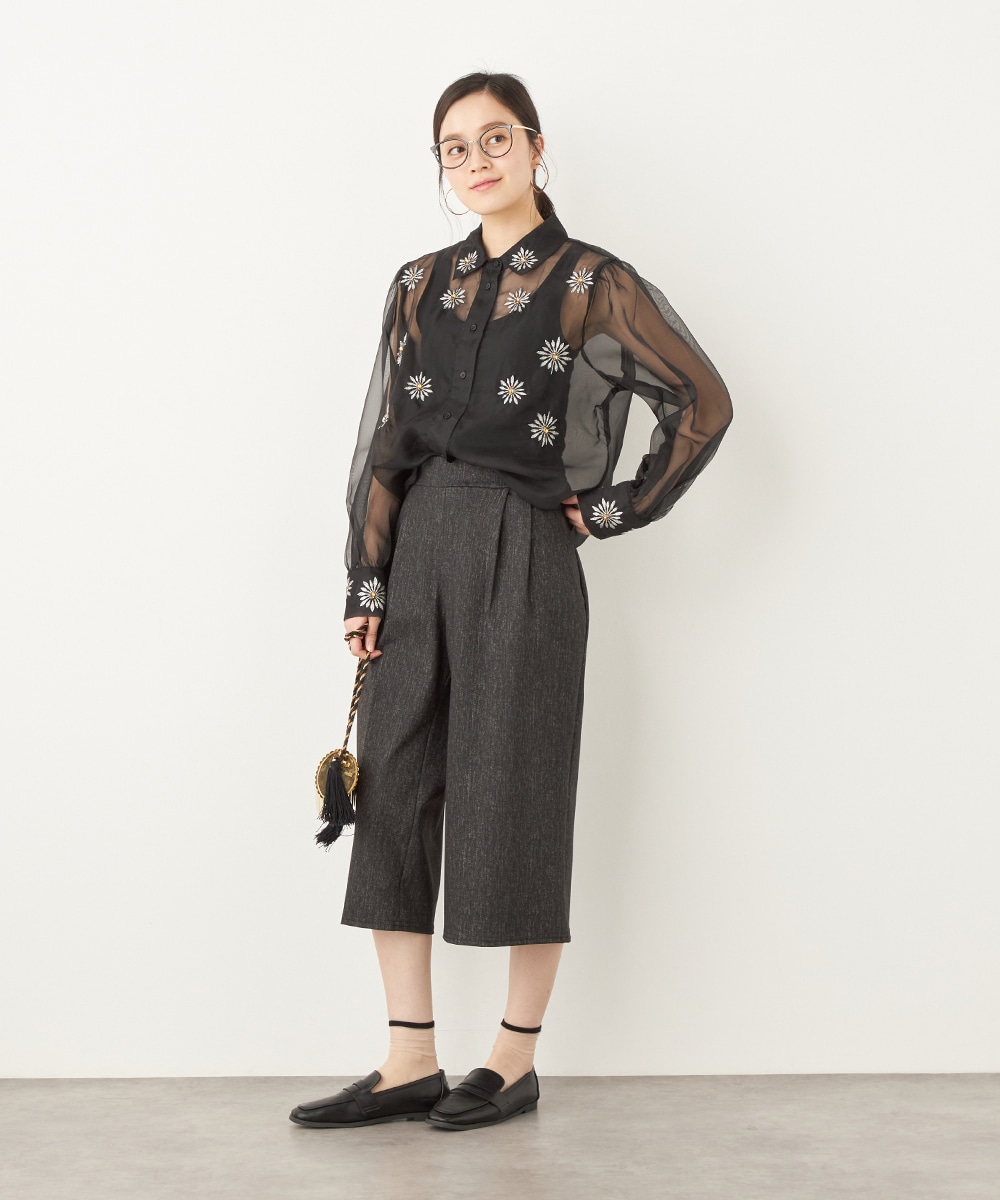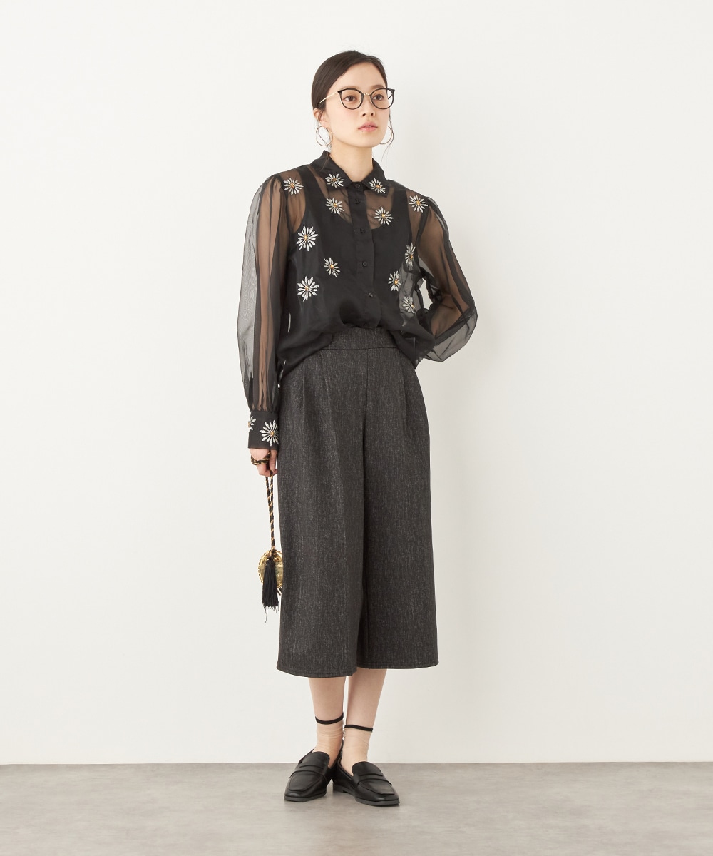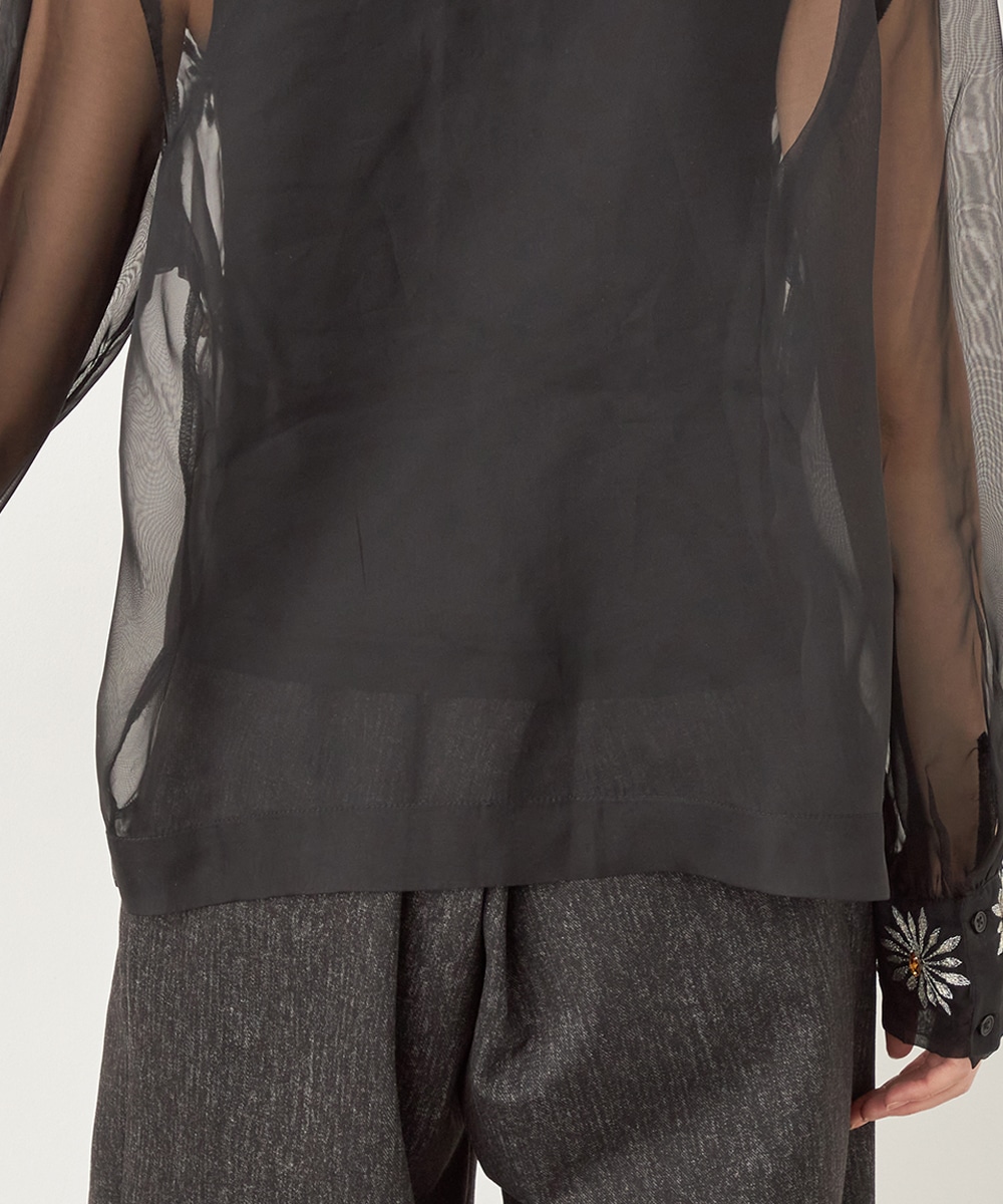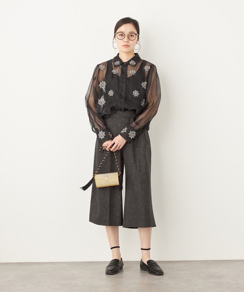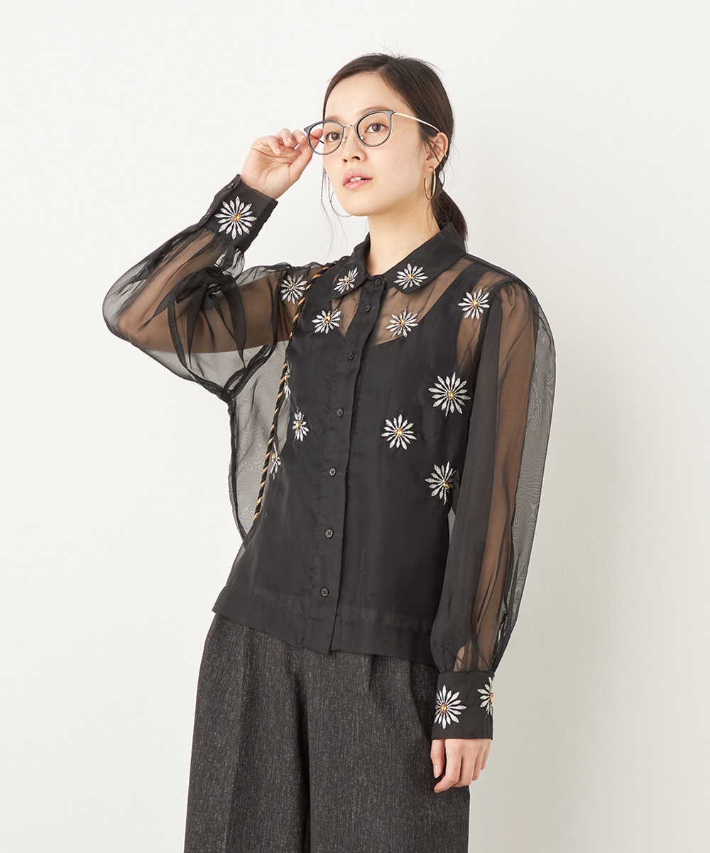 襟元とフロント、袖口にバランス良く刺繍をあしらっています。大ぶりのフラワーの華やかさもこだわりのポイントです。モチーフの中心には煌めくビジューをセットして、より印象的なデザインに仕上げています。繊細な透け感を生かしたレイヤードコーディネートがおすすめです。