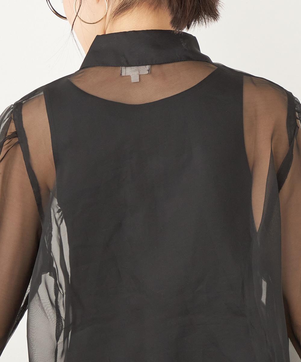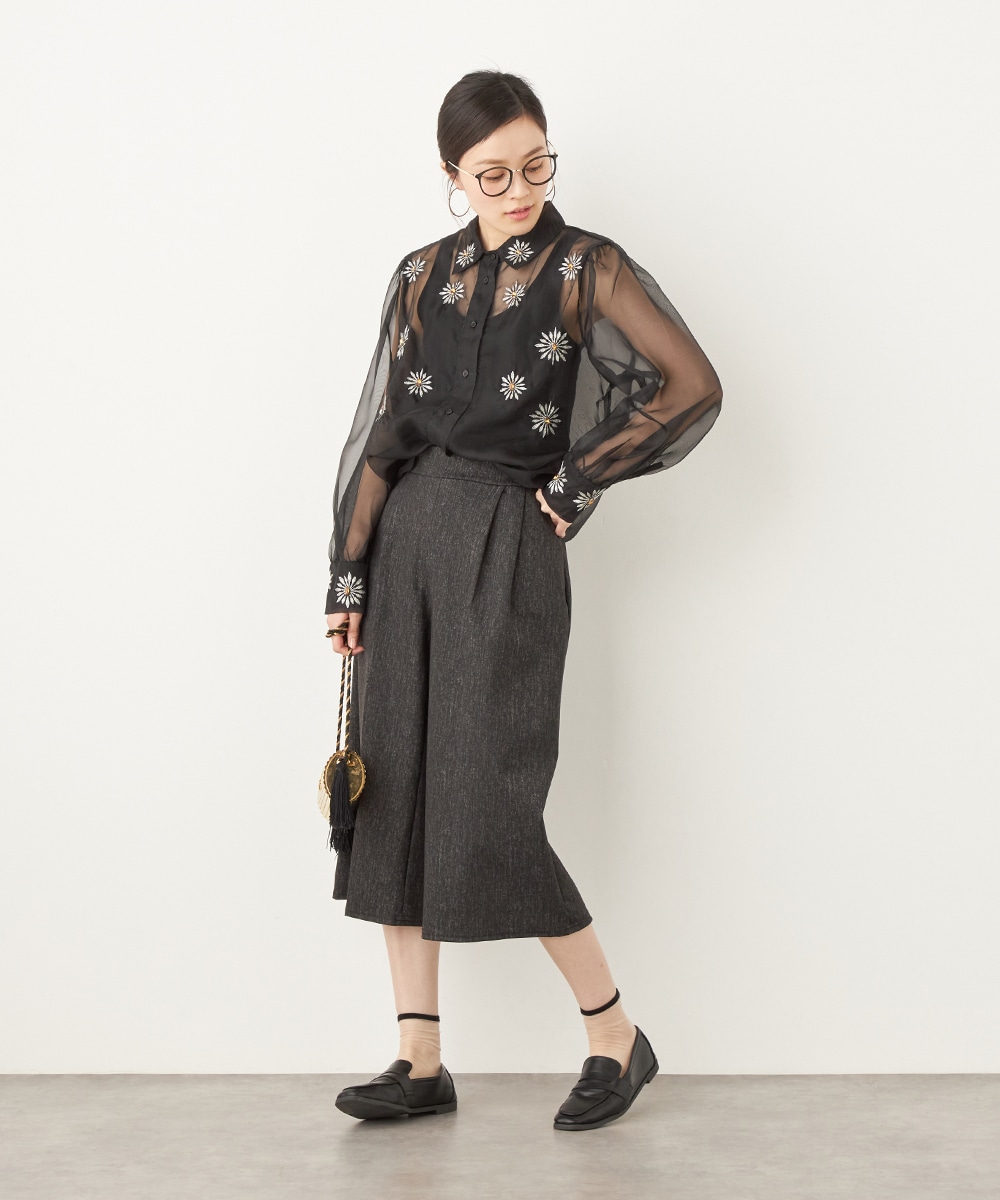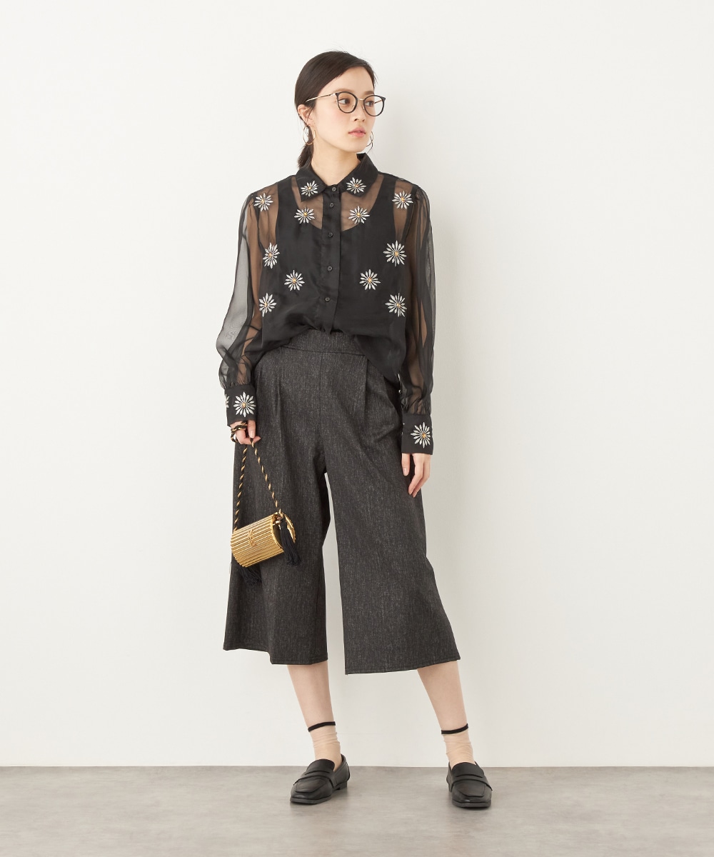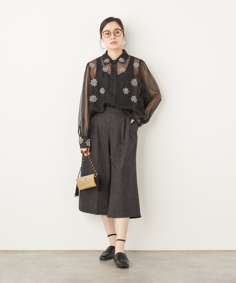 襟元とフロント、袖口にバランス良く刺繍をあしらっています。大ぶりのフラワーの華やかさもこだわりのポイントです。モチーフの中心には煌めくビジューをセットして、より印象的なデザインに仕上げています。繊細な透け感を生かしたレイヤードコーディネートがおすすめです。