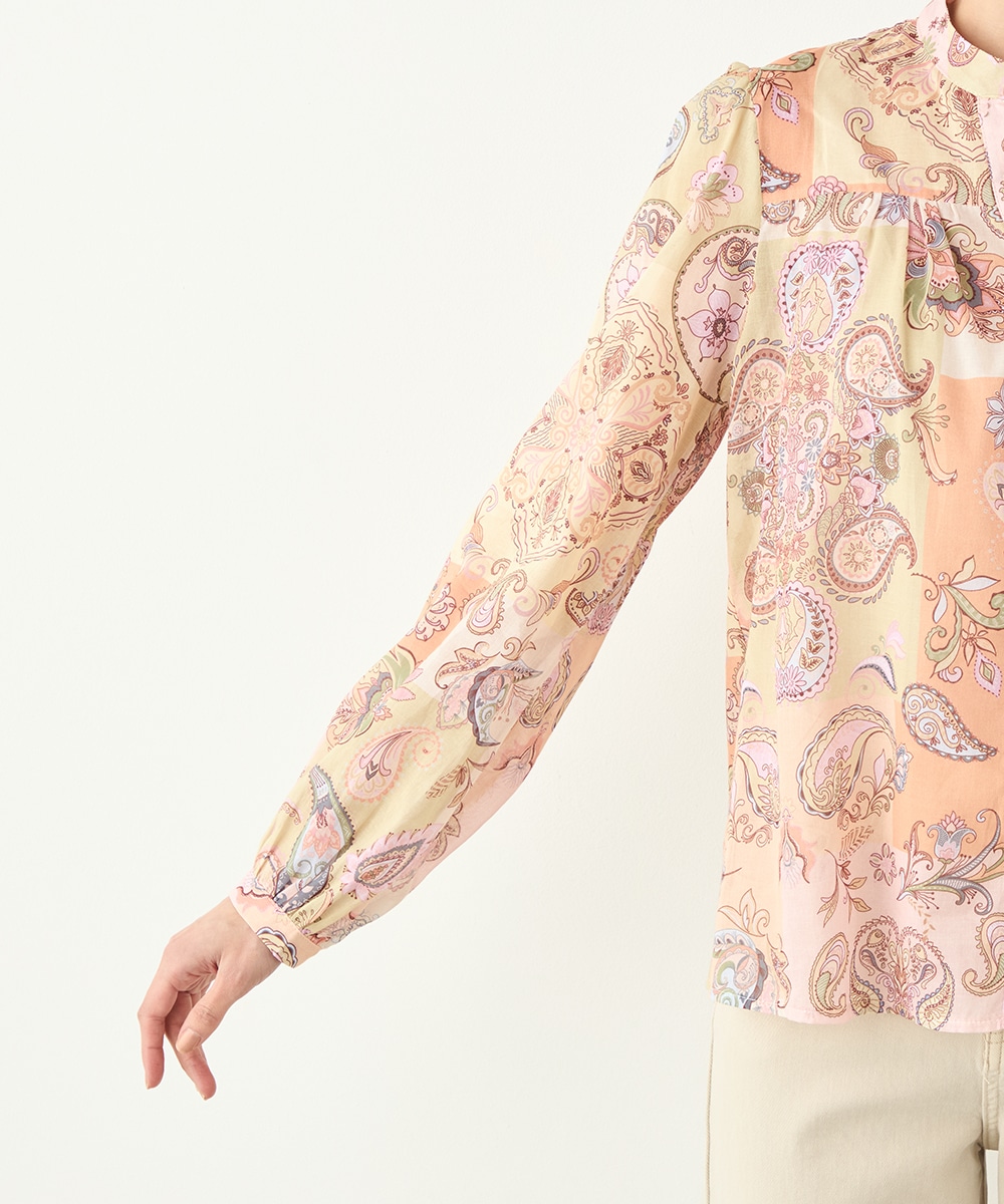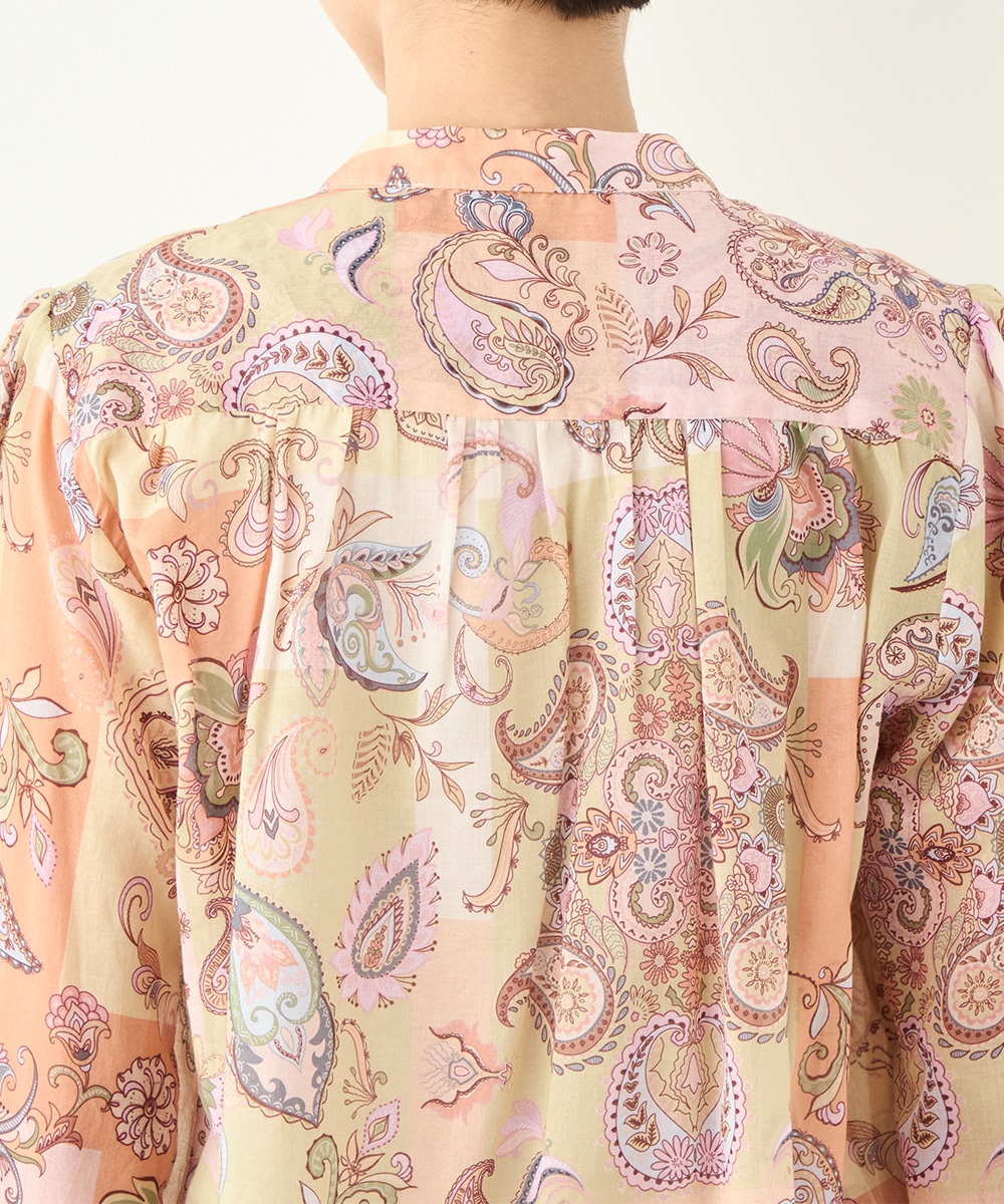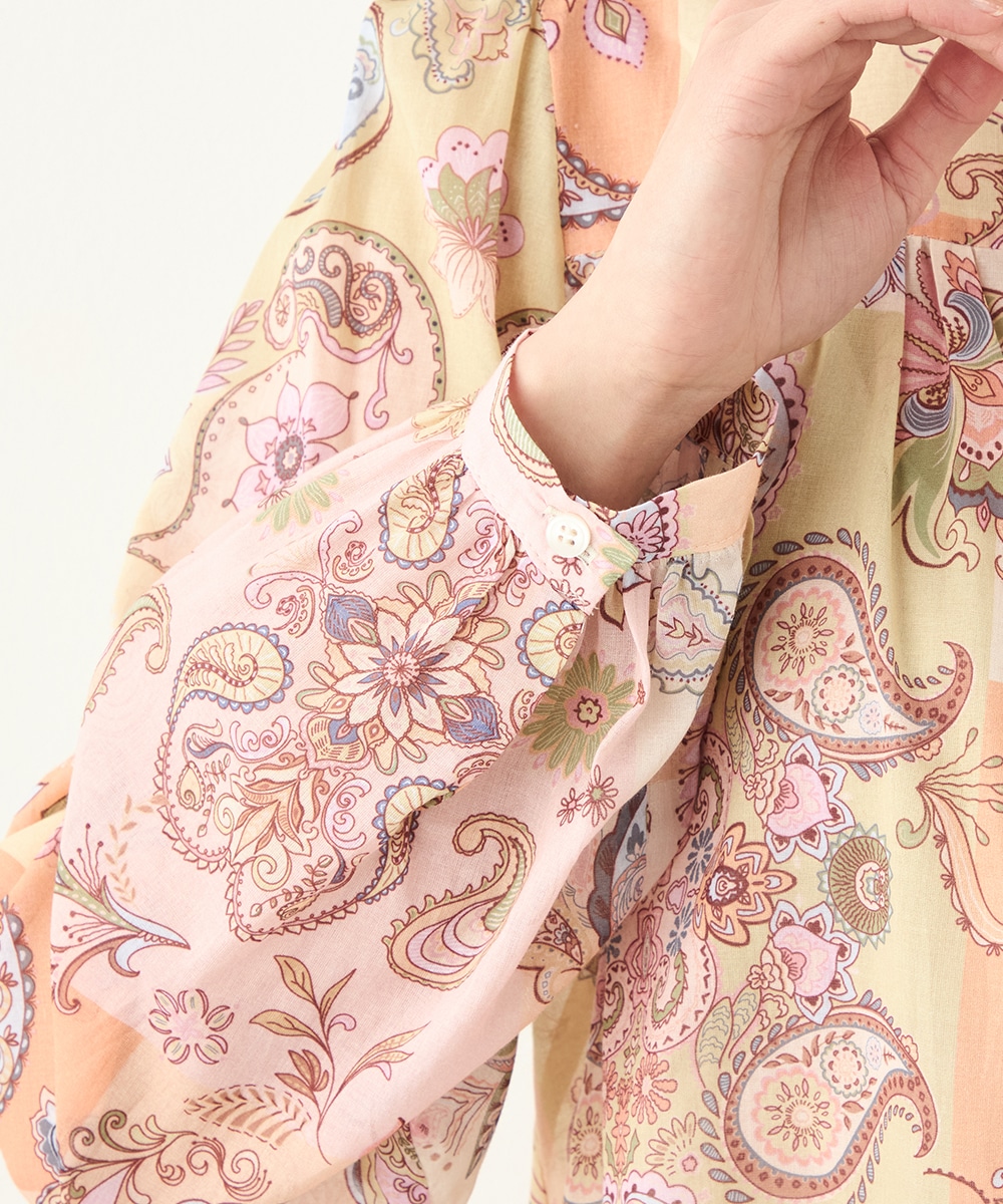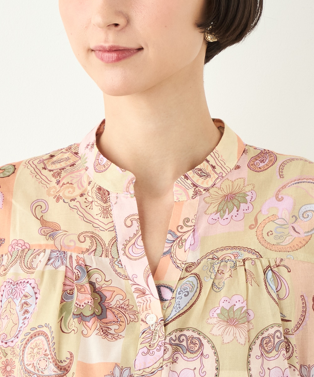 淡いイエローをベースにした、柔らかな雰囲気の配色です。立ち襟とネックのカッティングによってフェイスラインがすっきりと見えます。身頃の切り替えにはギャザーを施して、シルエットに立体感をプラス。薄手のコットン生地のふんわりとしたボリューム感も際立っています。