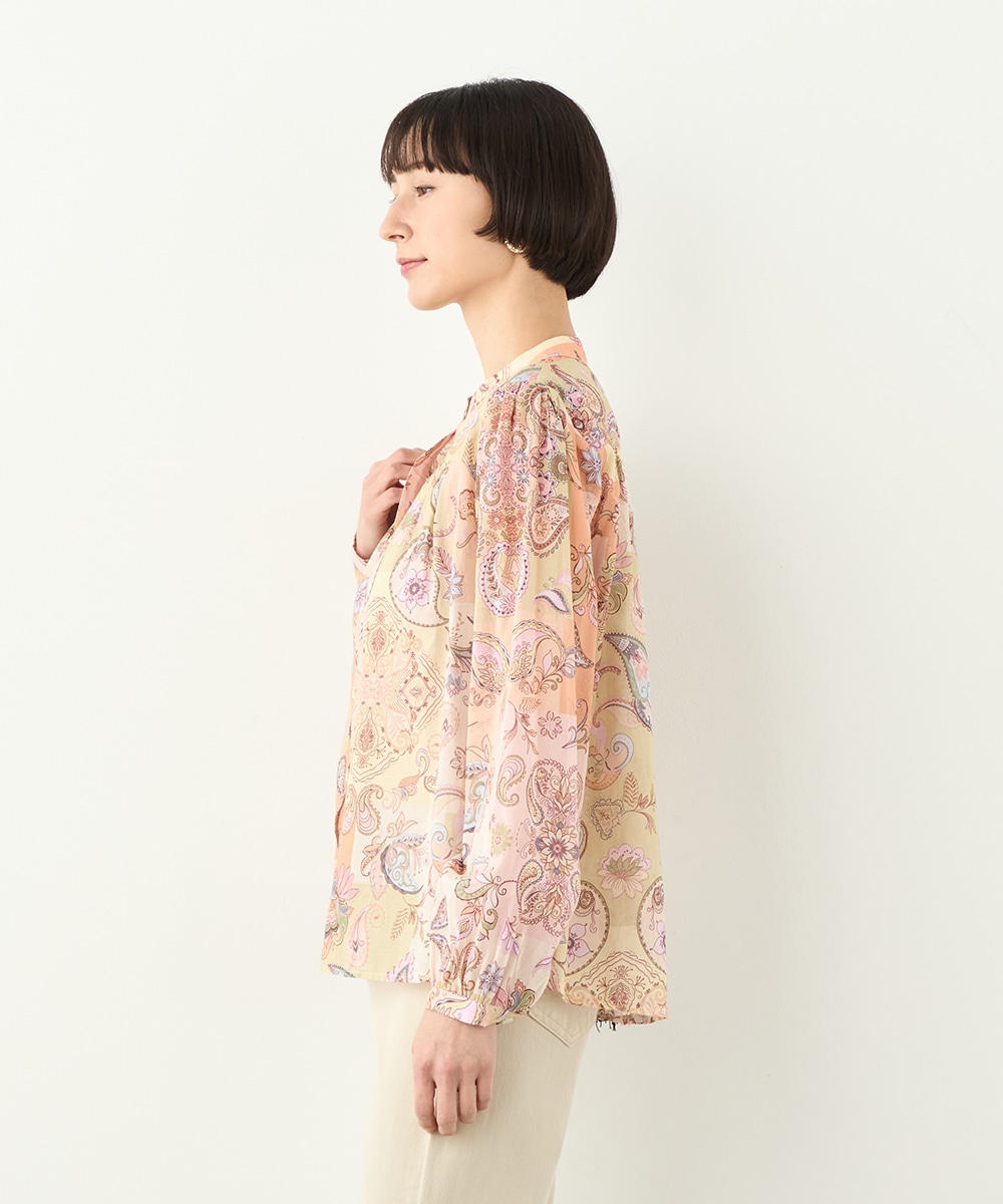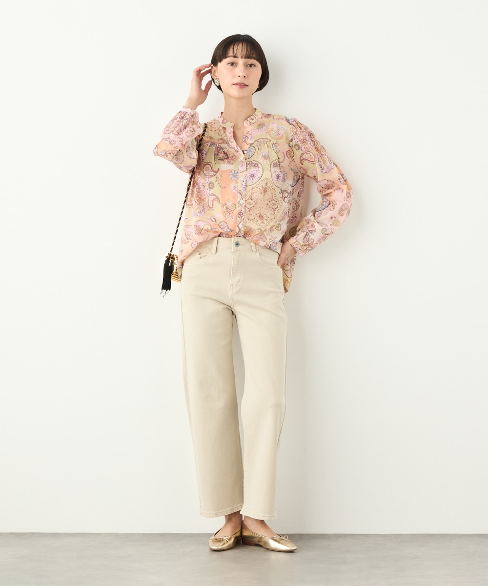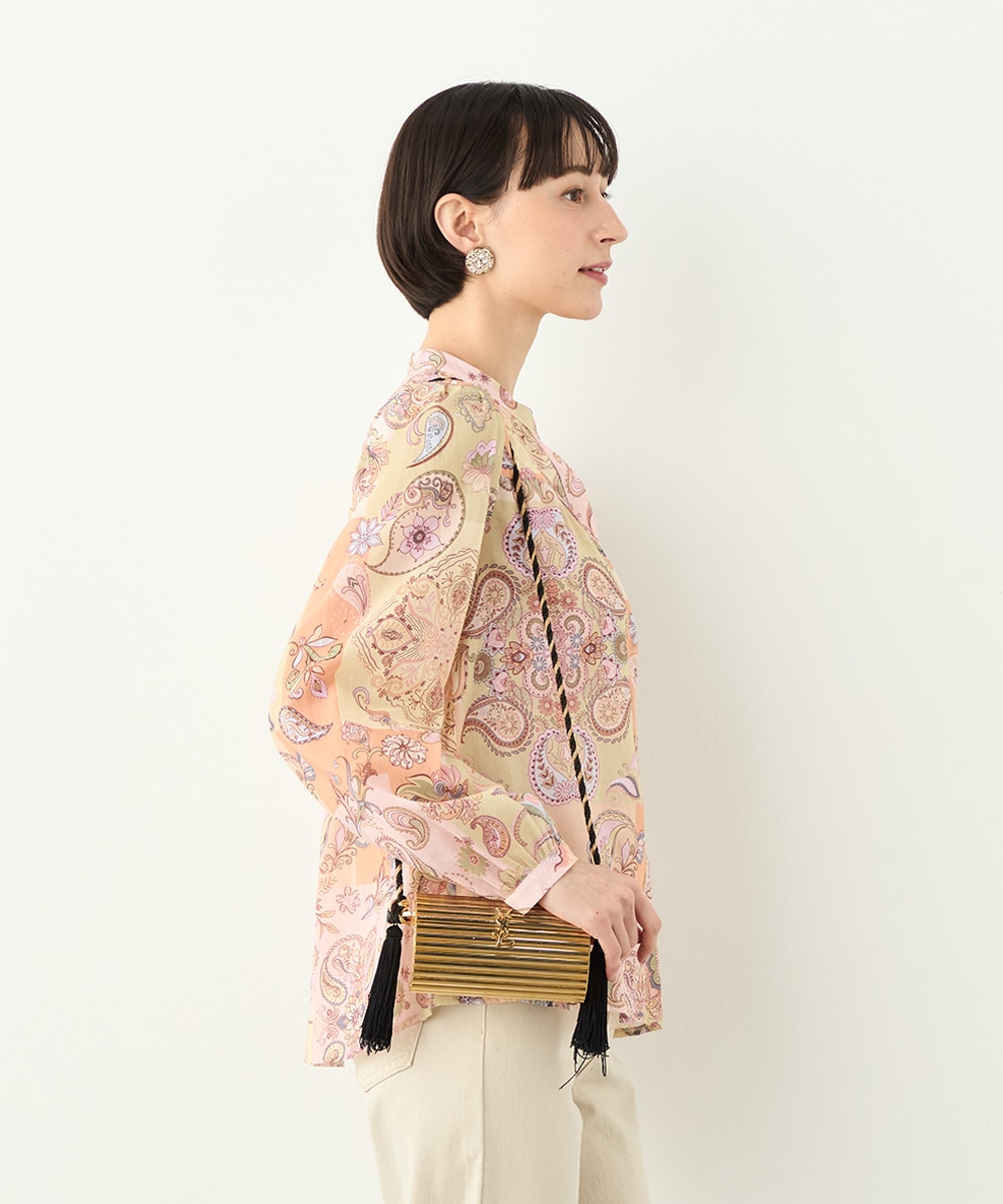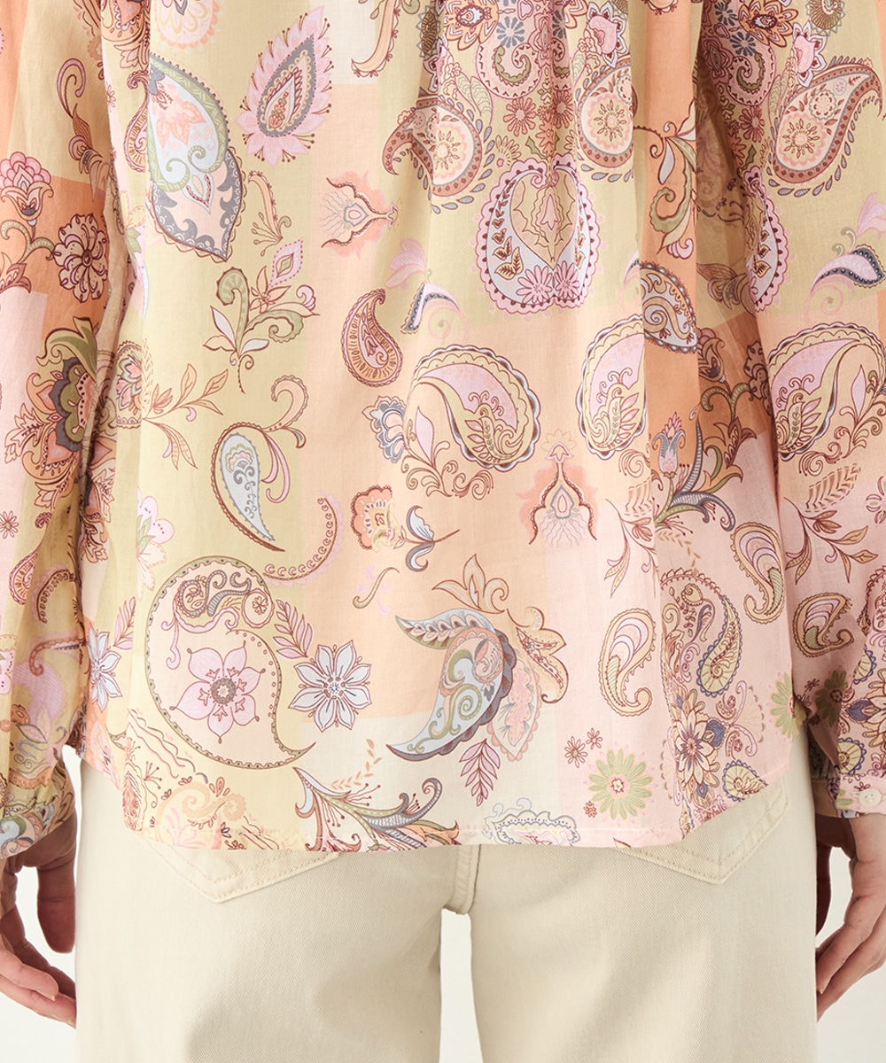 淡いイエローをベースにした、柔らかな雰囲気の配色です。立ち襟とネックのカッティングによってフェイスラインがすっきりと見えます。身頃の切り替えにはギャザーを施して、シルエットに立体感をプラス。薄手のコットン生地のふんわりとしたボリューム感も際立っています。