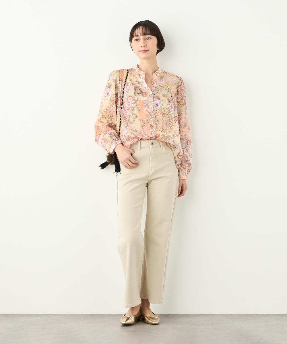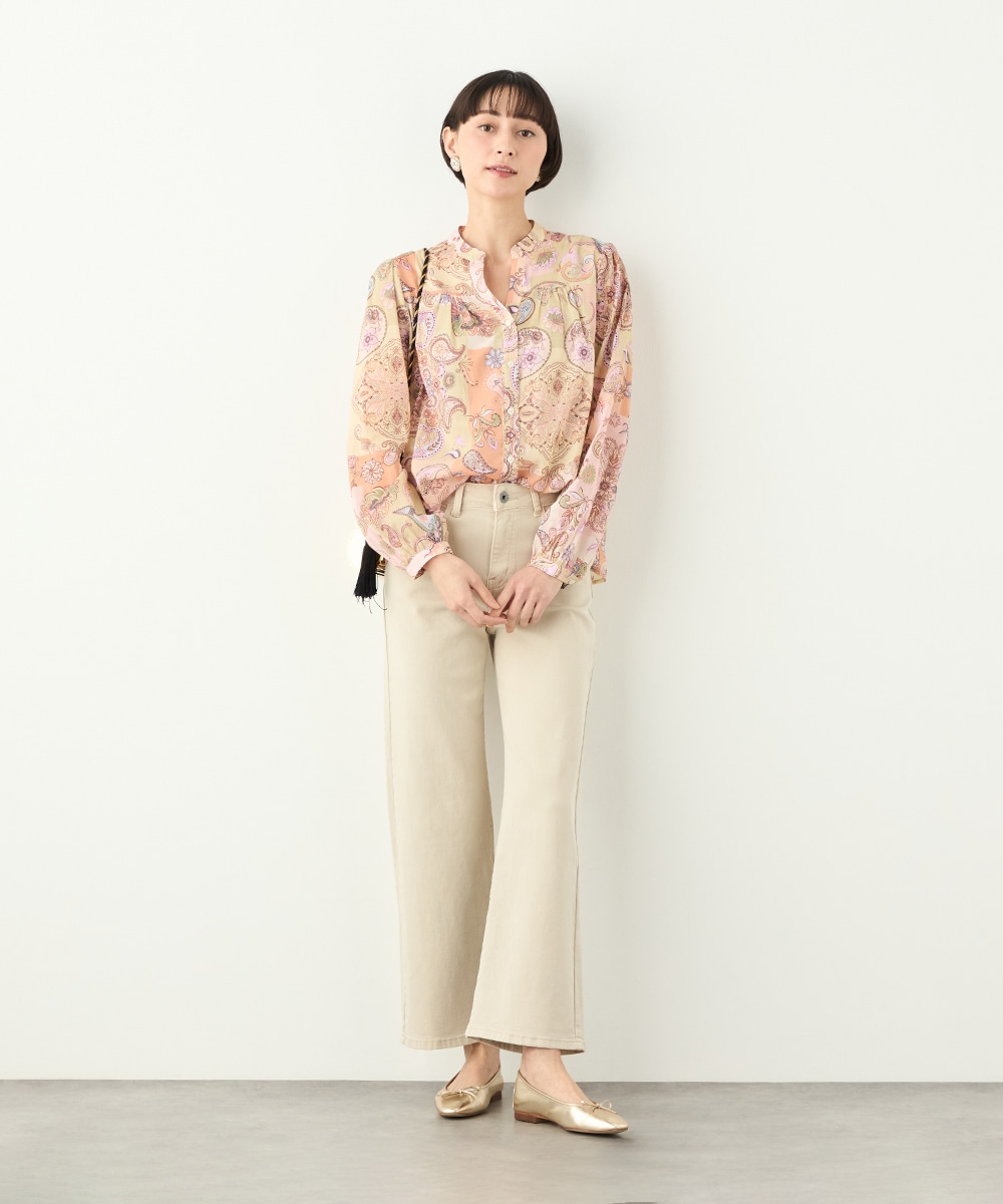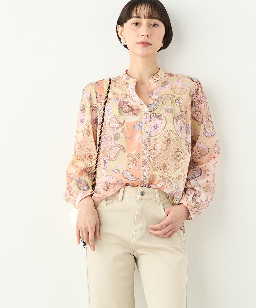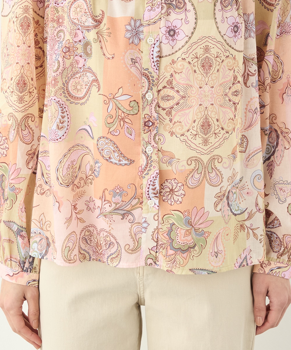 淡いイエローをベースにした、柔らかな雰囲気の配色です。立ち襟とネックのカッティングによってフェイスラインがすっきりと見えます。身頃の切り替えにはギャザーを施して、シルエットに立体感をプラス。薄手のコットン生地のふんわりとしたボリューム感も際立っています。