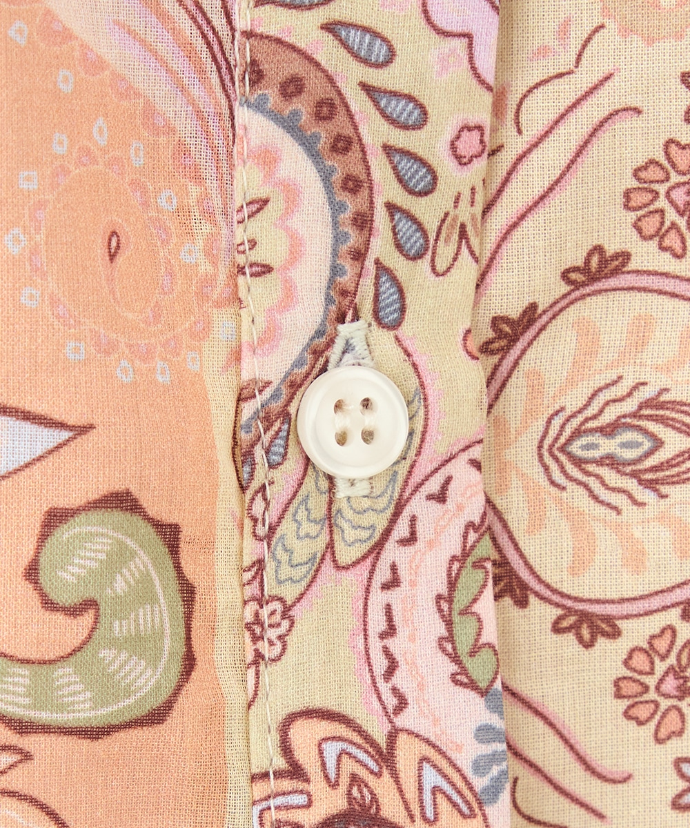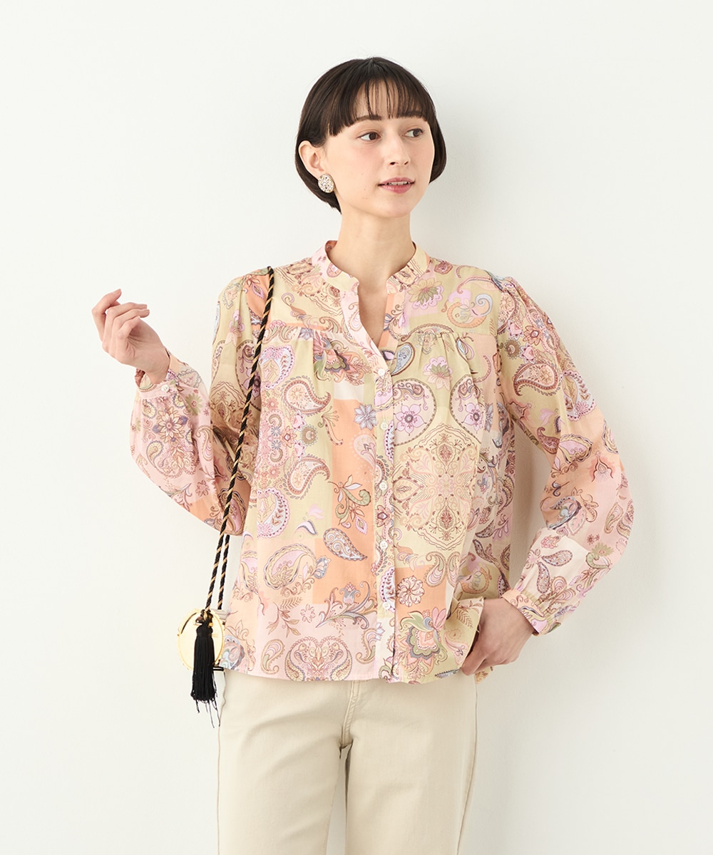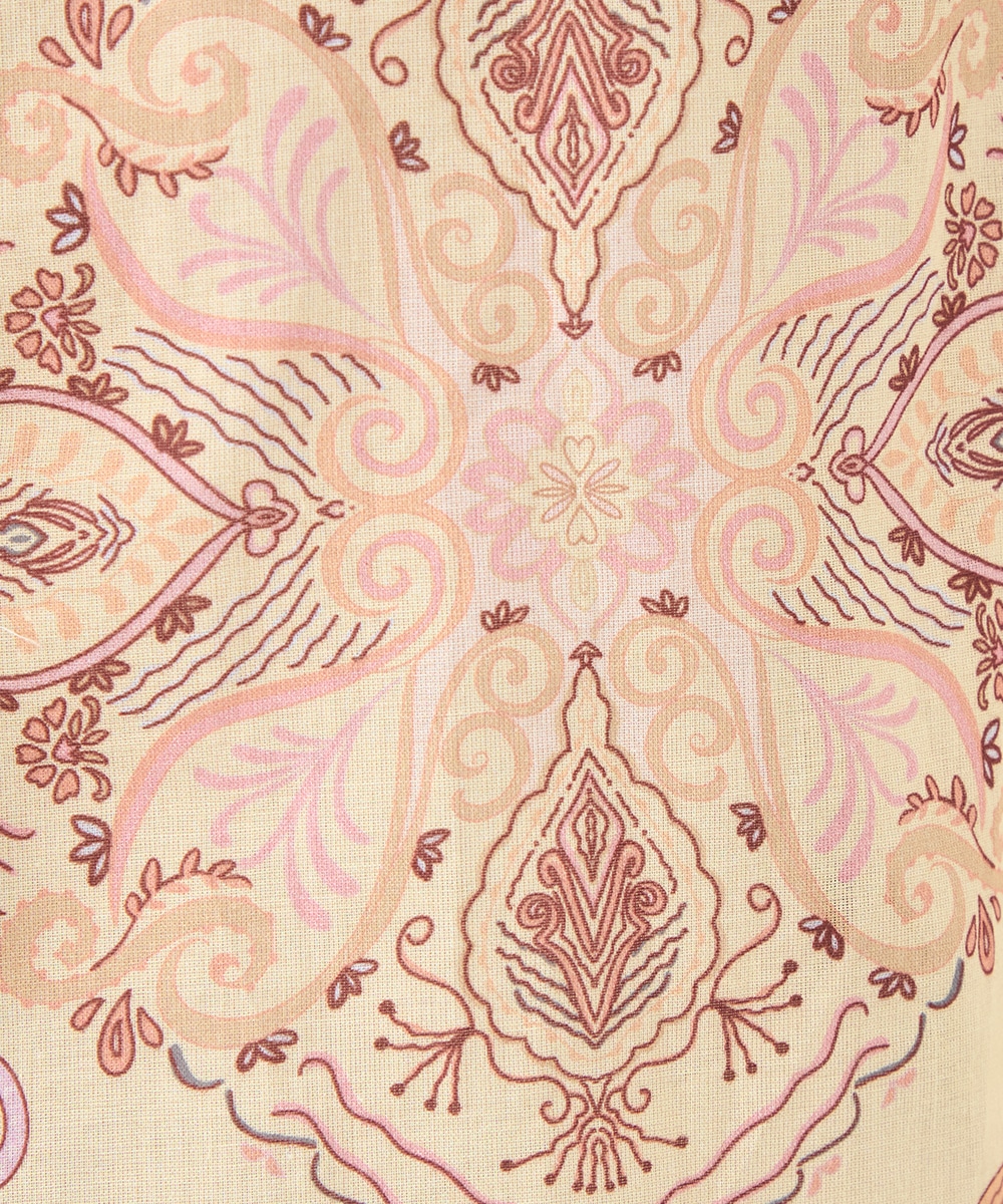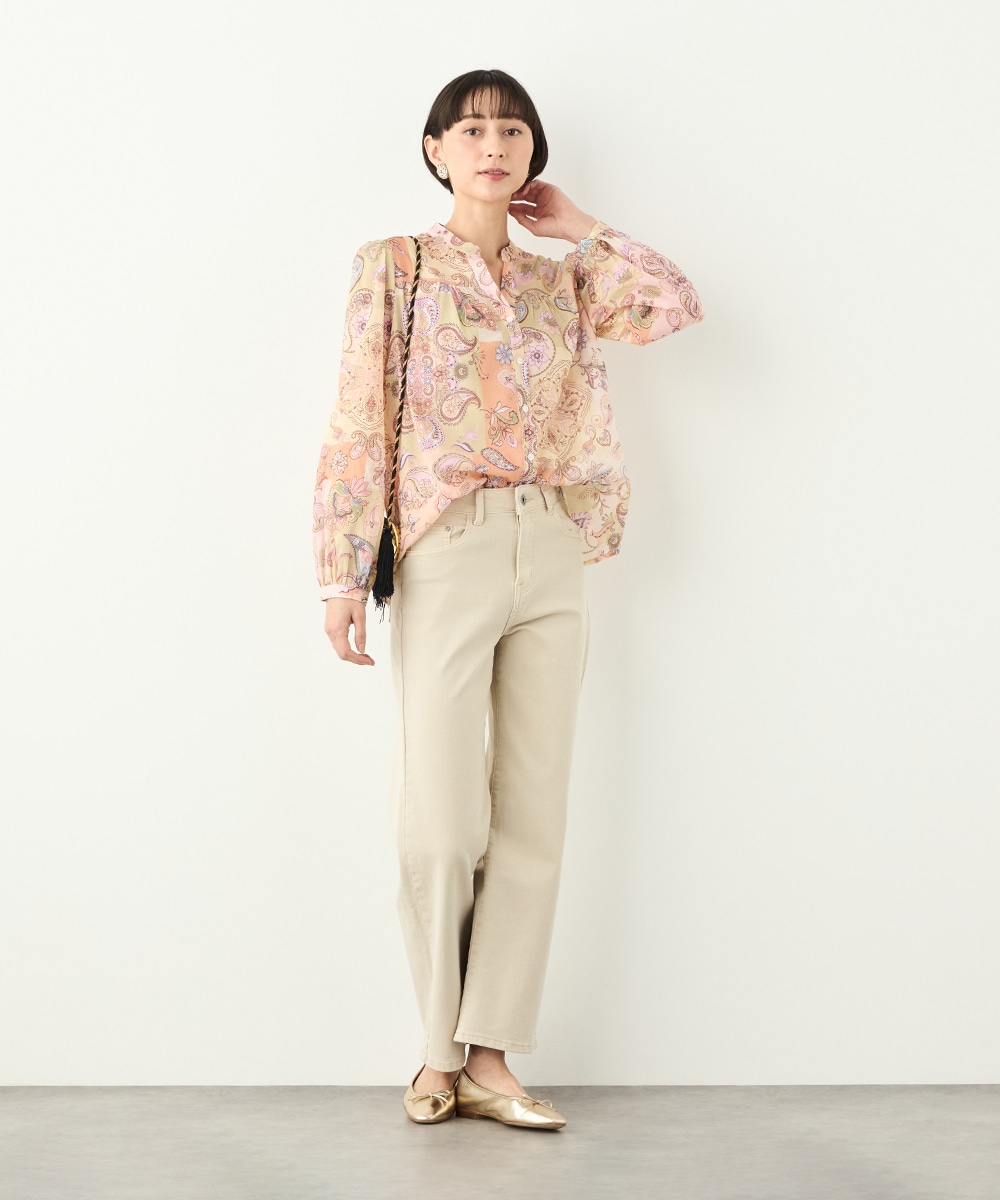 淡いイエローをベースにした、柔らかな雰囲気の配色です。立ち襟とネックのカッティングによってフェイスラインがすっきりと見えます。身頃の切り替えにはギャザーを施して、シルエットに立体感をプラス。薄手のコットン生地のふんわりとしたボリューム感も際立っています。