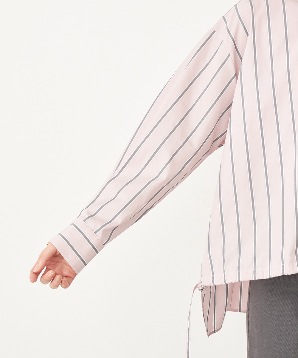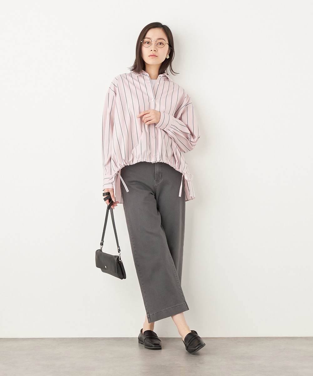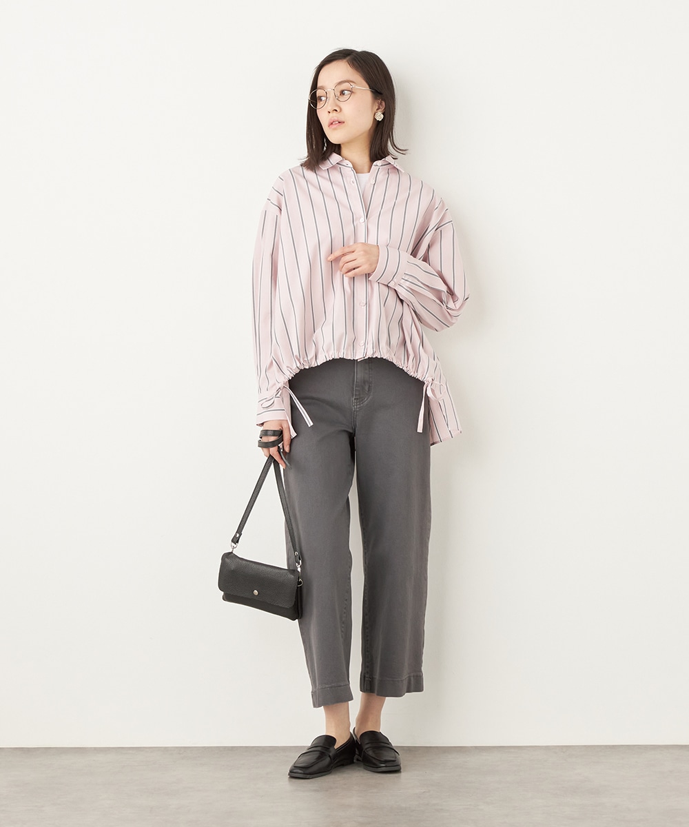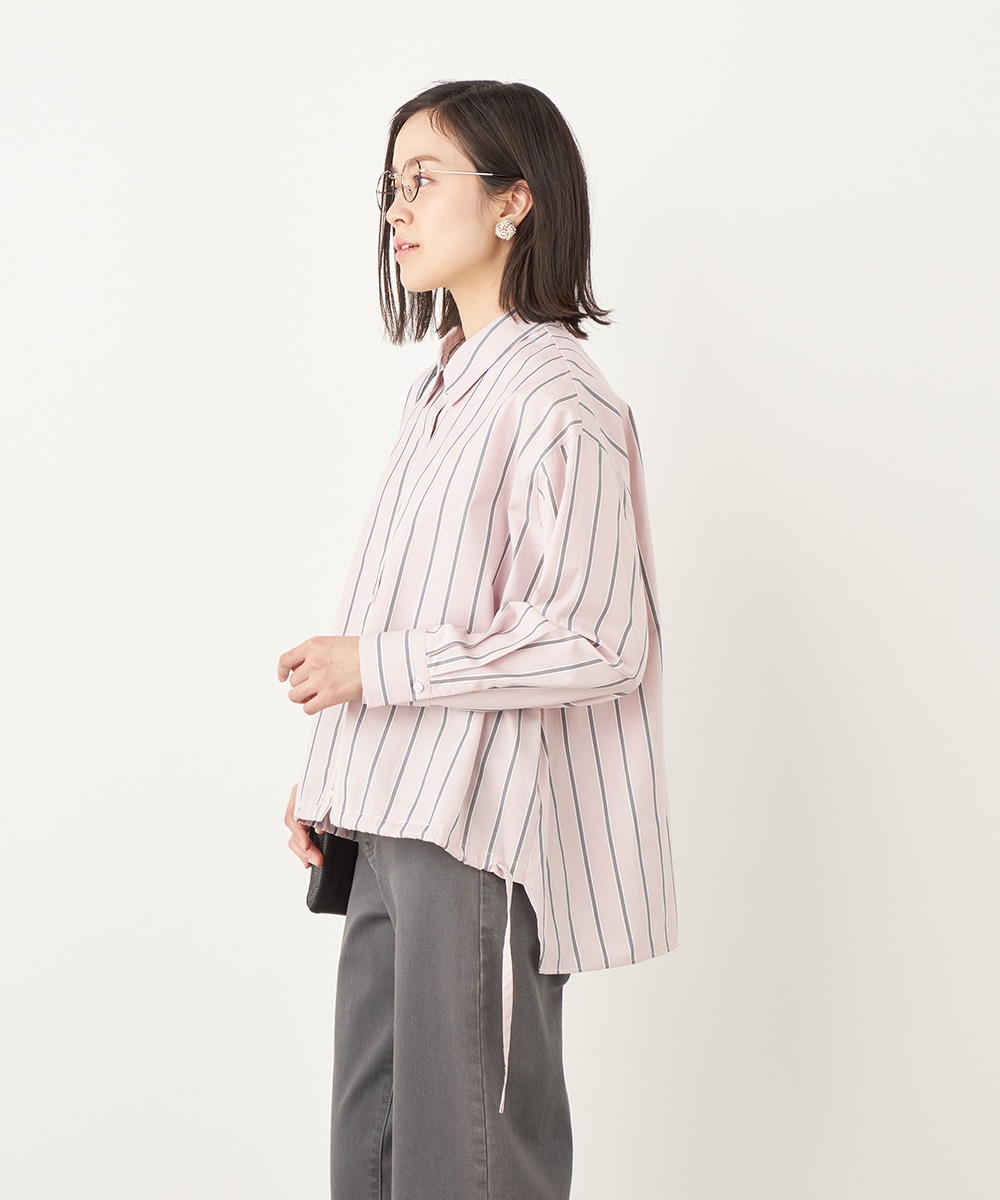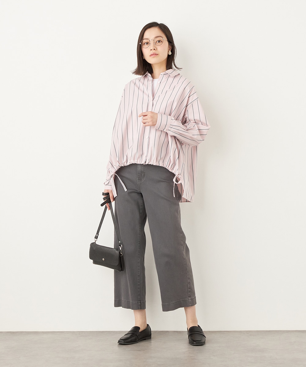 ドロップショルダーのゆったりとしたサイズ感がトレンドにマッチします。前裾のコードを絞ることでシルエットのアレンジが可能です。襟付きでほどよいキレイ目感もあり、大人のコーディネートにぴったり。一枚着として活用するのはもちろん、暖かな時季には羽織として取り入れても素敵です。