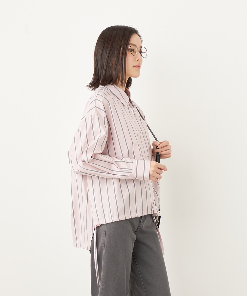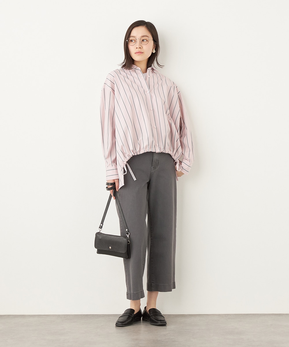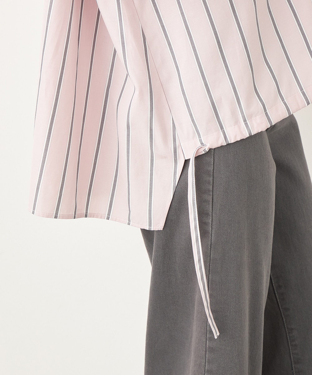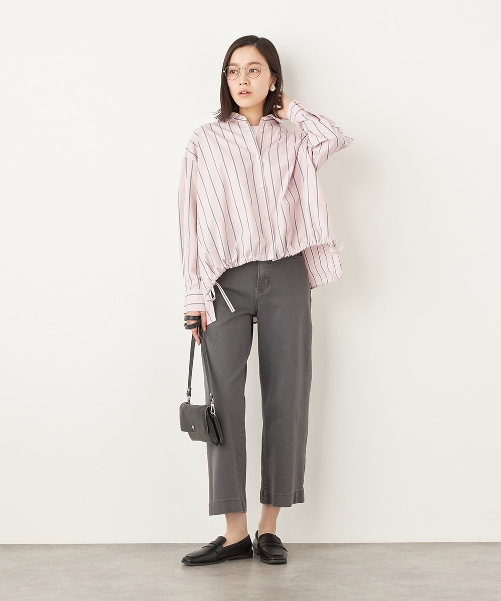 ドロップショルダーのゆったりとしたサイズ感がトレンドにマッチします。前裾のコードを絞ることでシルエットのアレンジが可能です。襟付きでほどよいキレイ目感もあり、大人のコーディネートにぴったり。一枚着として活用するのはもちろん、暖かな時季には羽織として取り入れても素敵です。