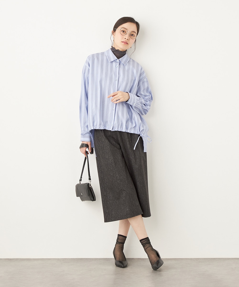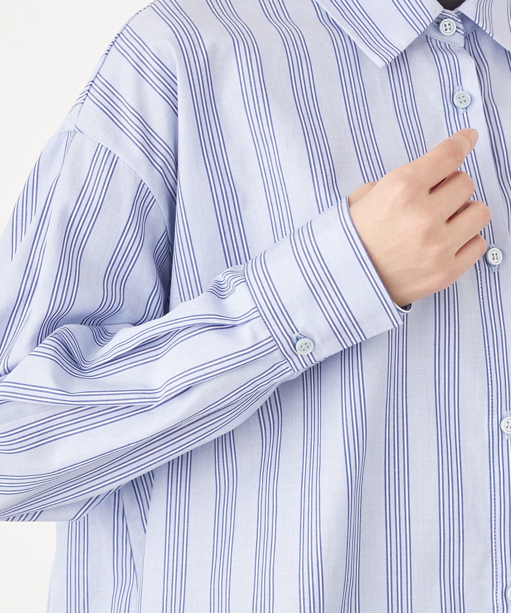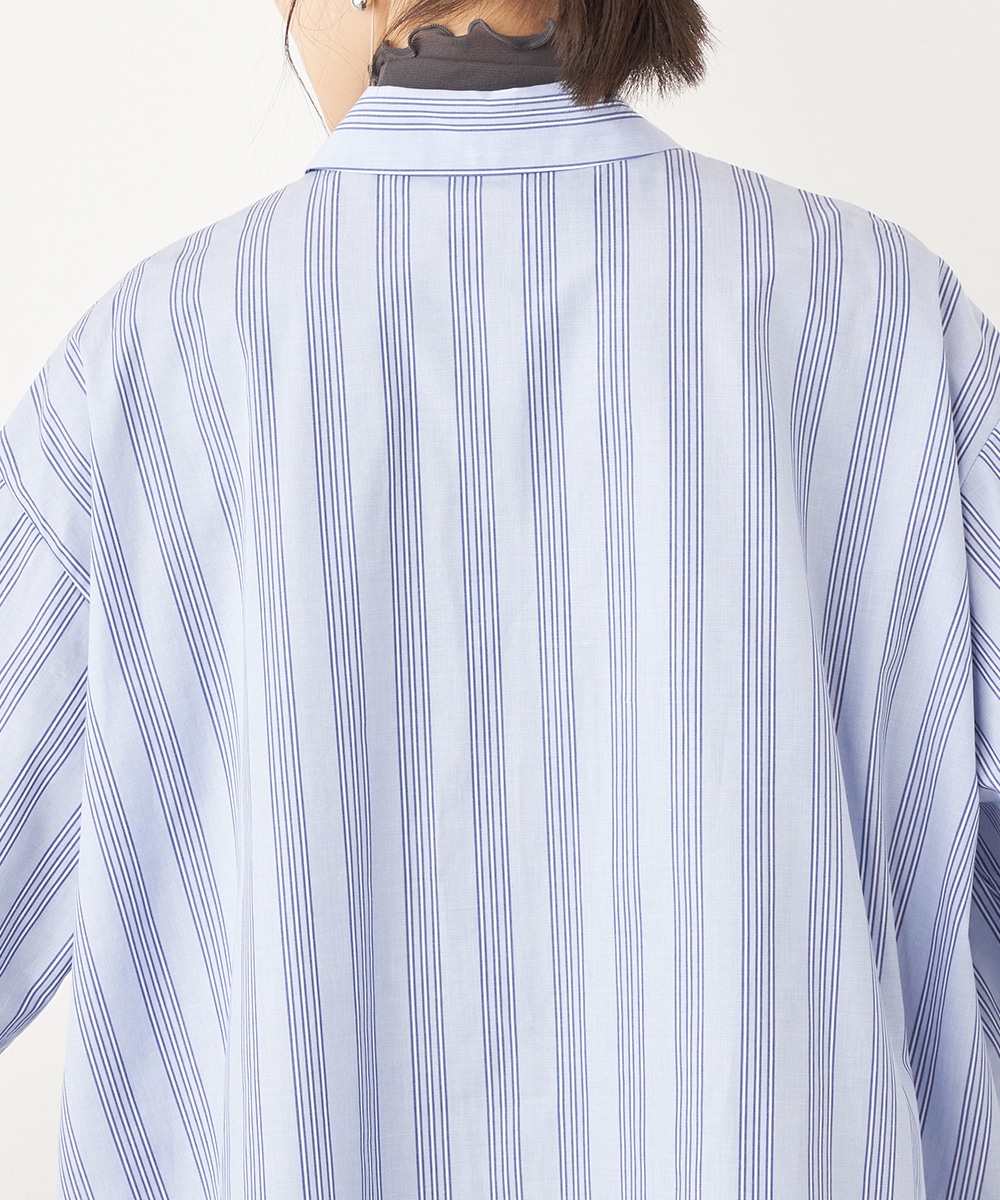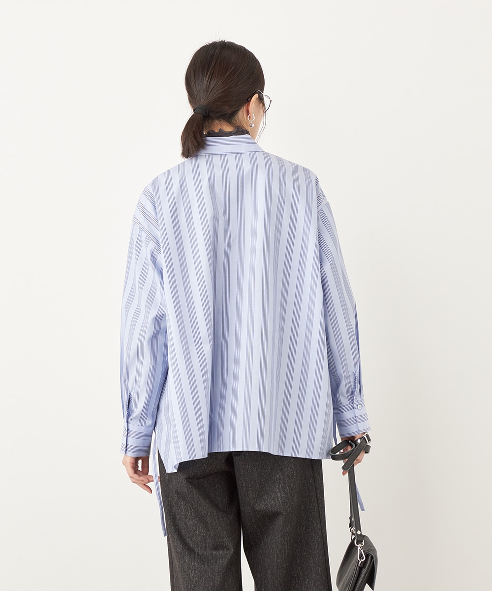 スタイリッシュなストライプ柄。変形シルエットや着丈の前後差がモードな印象のシャツ。