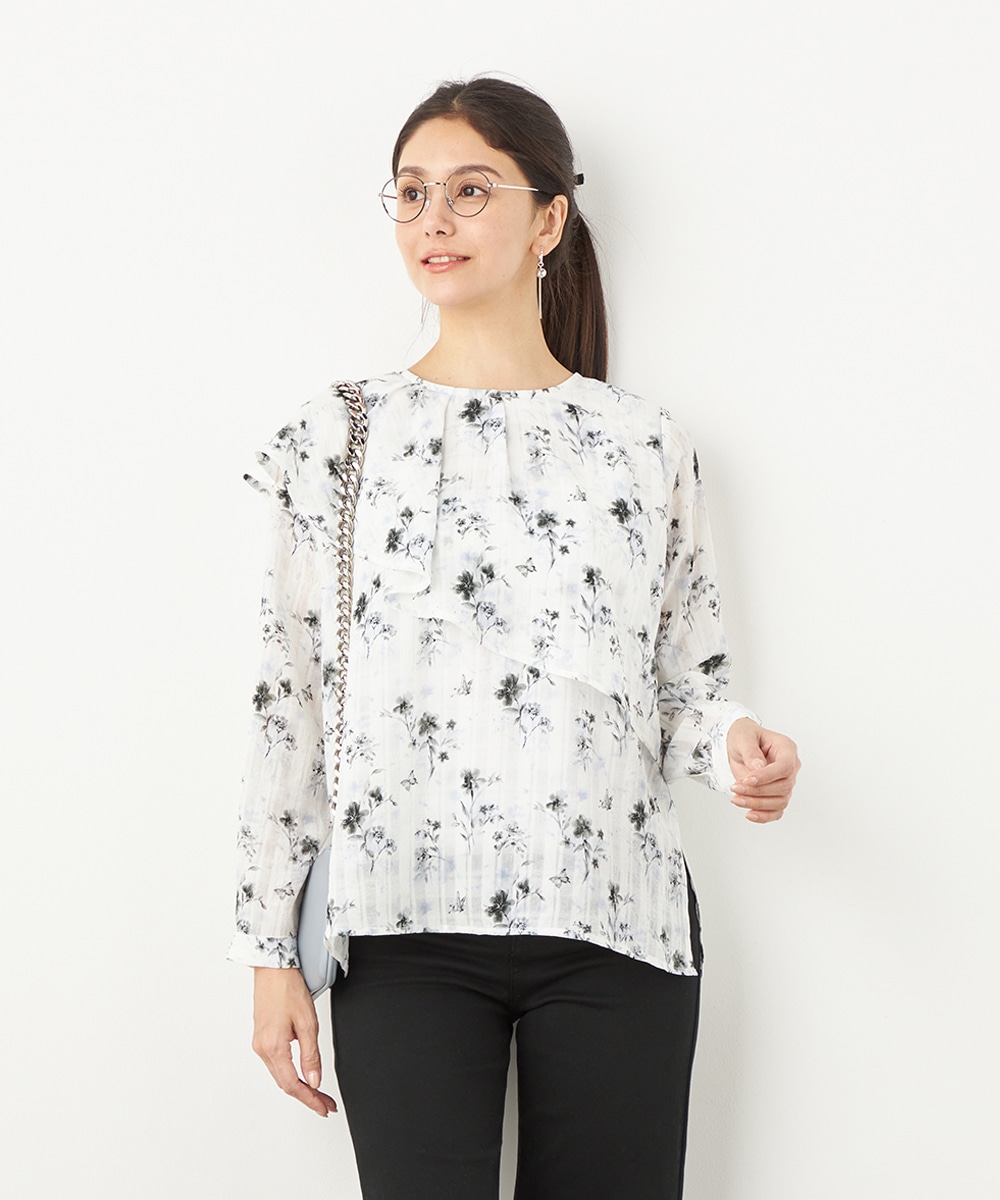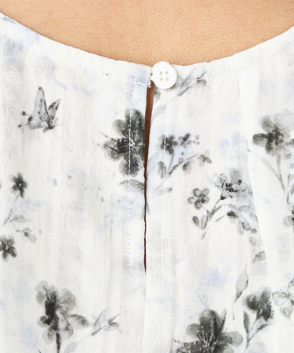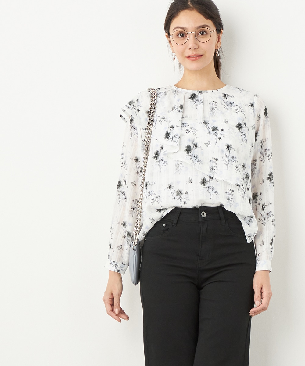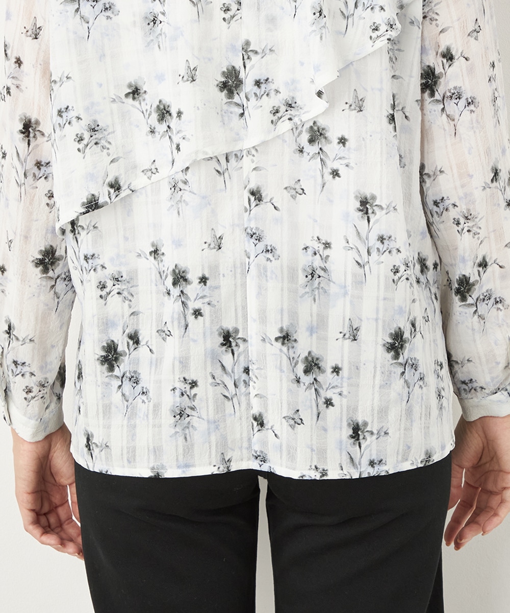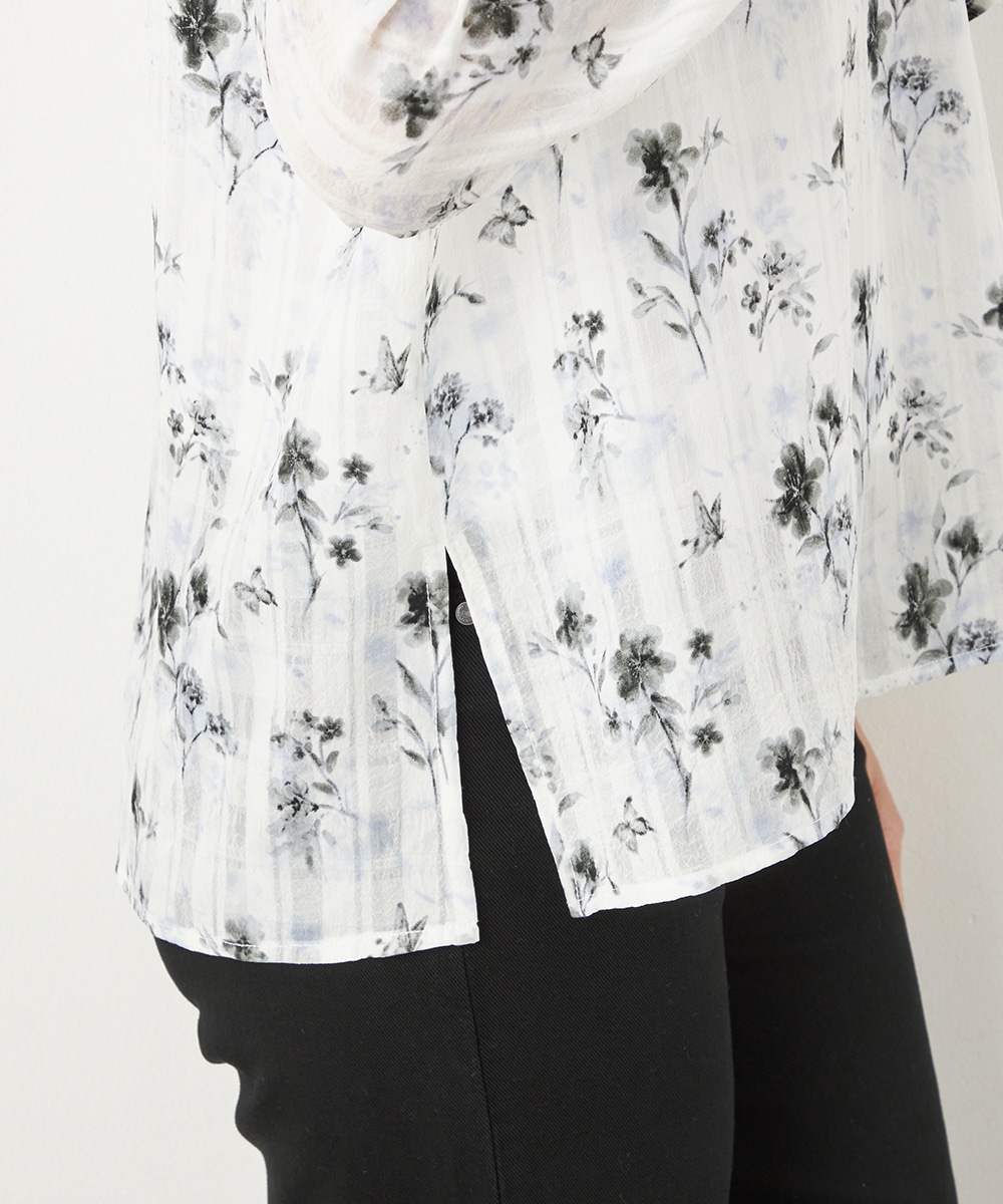 チェックジャカード生地にフラワープリントをオン。立体感のある表情が魅力のブラウス。