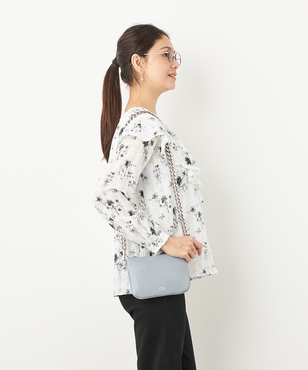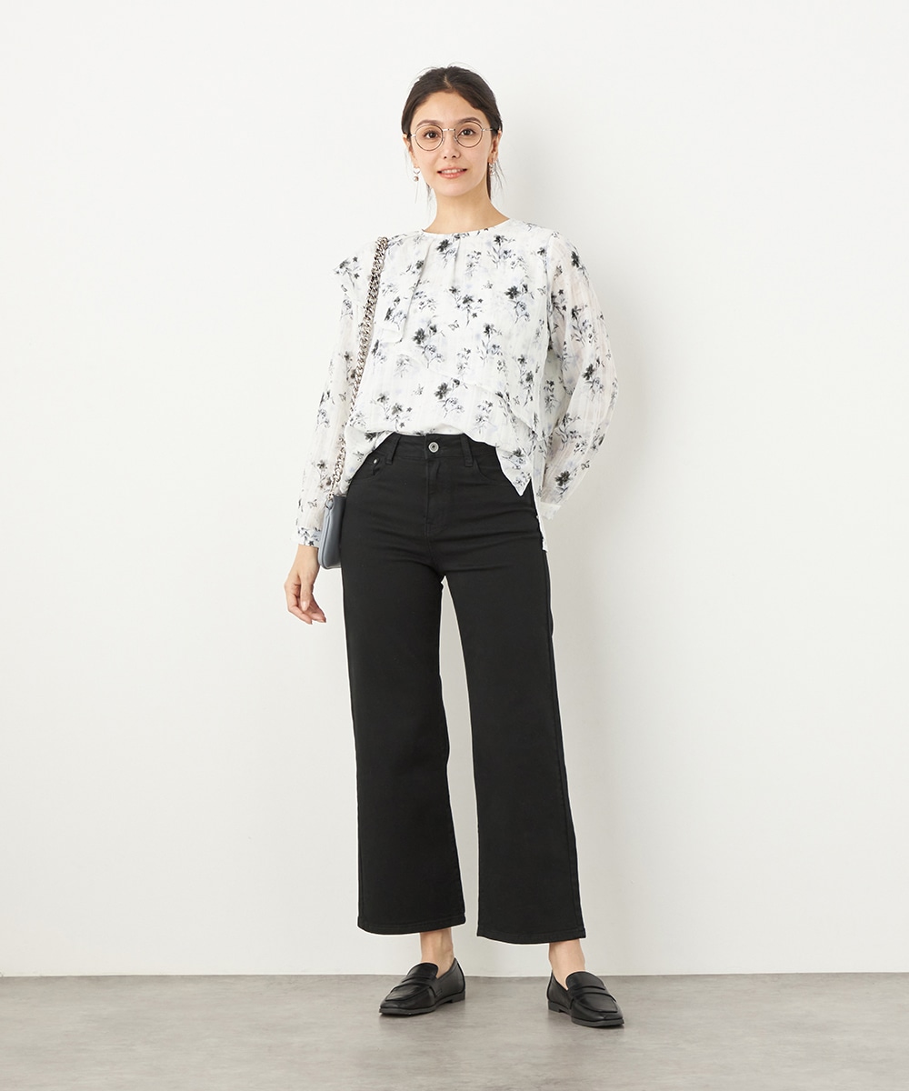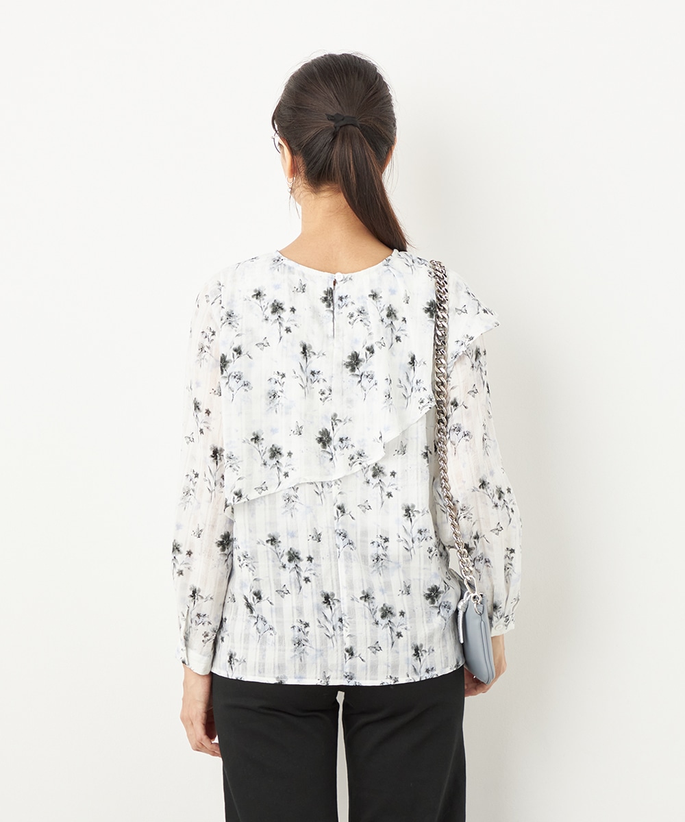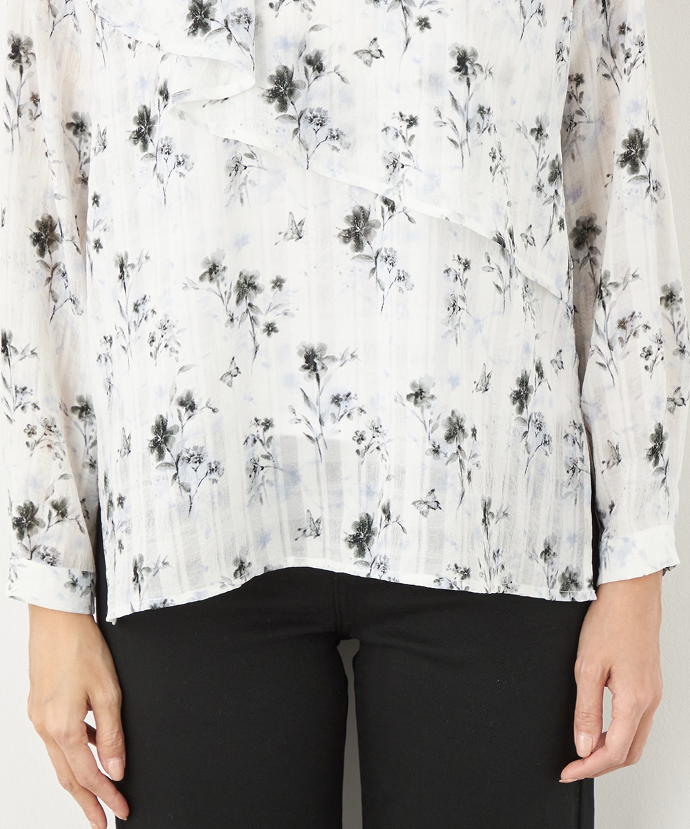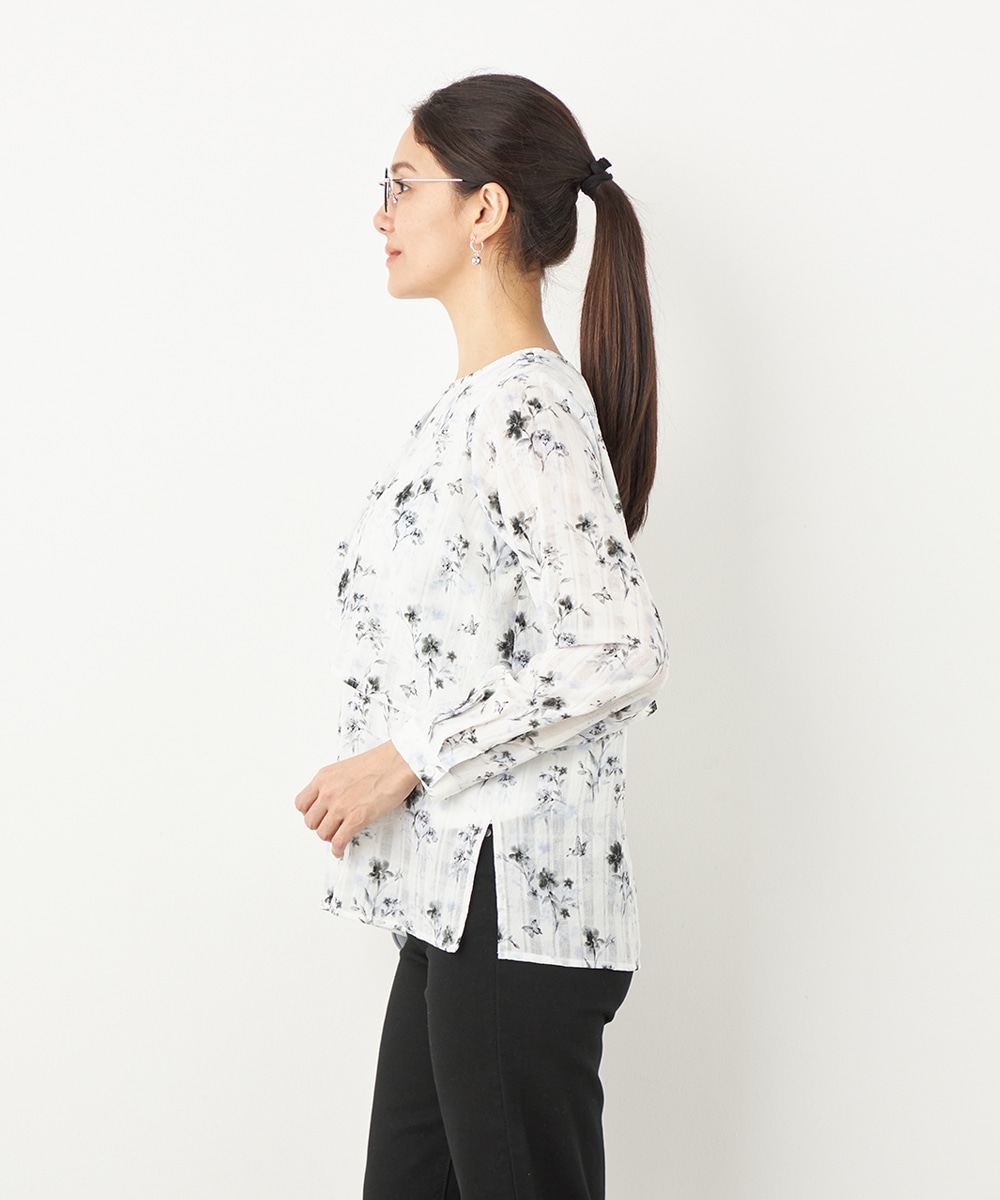 チェックジャカード生地にフラワープリントをオン。立体感のある表情が魅力のブラウス。