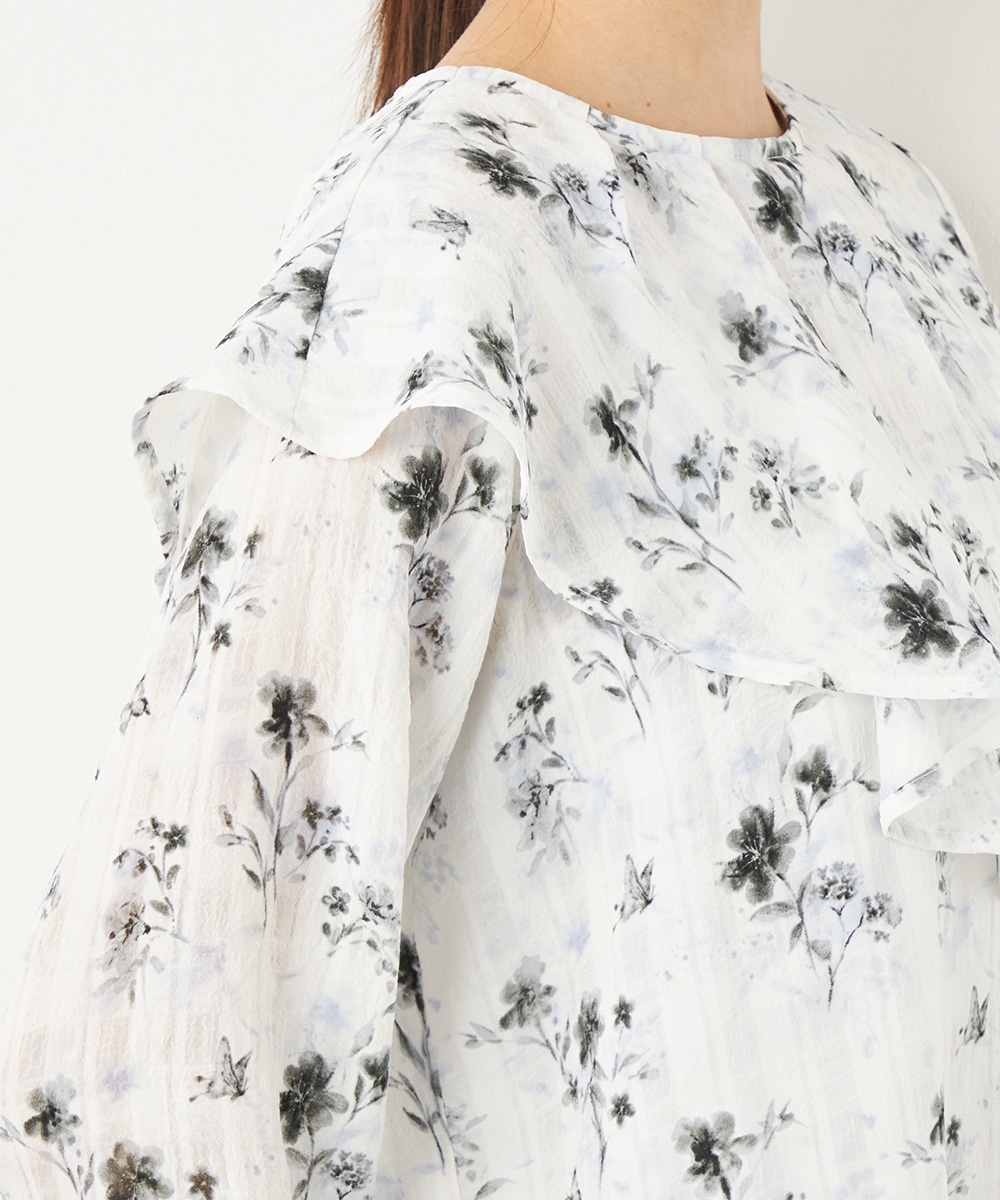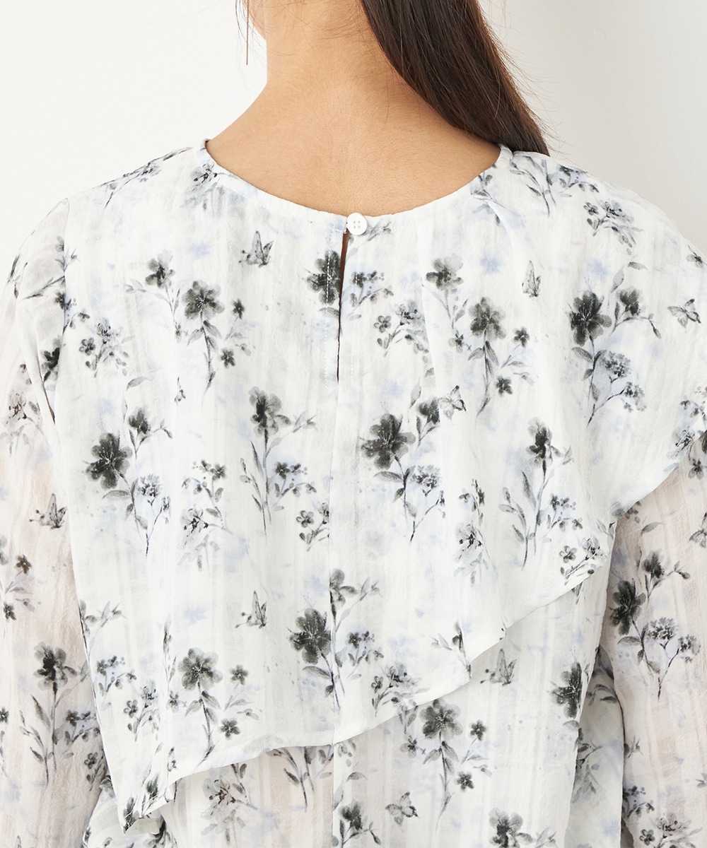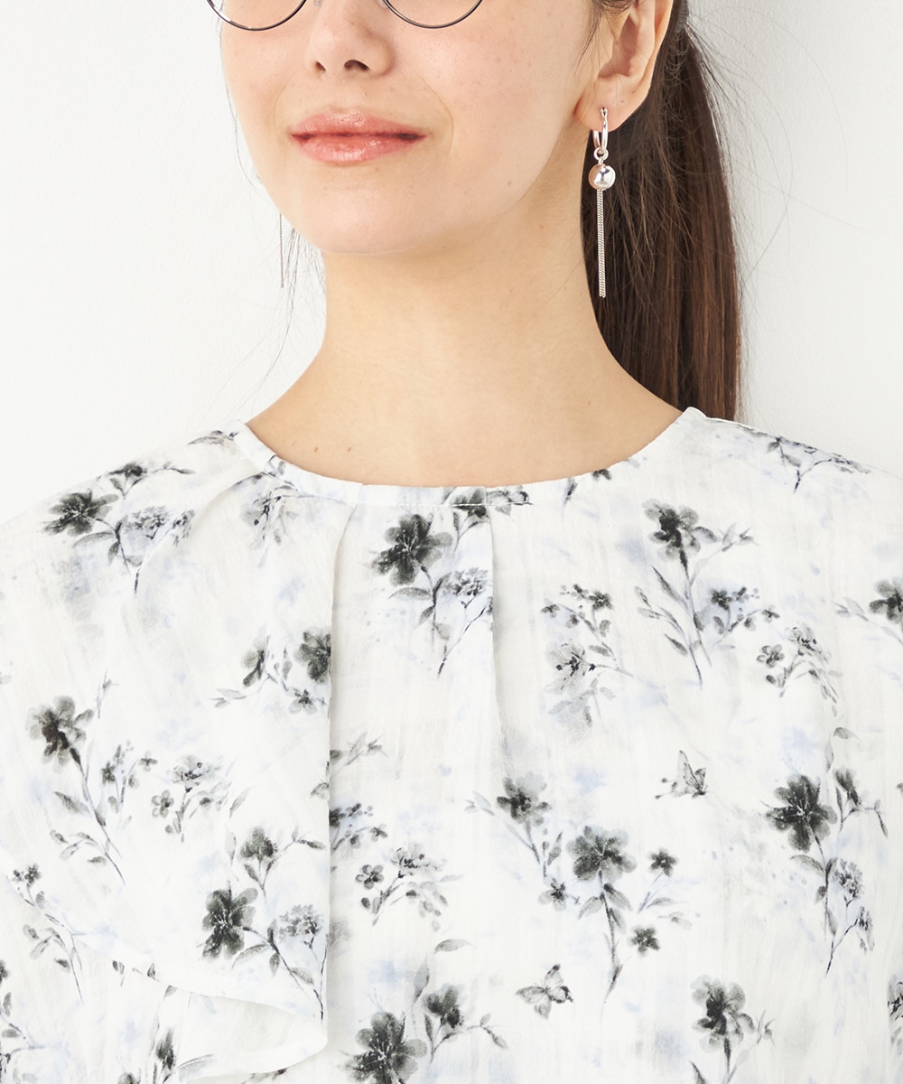 にじみ感の見られる繊細なプリントが優しくナチュラルな雰囲気を演出します。フリルのディテールにより華やかさが増して、1枚で決まるデザインです。アシンメトリーなフォルムのモード感もポイント。シンプルなジャケットやカーディガンのインナーとしても活用できます。