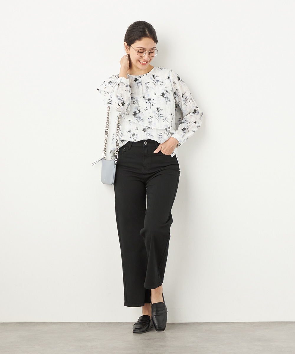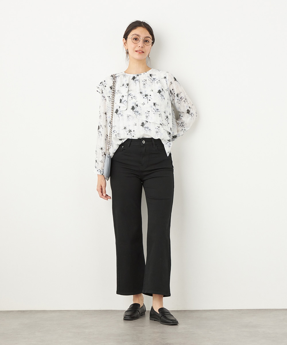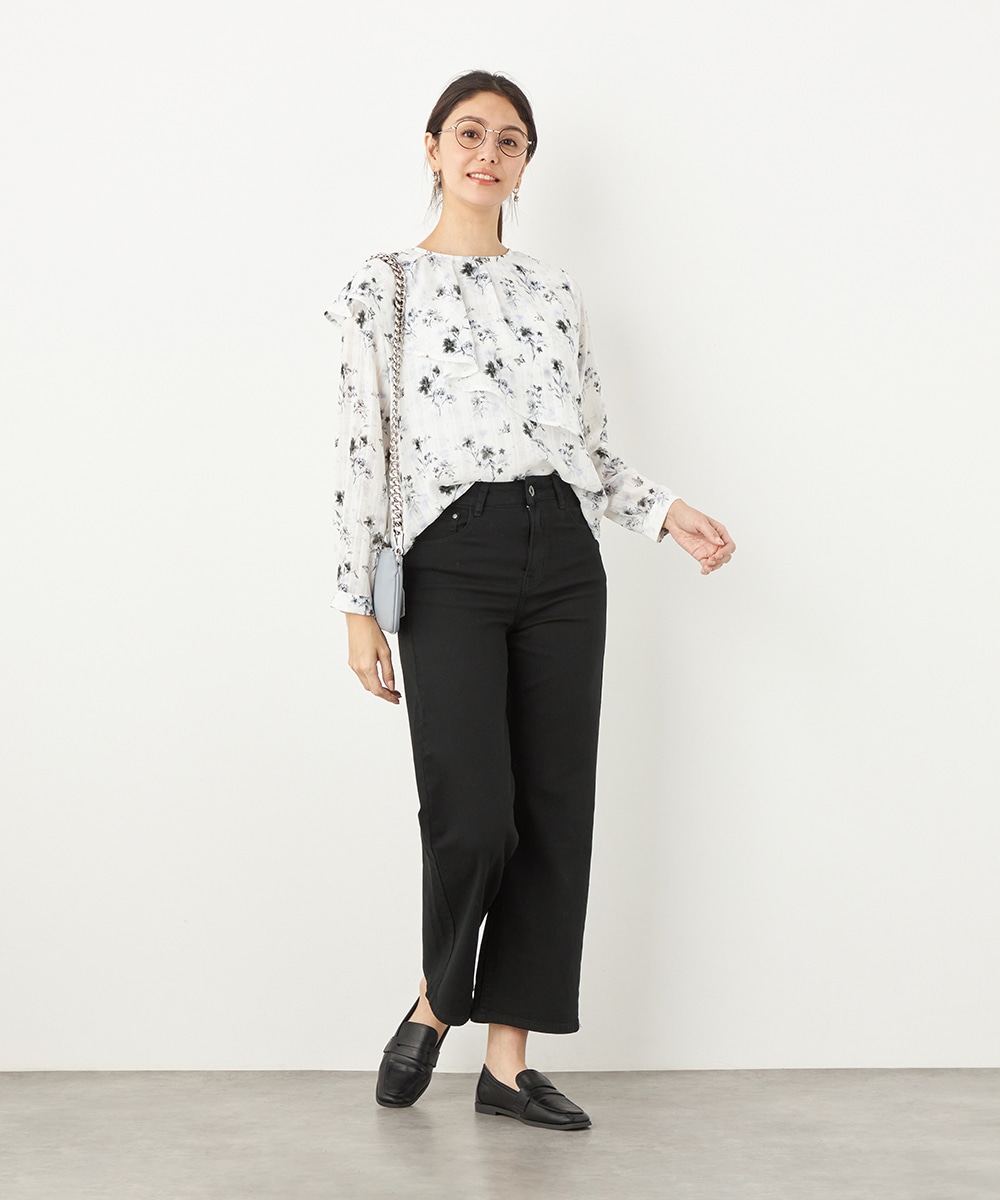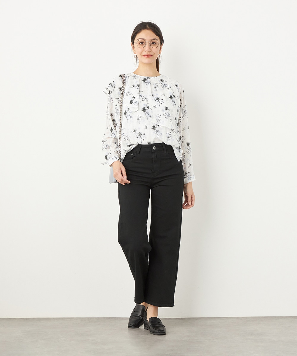 にじみ感の見られる繊細なプリントが優しくナチュラルな雰囲気を演出します。フリルのディテールにより華やかさが増して、1枚で決まるデザインです。アシンメトリーなフォルムのモード感もポイント。シンプルなジャケットやカーディガンのインナーとしても活用できます。