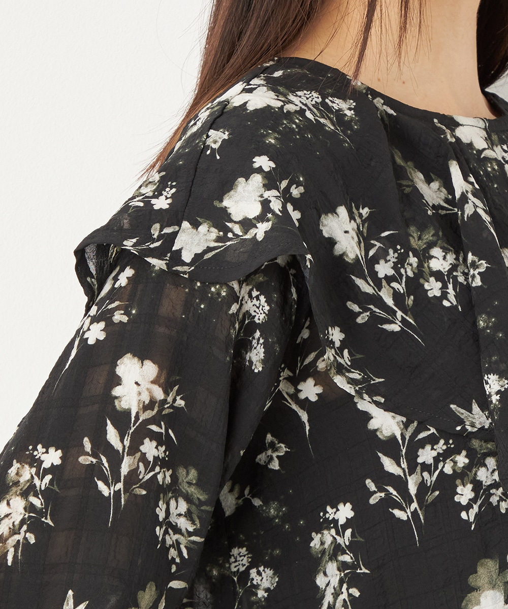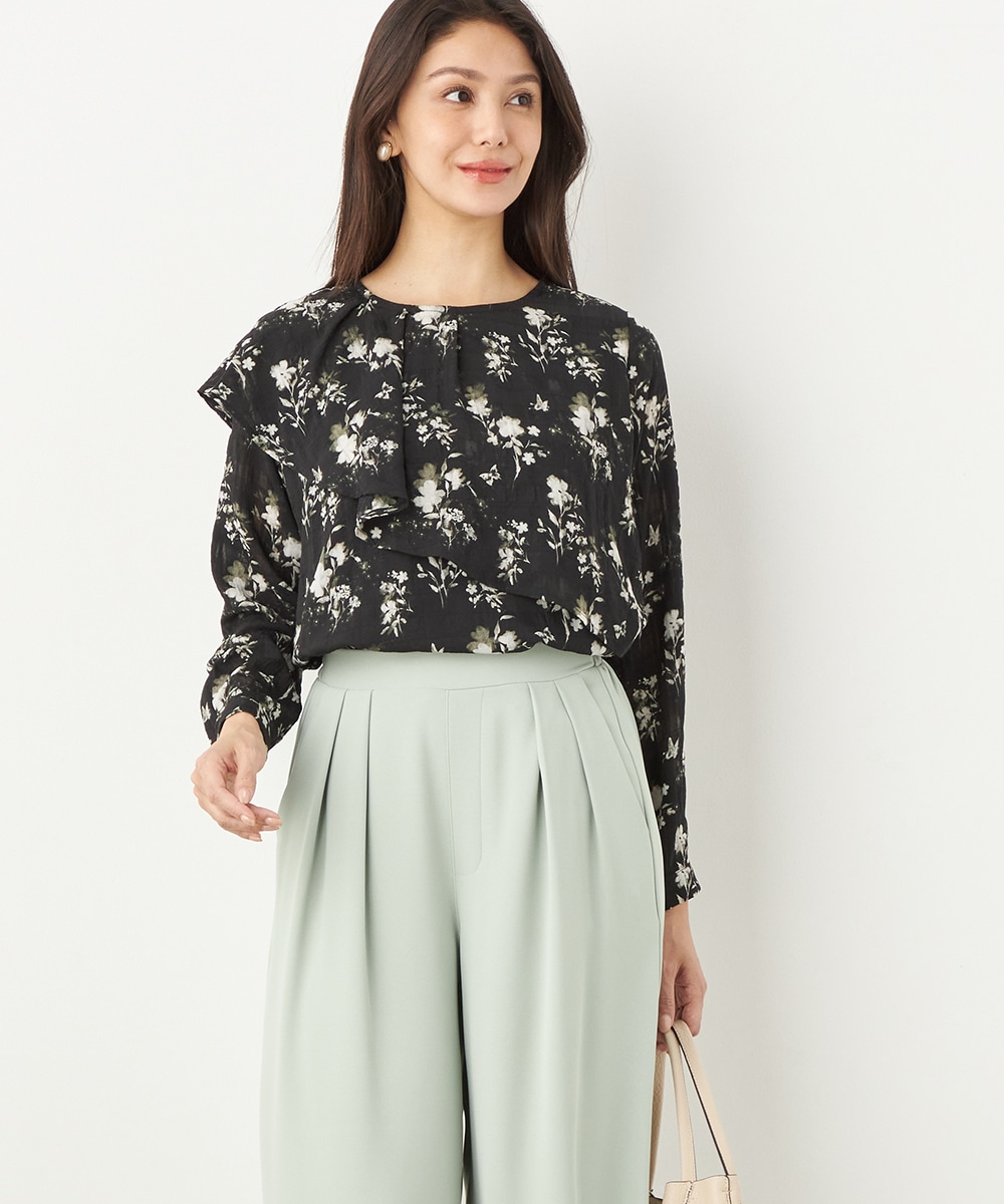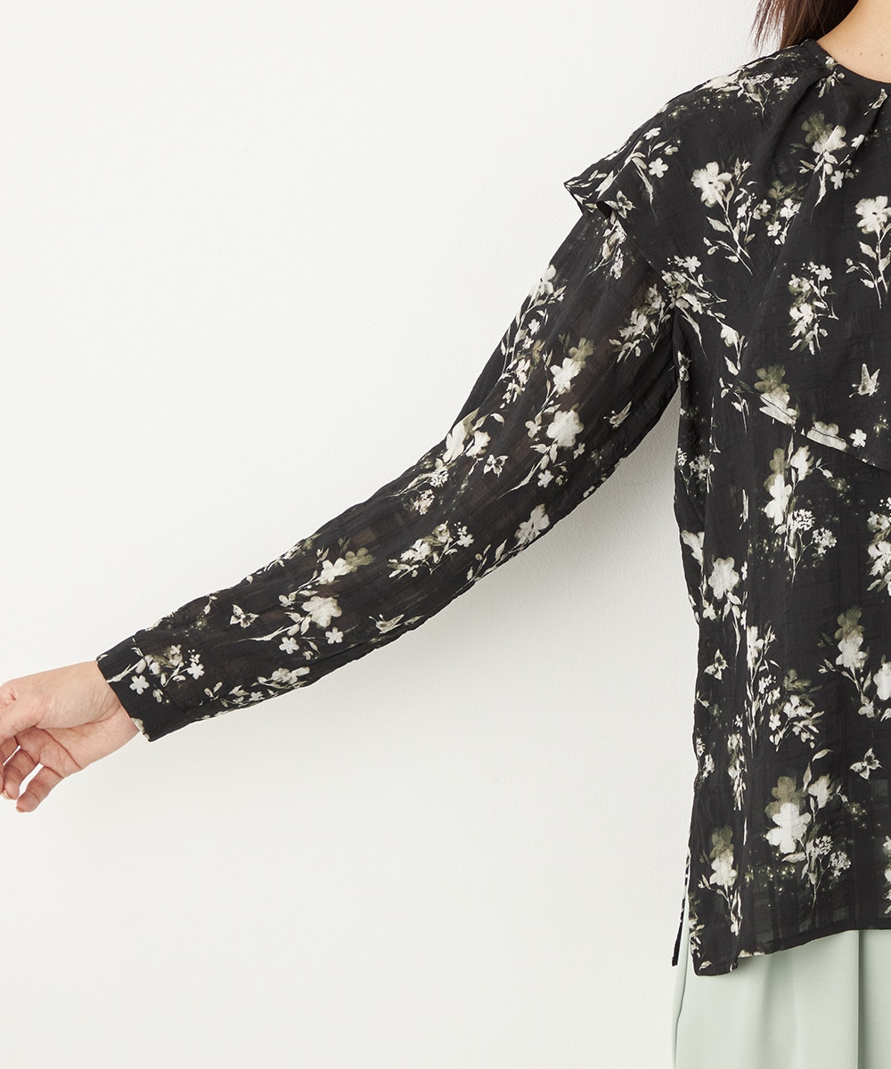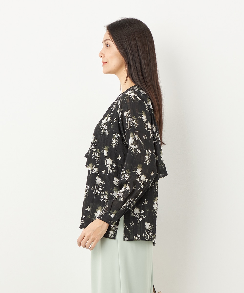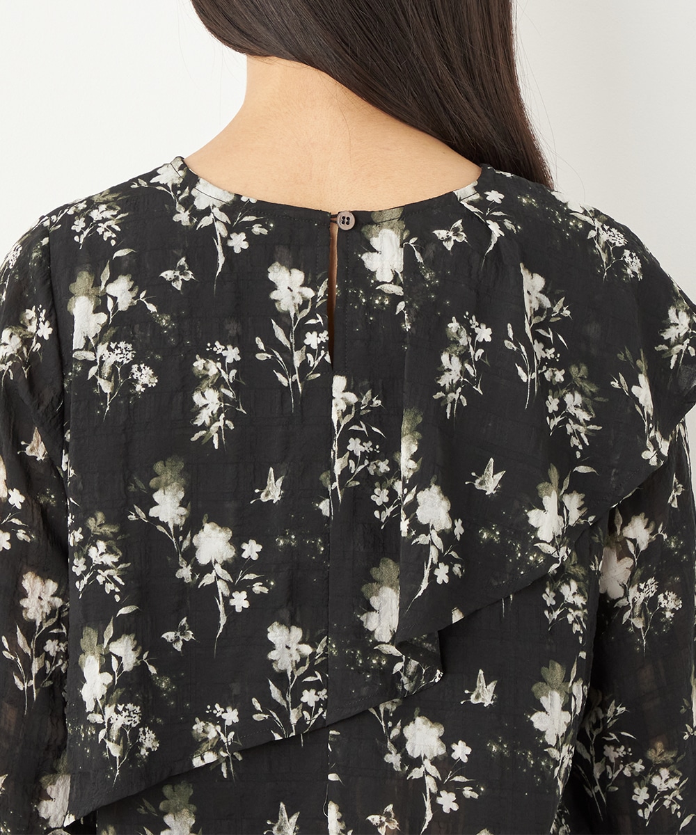 にじみ感の見られる繊細なプリントが優しくナチュラルな雰囲気を演出します。フリルのディテールにより華やかさが増して、1枚で決まるデザインです。アシンメトリーなフォルムのモード感もポイント。シンプルなジャケットやカーディガンのインナーとしても活用できます。