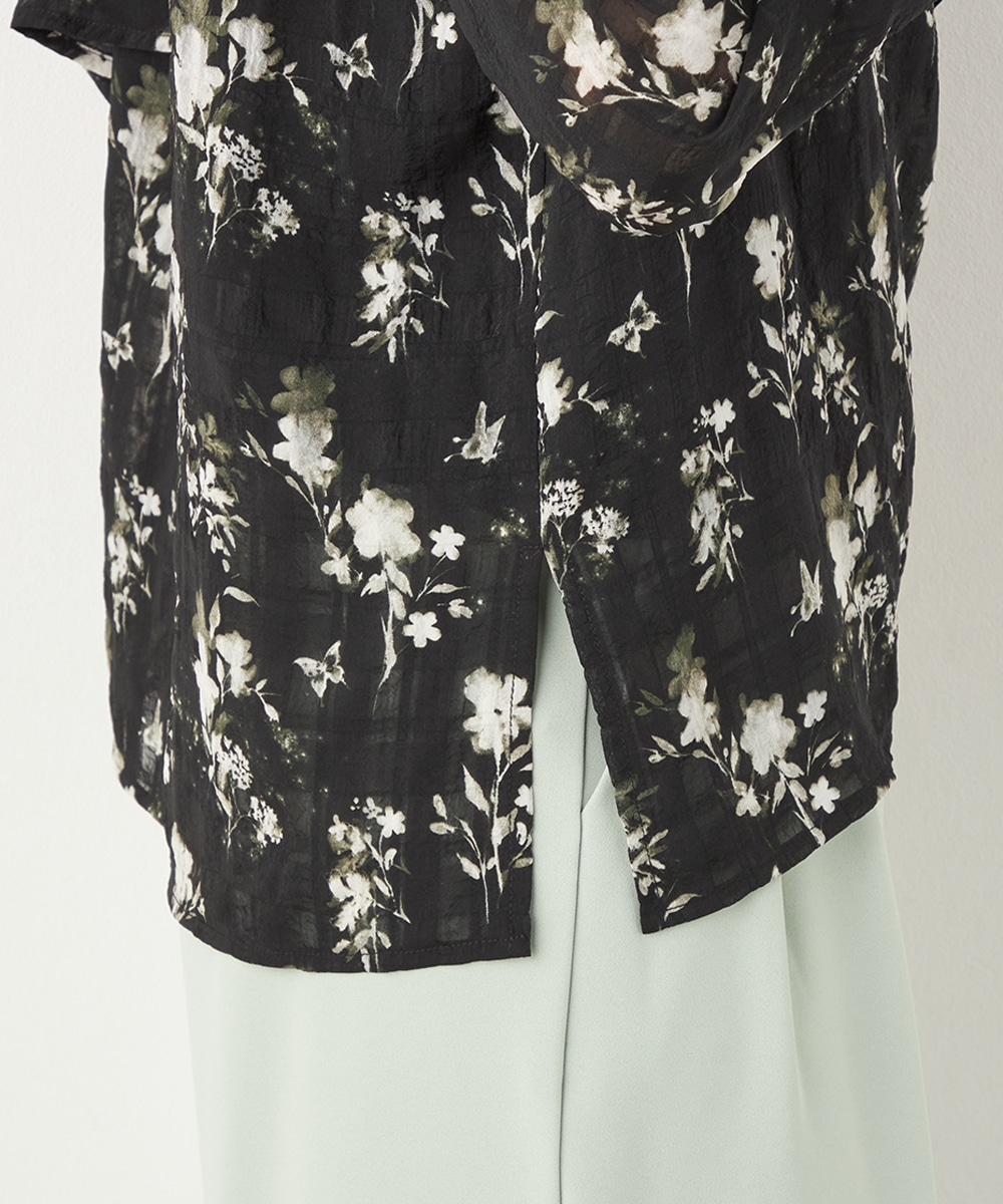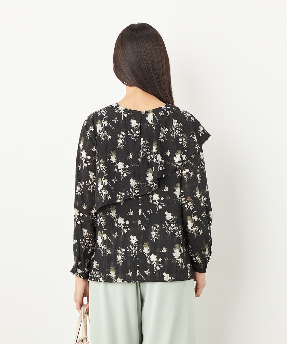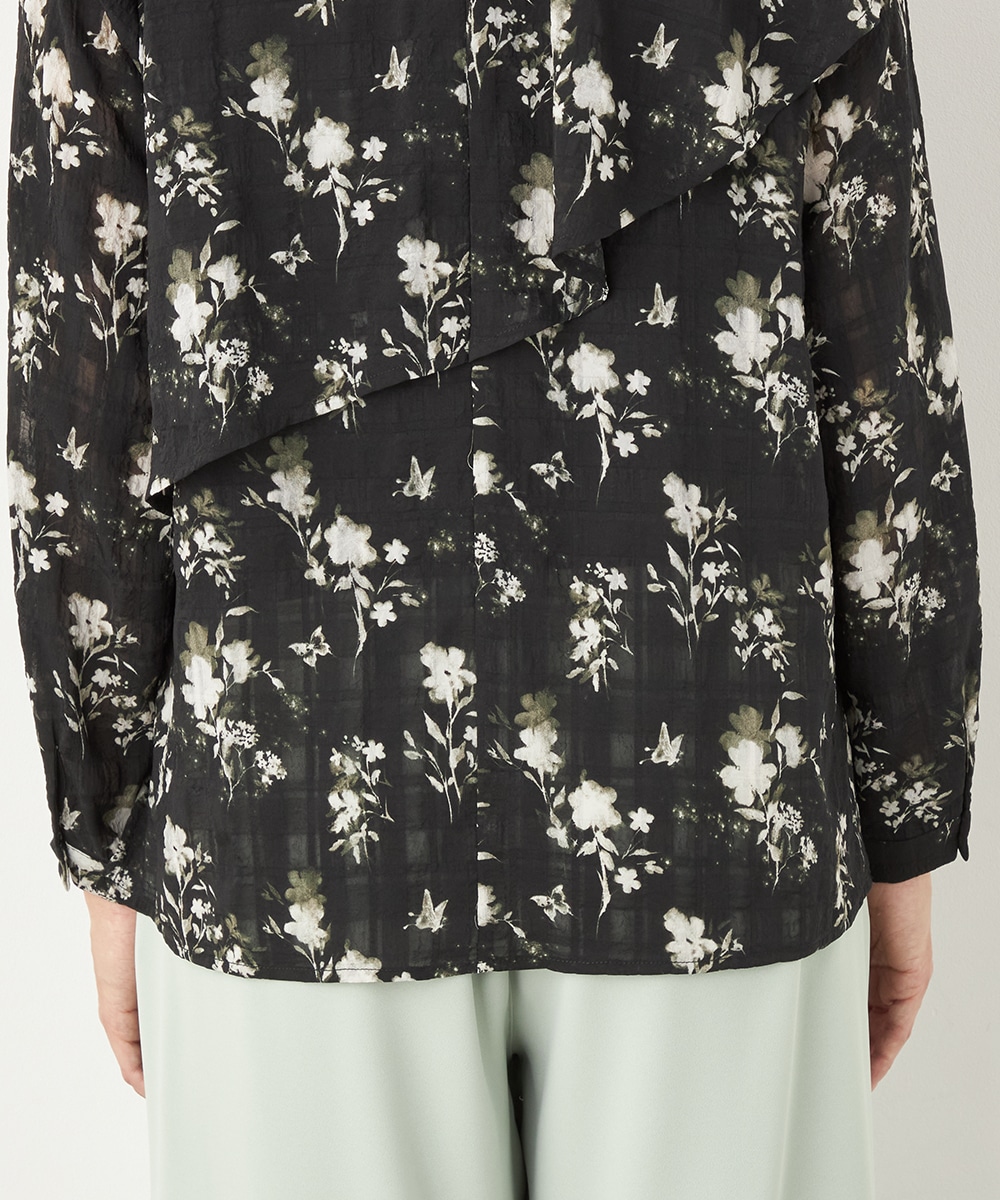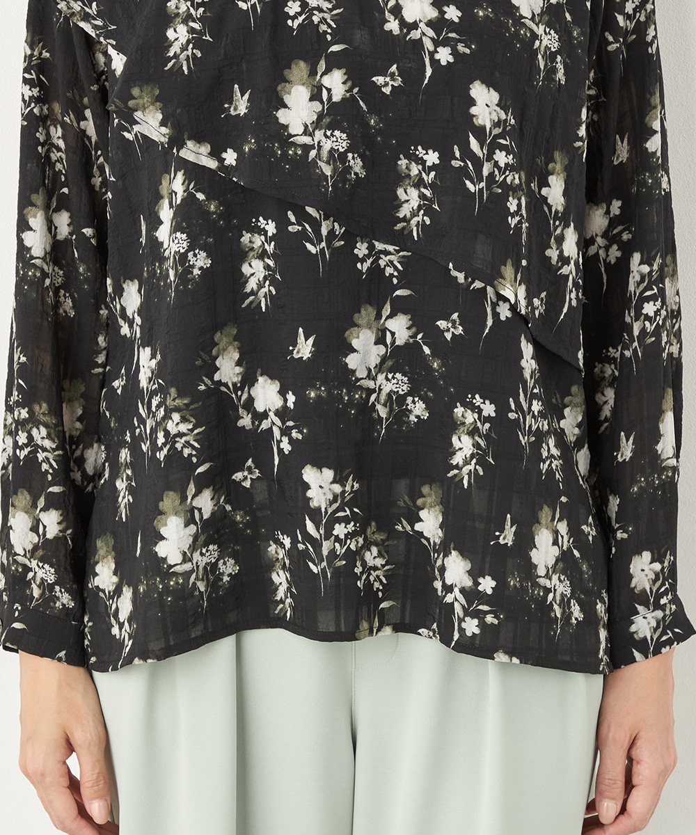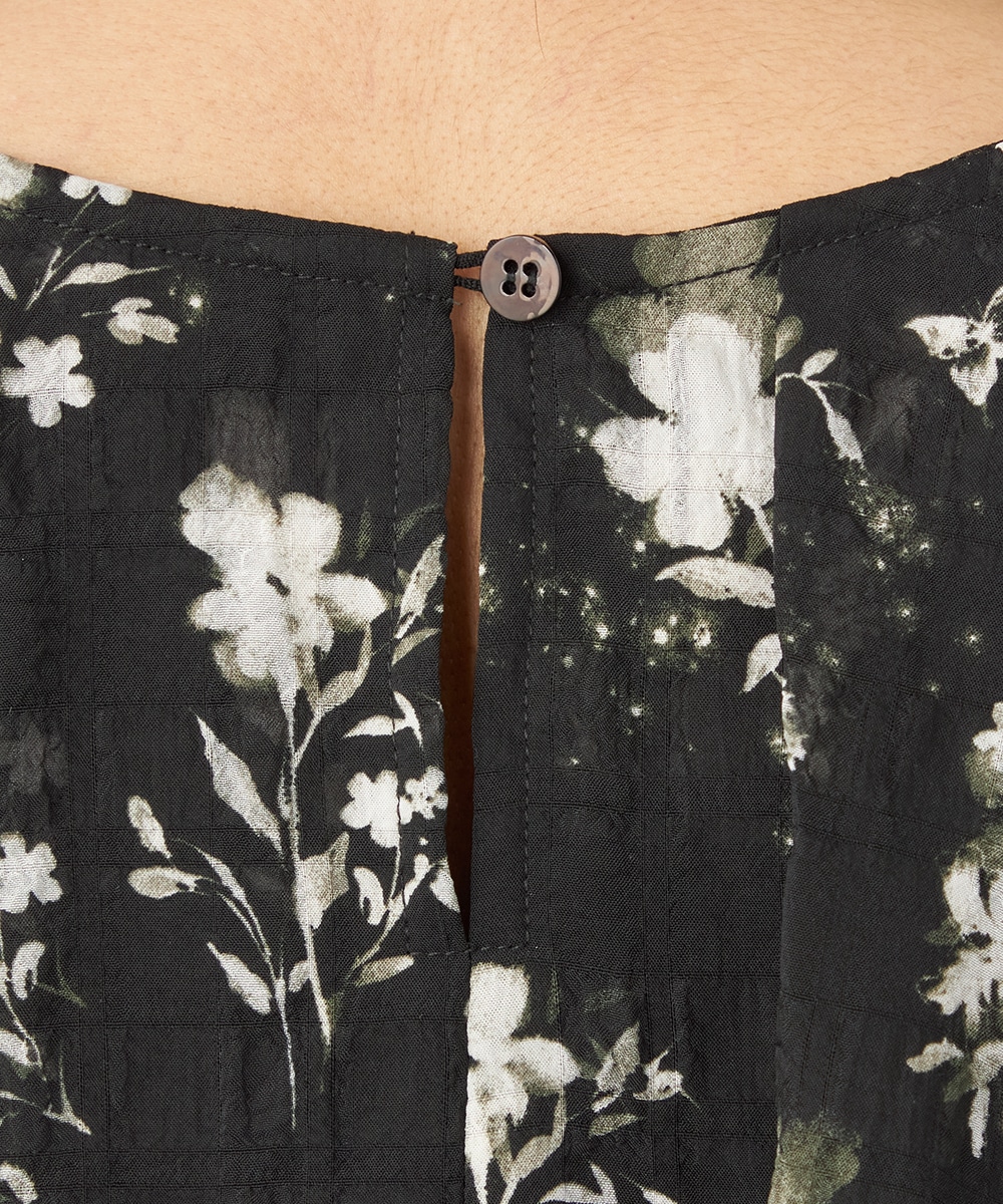 にじみ感の見られる繊細なプリントが優しくナチュラルな雰囲気を演出します。フリルのディテールにより華やかさが増して、1枚で決まるデザインです。アシンメトリーなフォルムのモード感もポイント。シンプルなジャケットやカーディガンのインナーとしても活用できます。