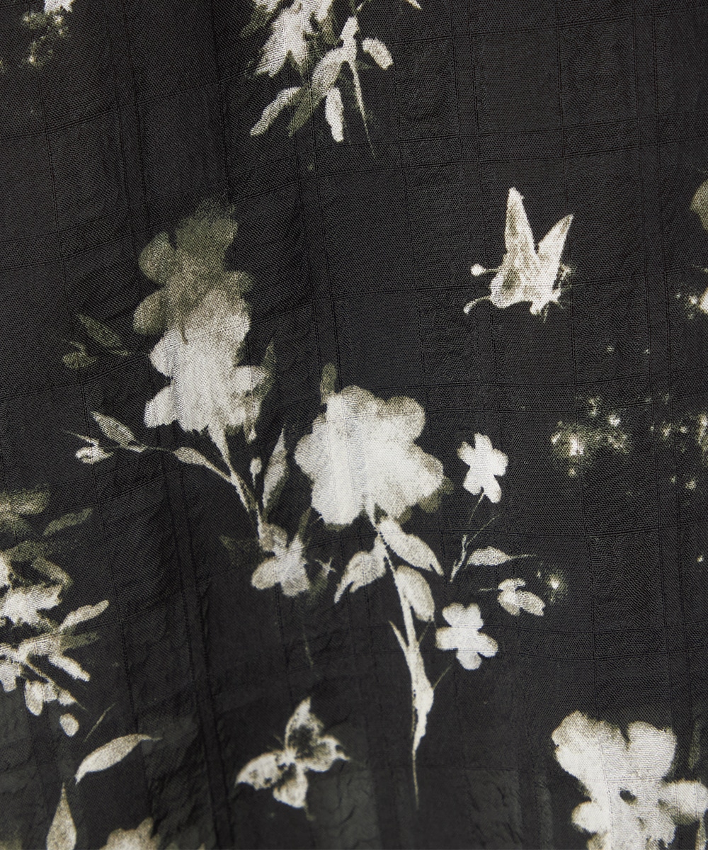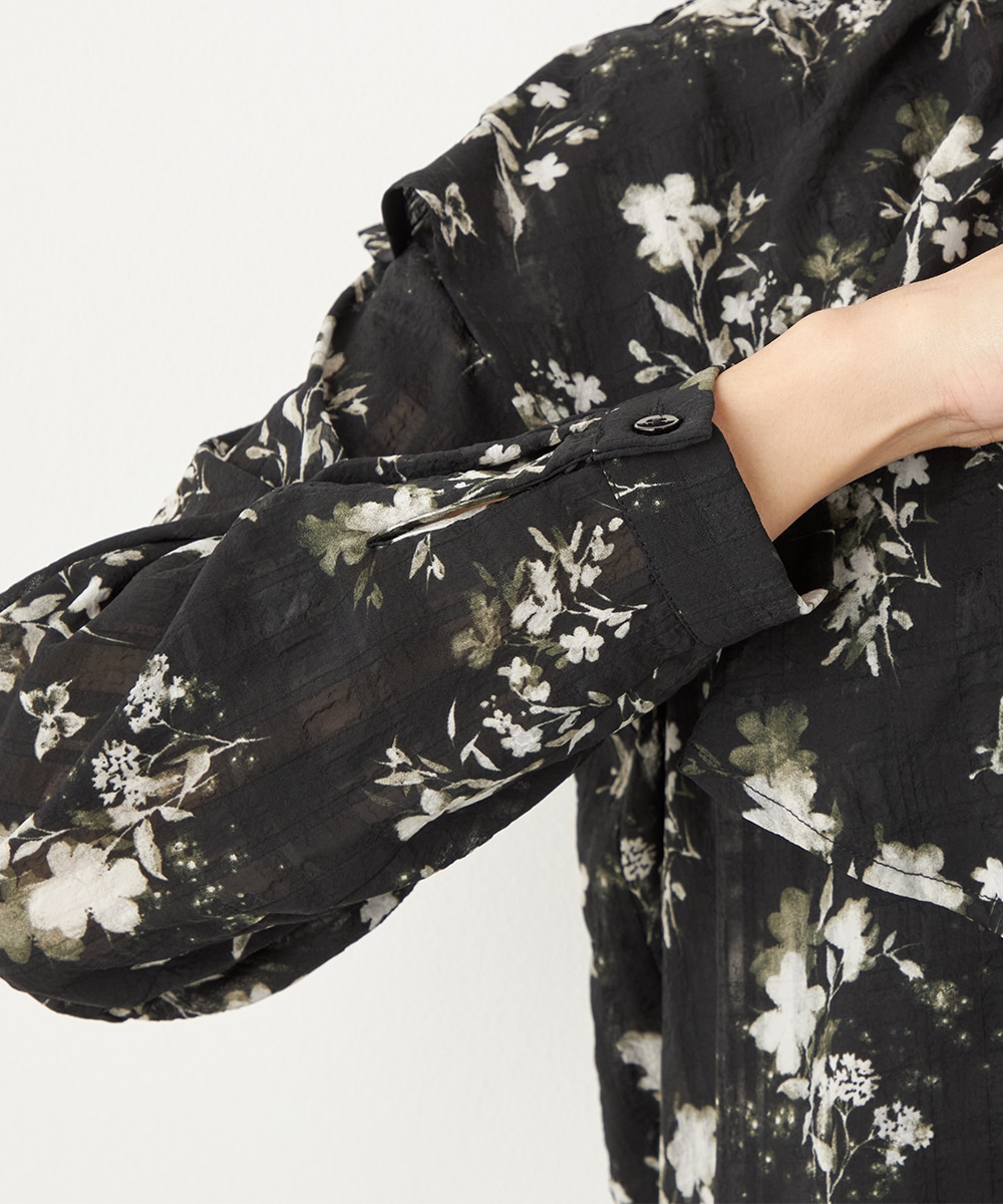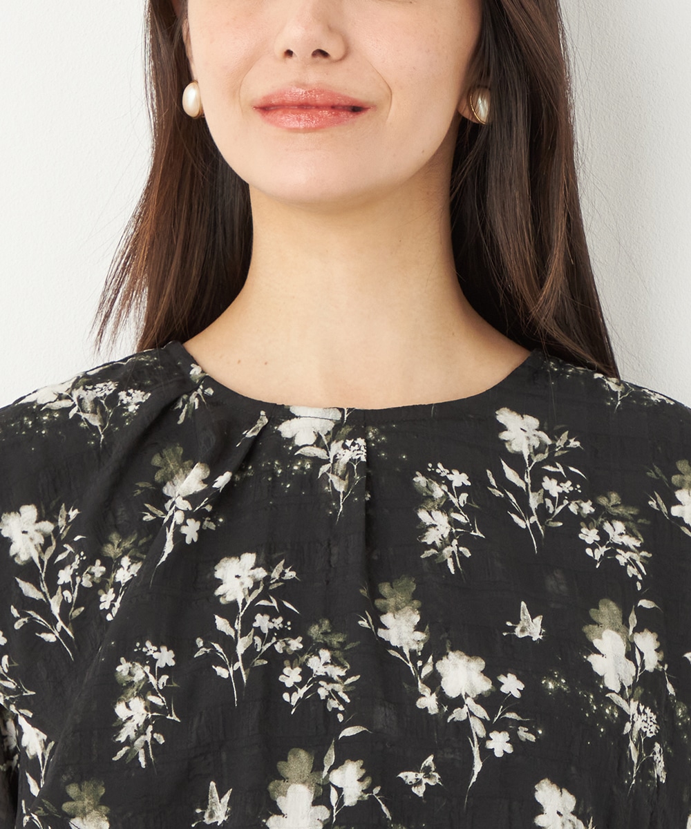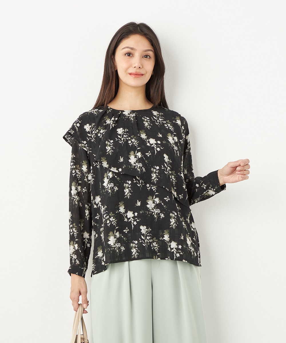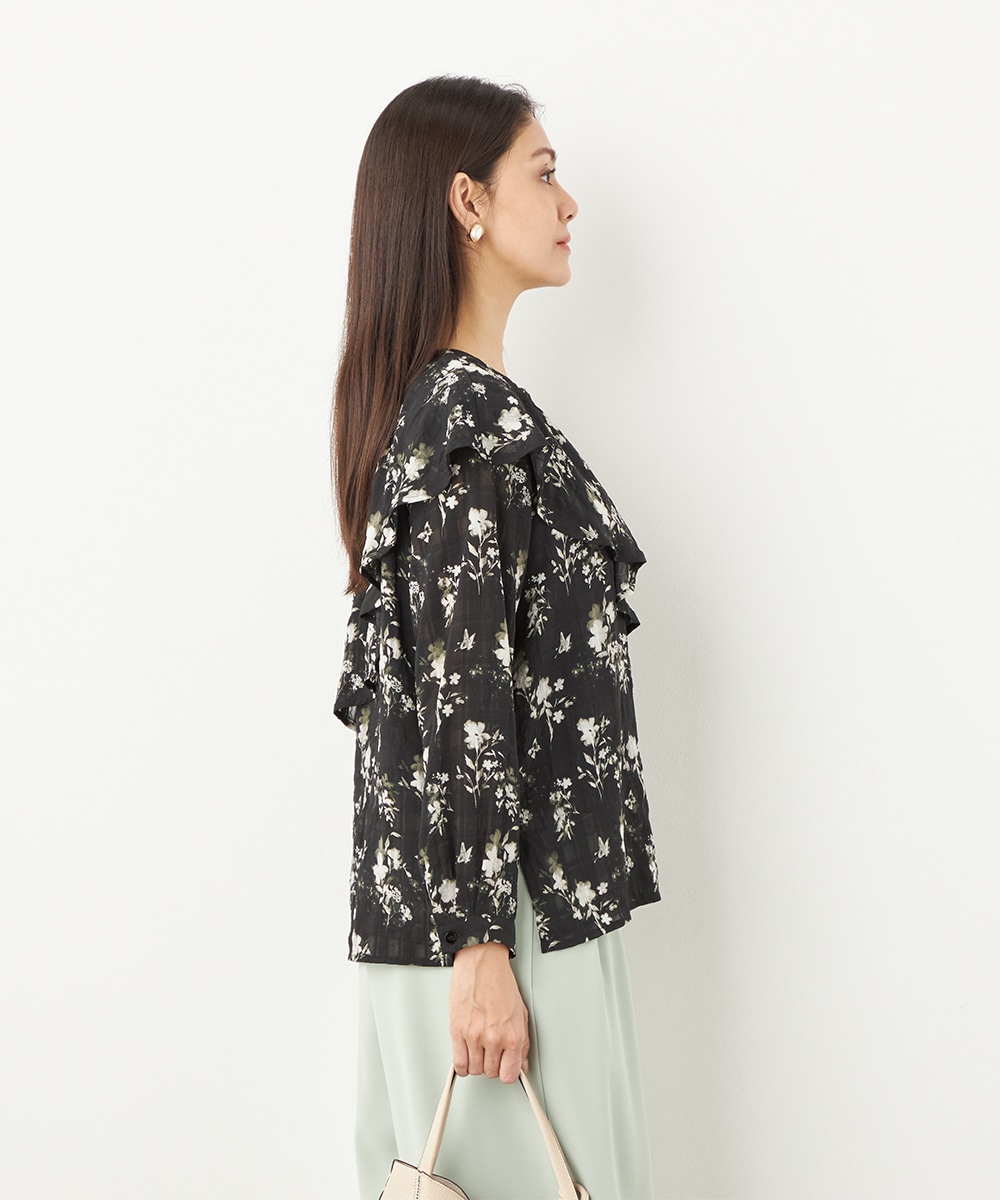 にじみ感の見られる繊細なプリントが優しくナチュラルな雰囲気を演出します。フリルのディテールにより華やかさが増して、1枚で決まるデザインです。アシンメトリーなフォルムのモード感もポイント。シンプルなジャケットやカーディガンのインナーとしても活用できます。