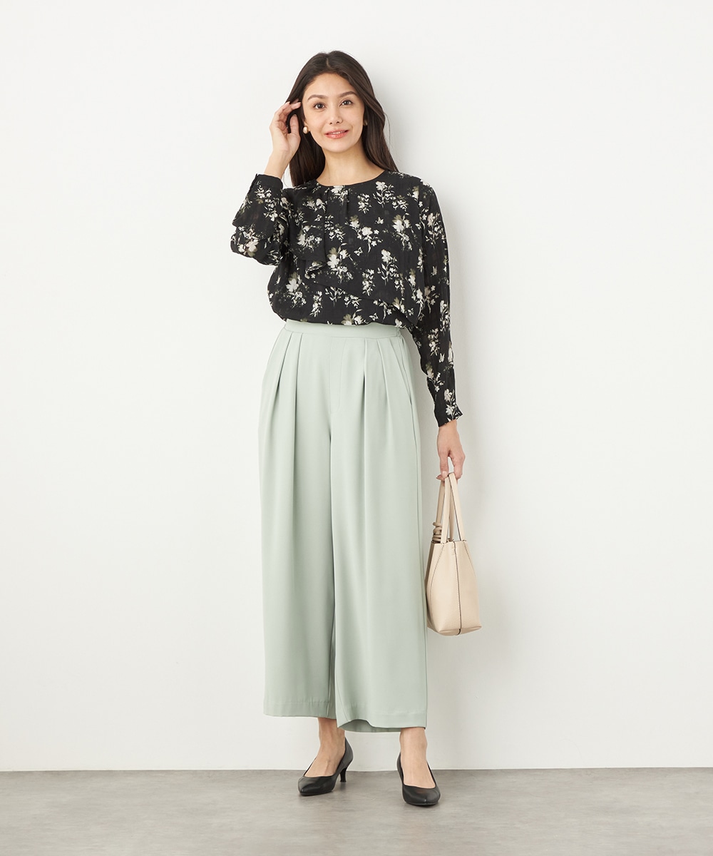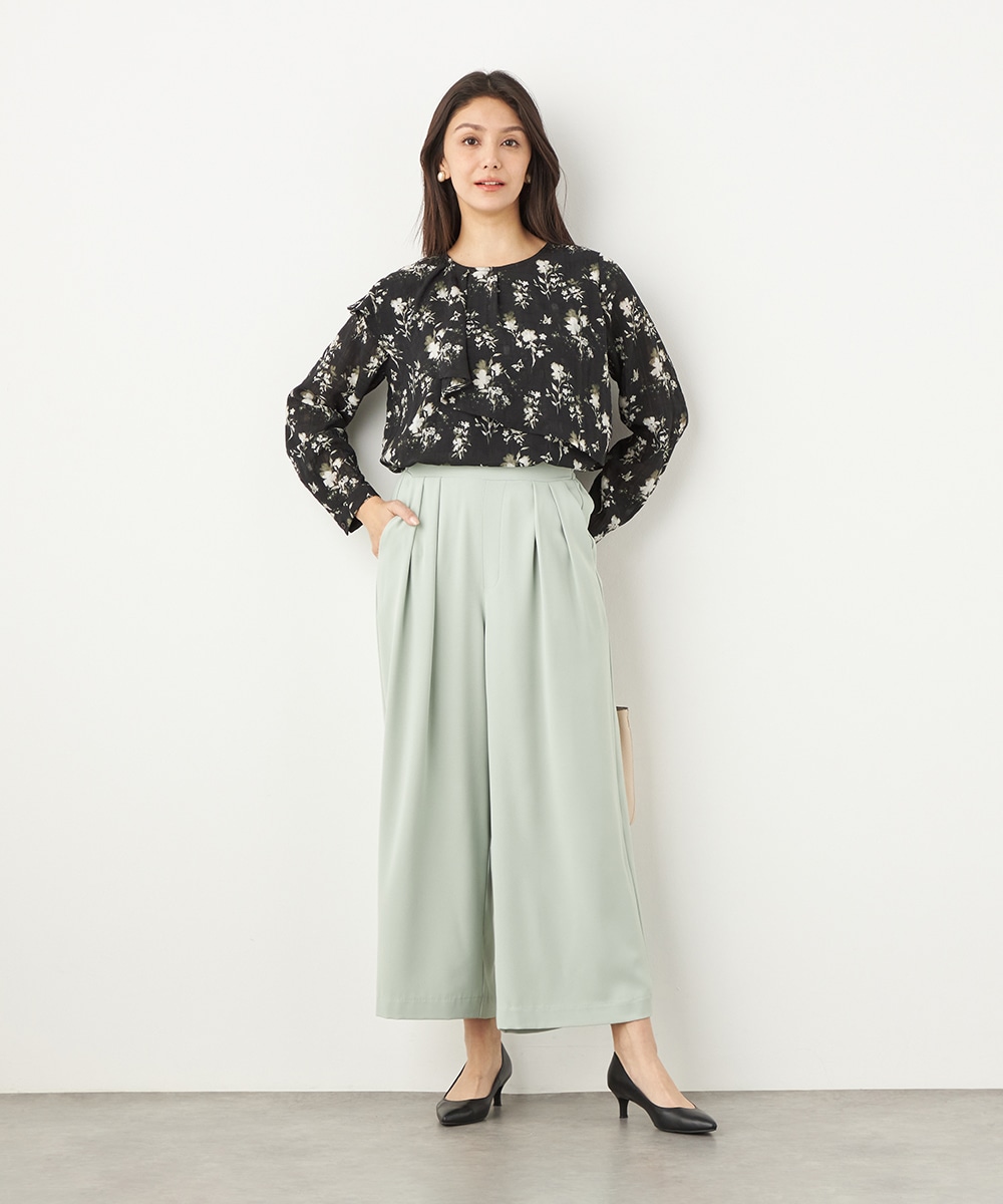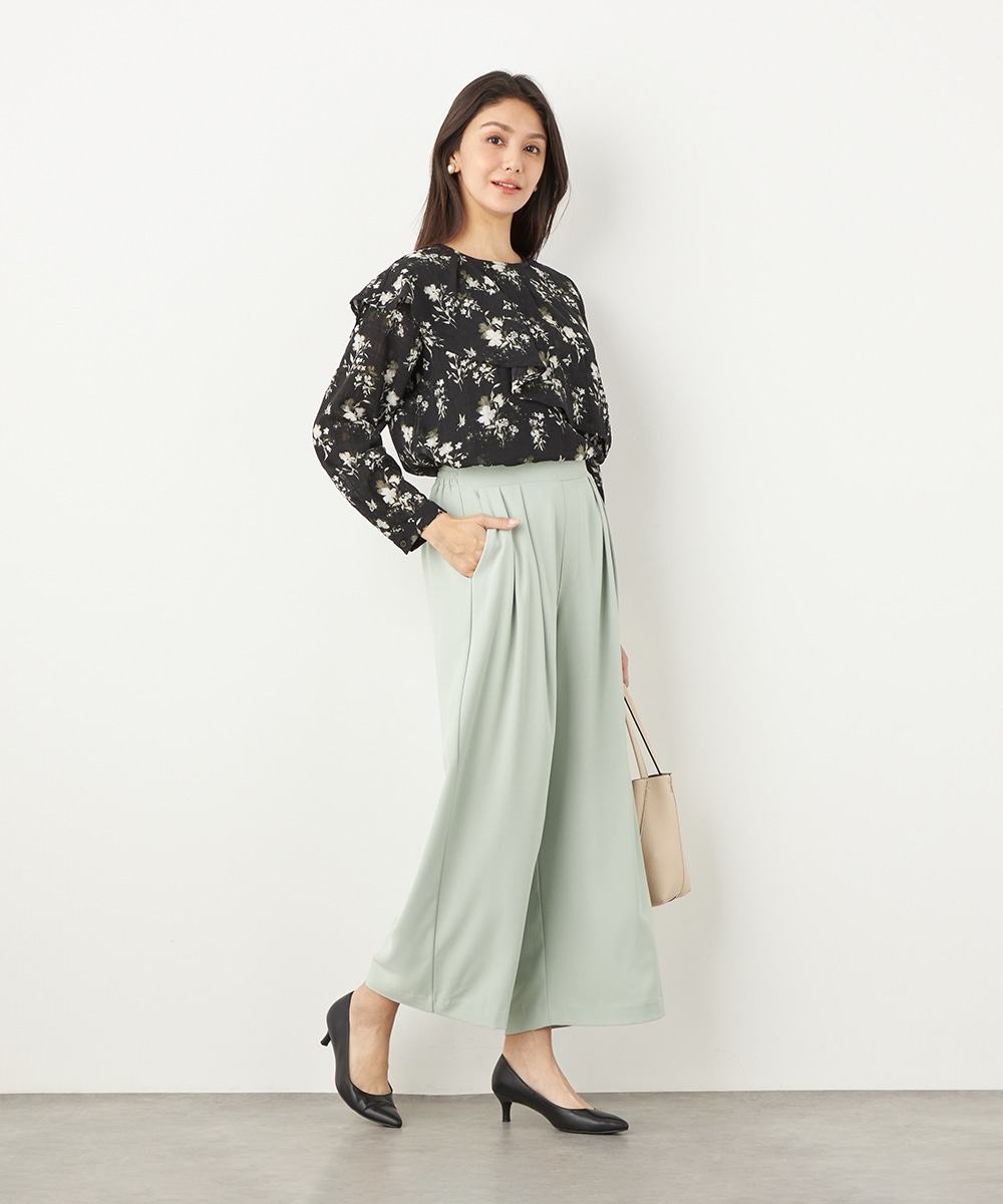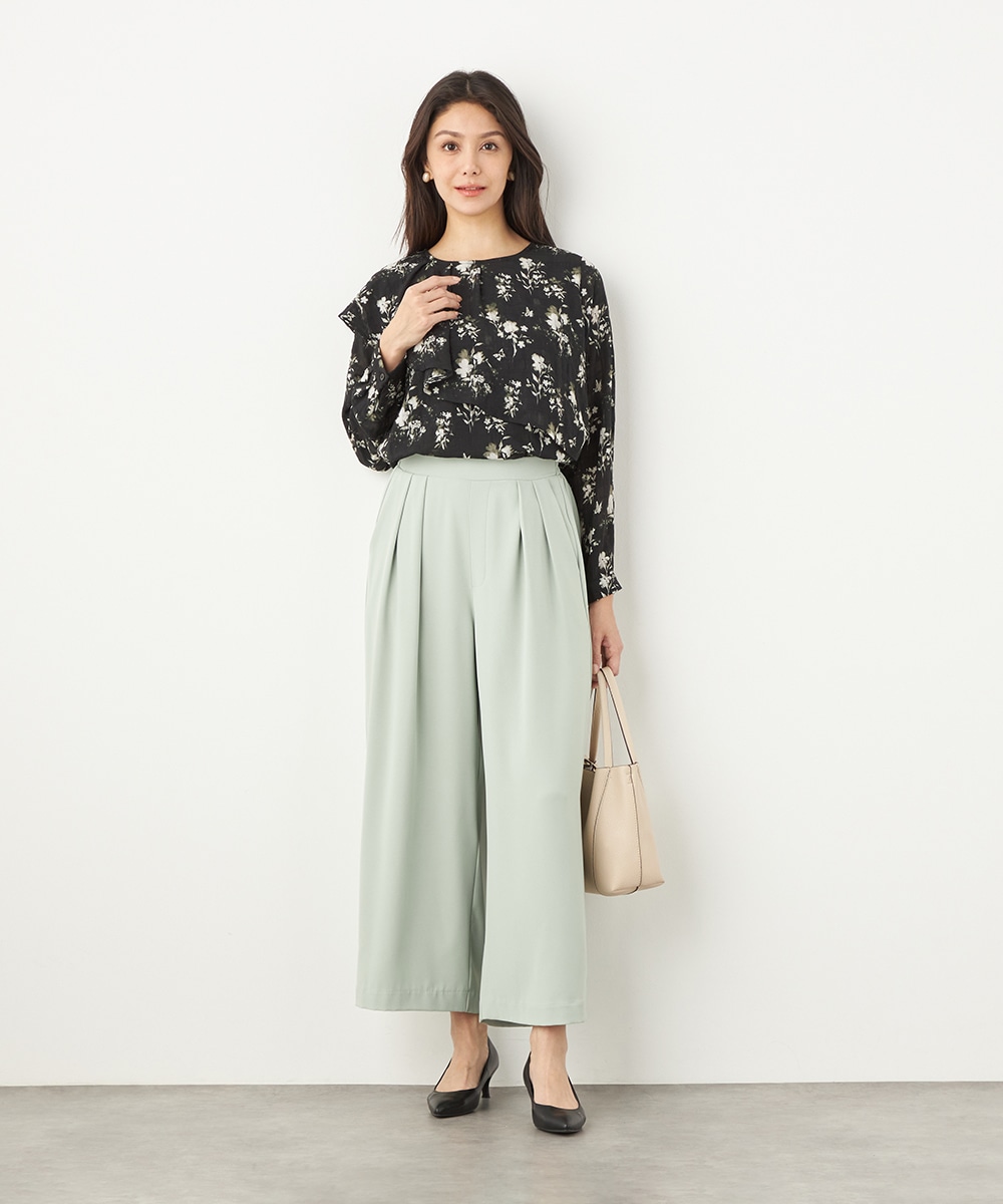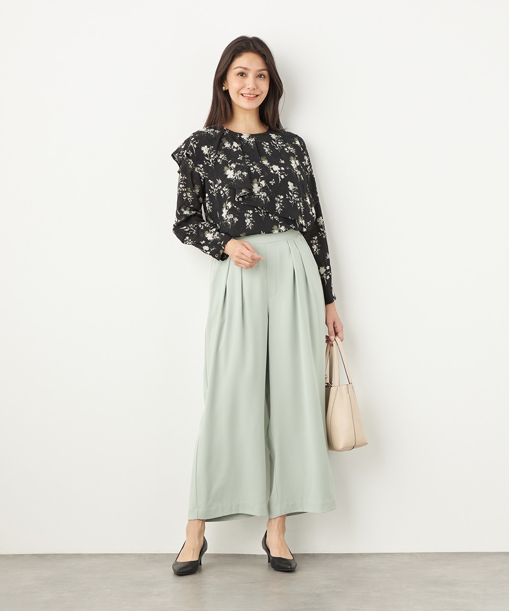 にじみ感の見られる繊細なプリントが優しくナチュラルな雰囲気を演出します。フリルのディテールにより華やかさが増して、1枚で決まるデザインです。アシンメトリーなフォルムのモード感もポイント。シンプルなジャケットやカーディガンのインナーとしても活用できます。