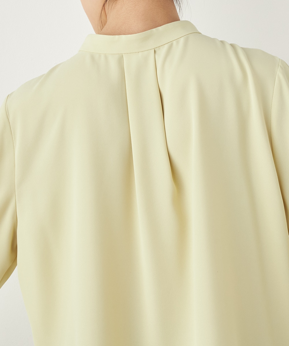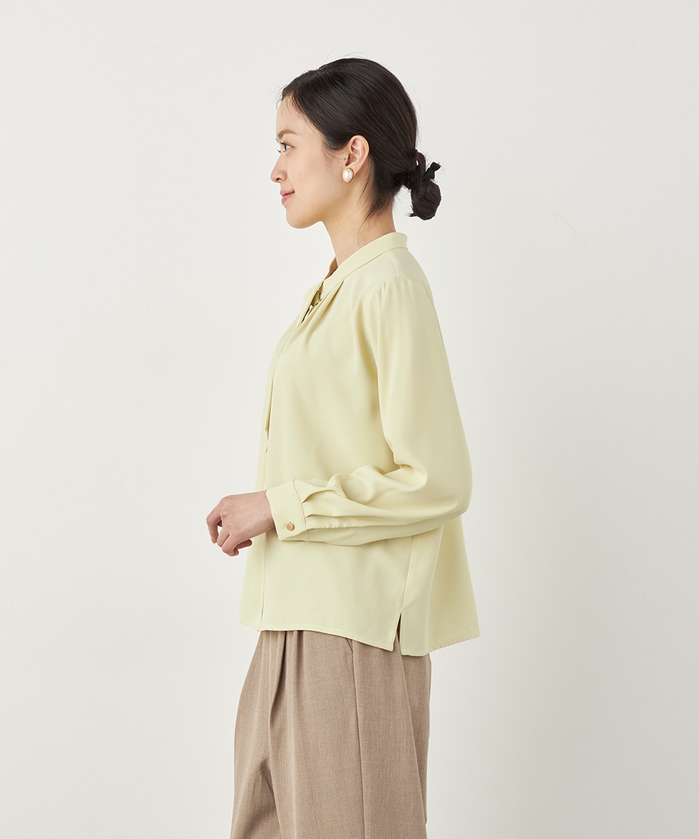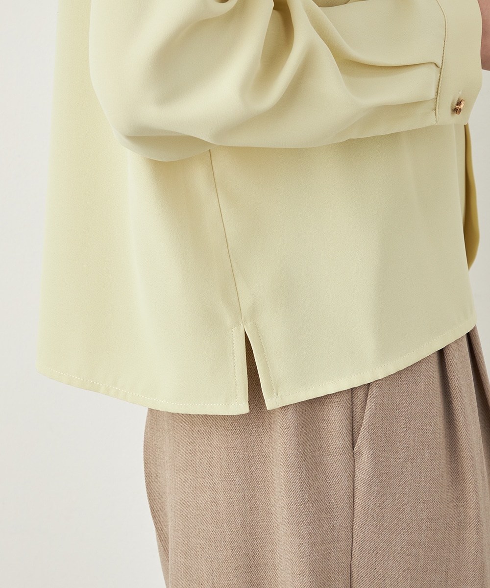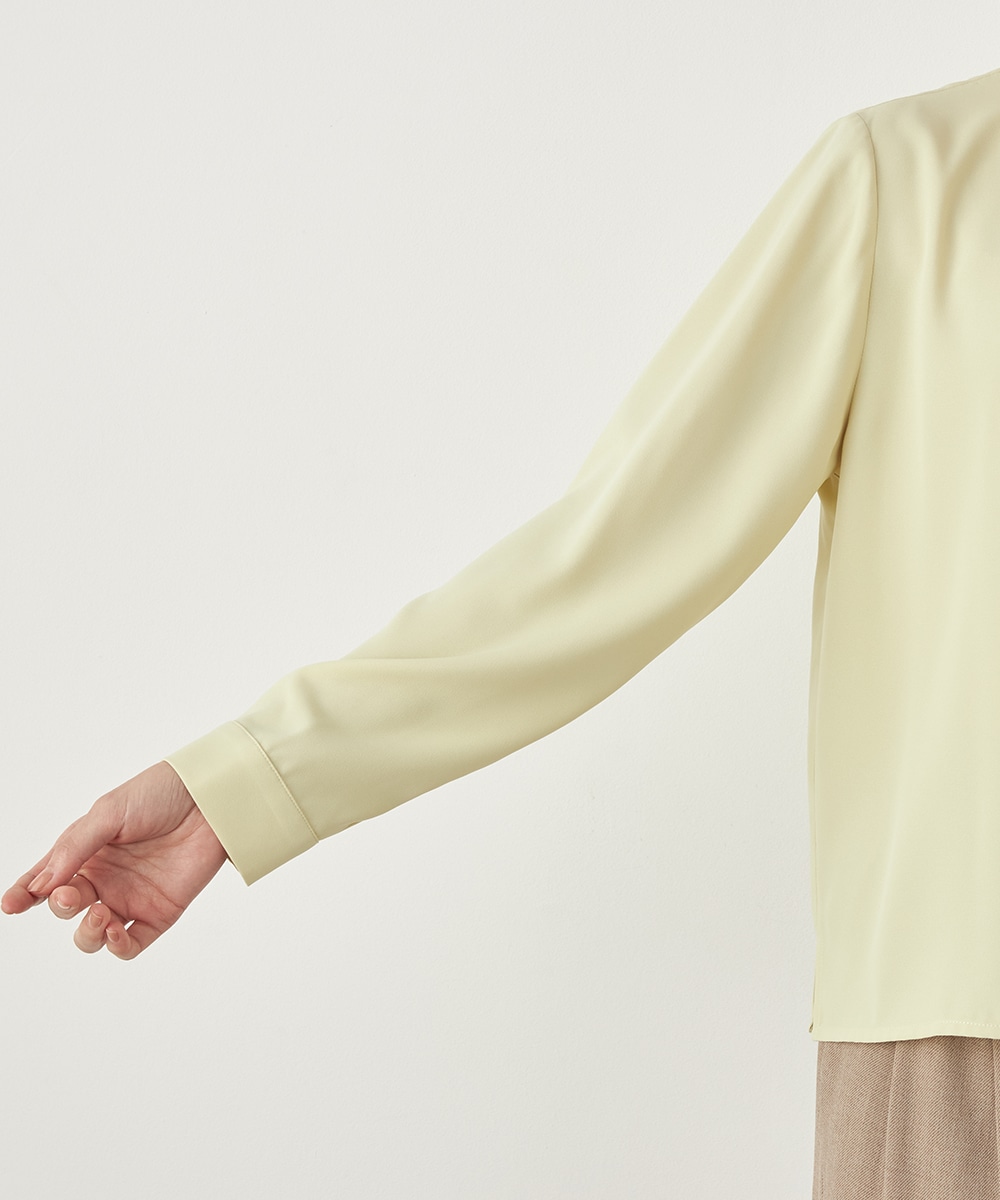 フェミニンかつキレイ目に着こなせるデザインです。ゴールドカラーのボタンが華やかなアクセントとして効いています。ほどよい高さの立ち襟を採用しており、リボンを外すとすっきりとした印象です。しなやかな風合いで上品な光沢感も魅力のサテン素材を使用しています。