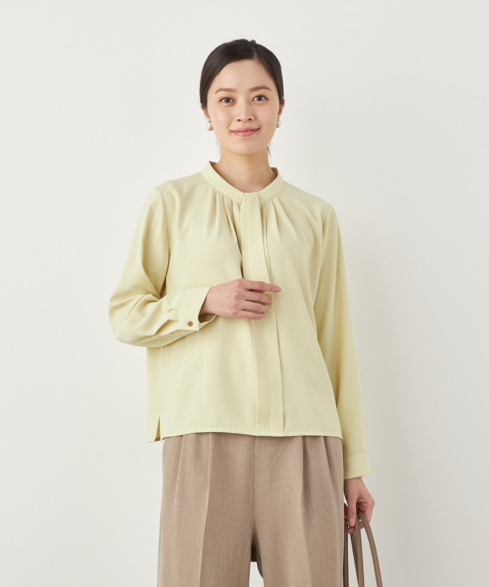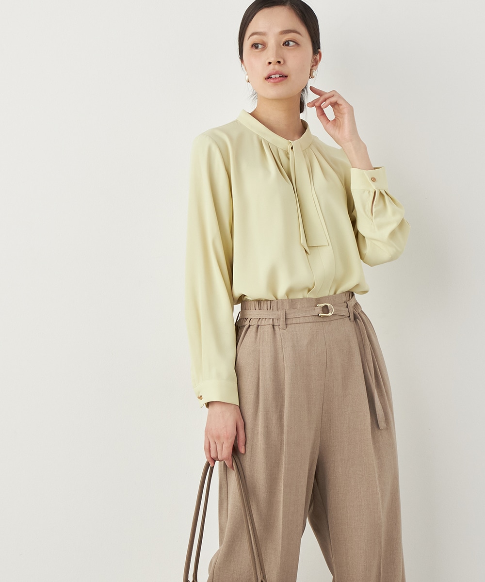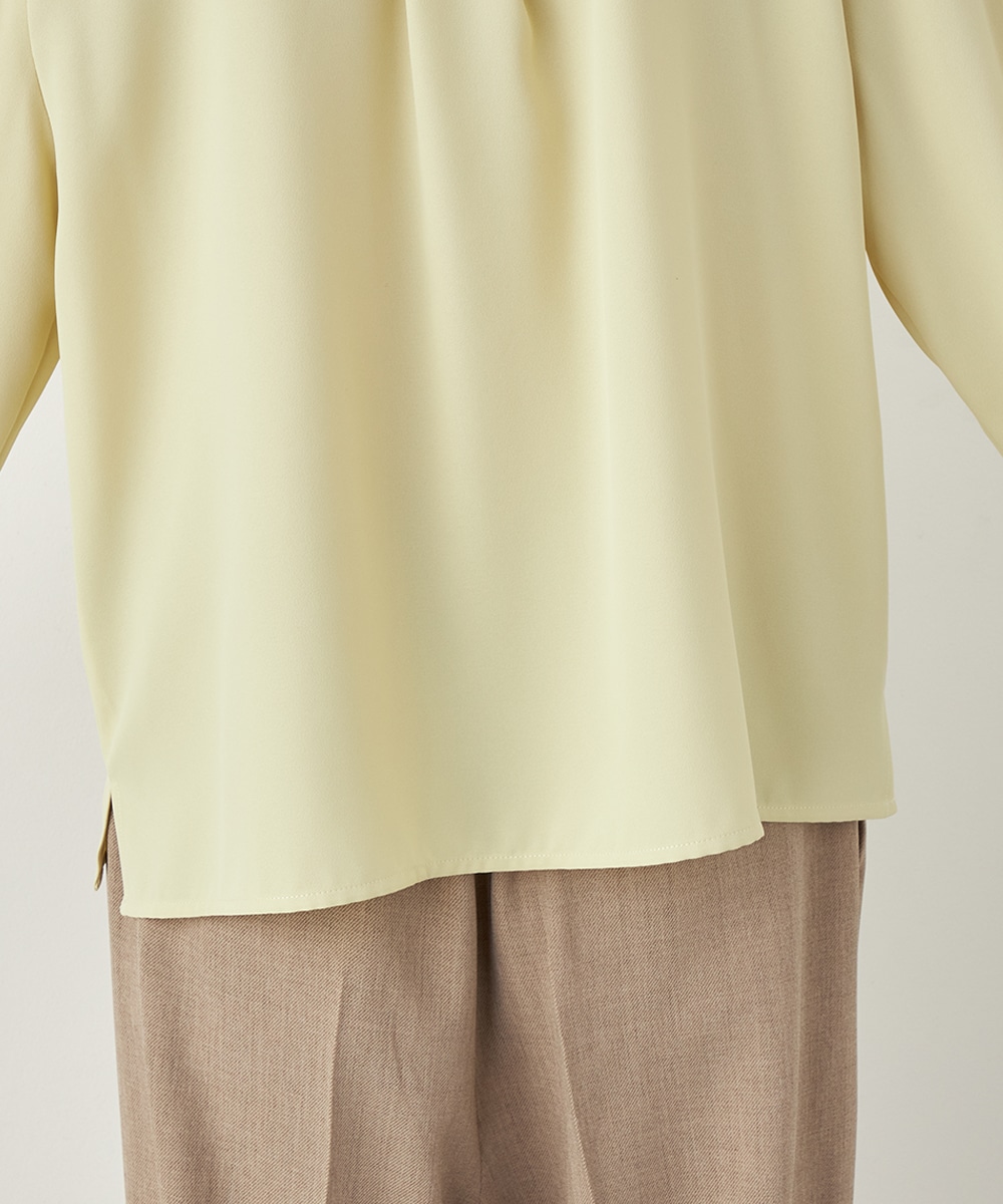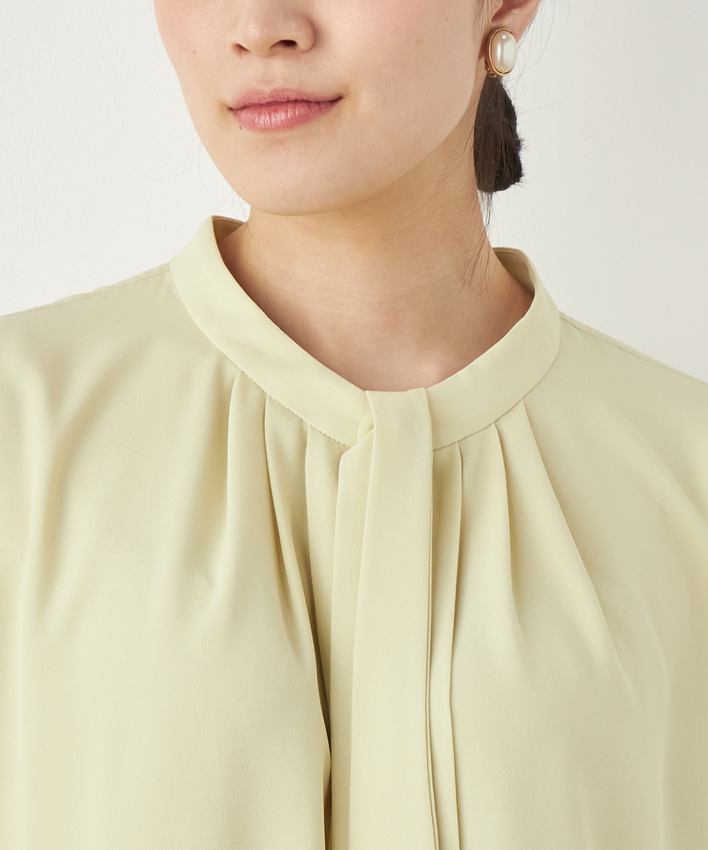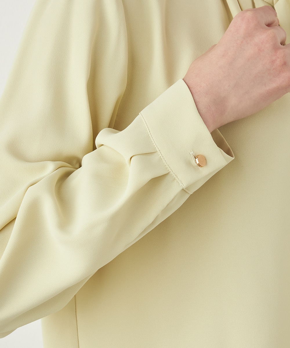 フェミニンかつキレイ目に着こなせるデザインです。ゴールドカラーのボタンが華やかなアクセントとして効いています。ほどよい高さの立ち襟を採用しており、リボンを外すとすっきりとした印象です。しなやかな風合いで上品な光沢感も魅力のサテン素材を使用しています。