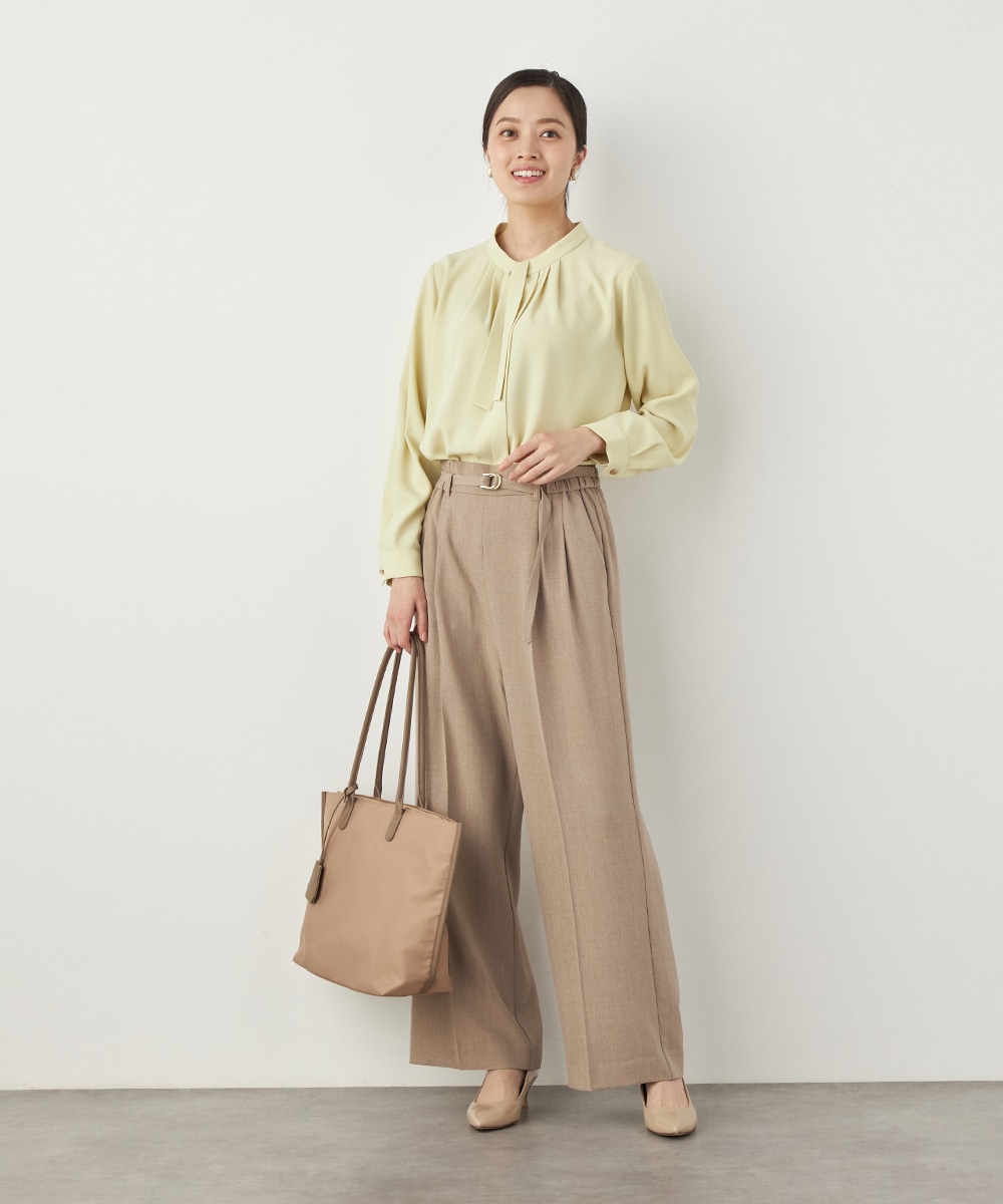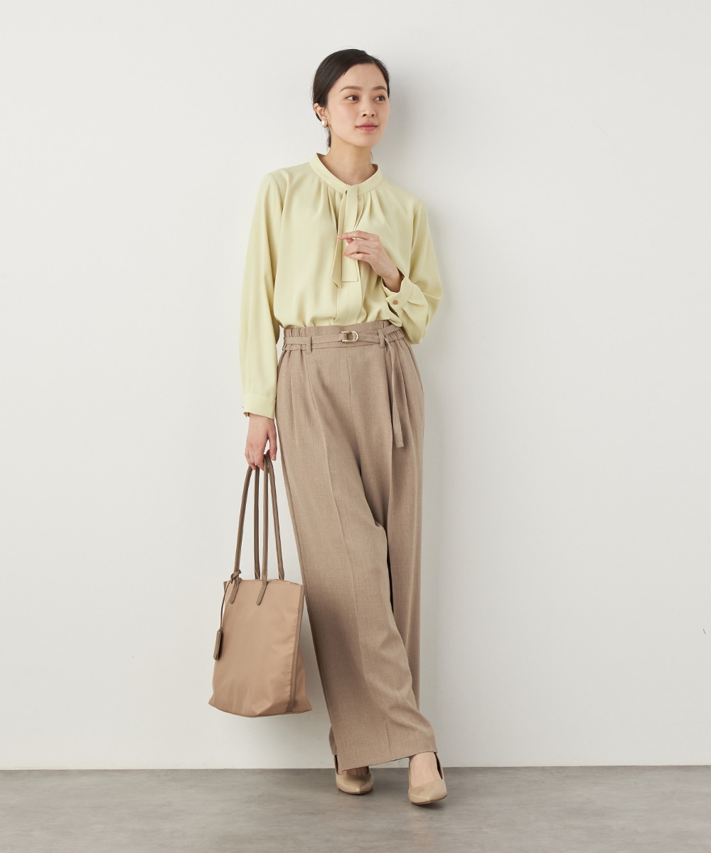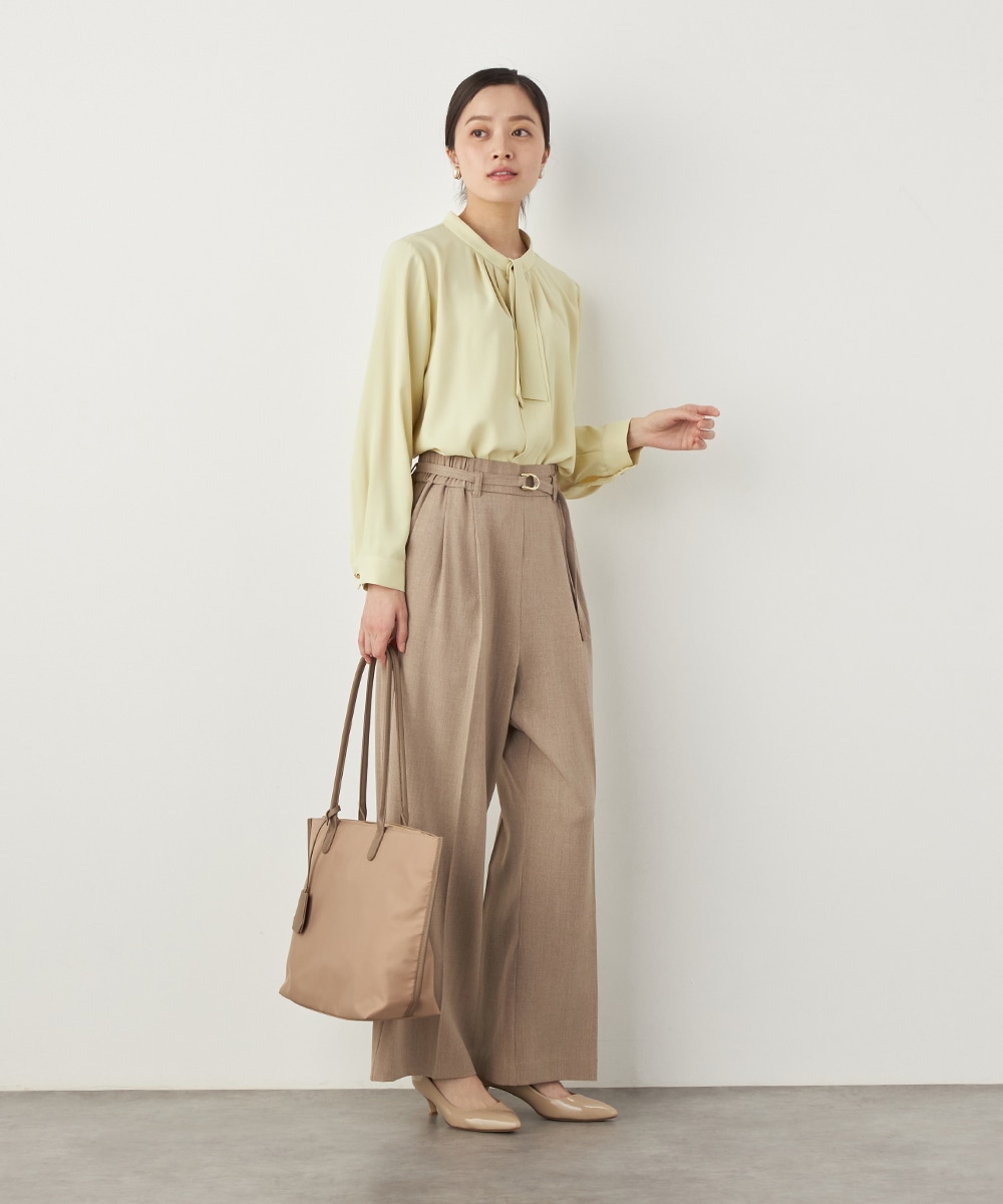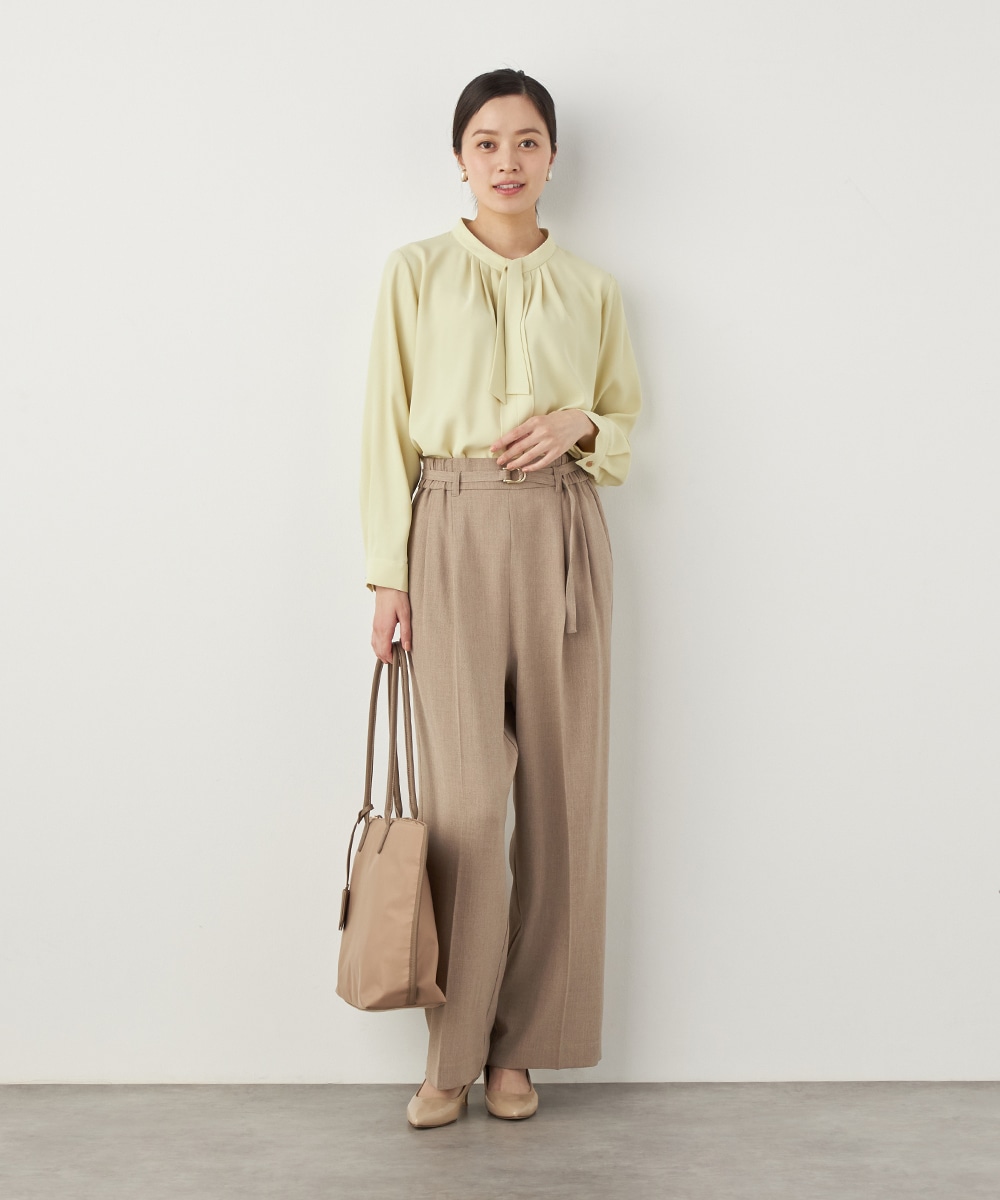 フェミニンかつキレイ目に着こなせるデザインです。ゴールドカラーのボタンが華やかなアクセントとして効いています。ほどよい高さの立ち襟を採用しており、リボンを外すとすっきりとした印象です。しなやかな風合いで上品な光沢感も魅力のサテン素材を使用しています。