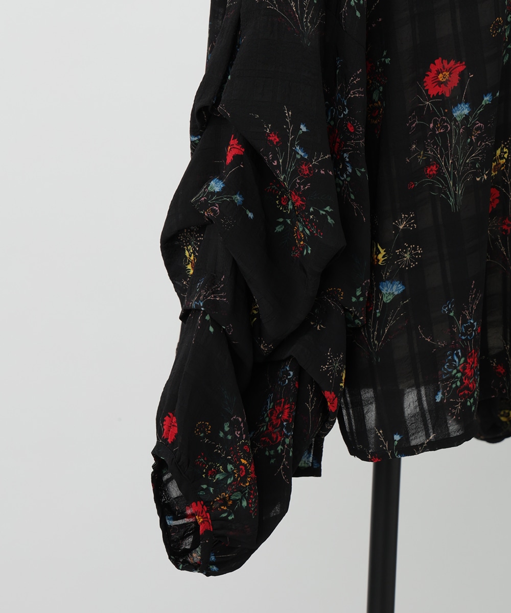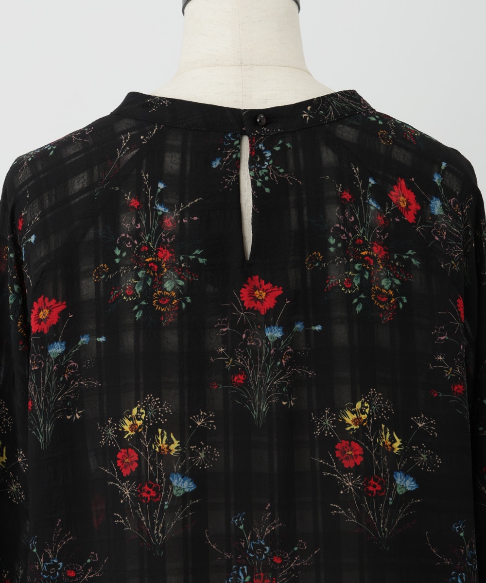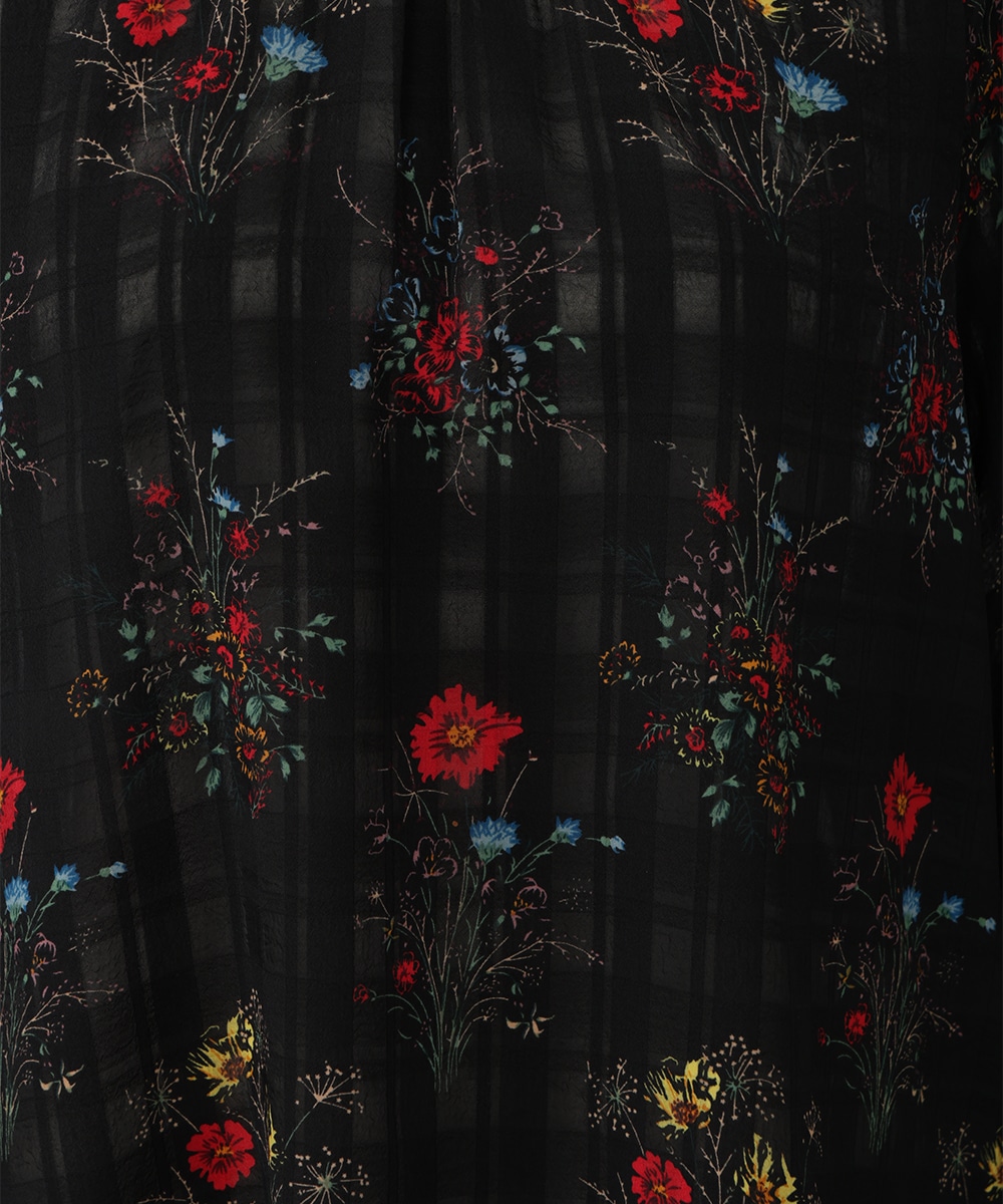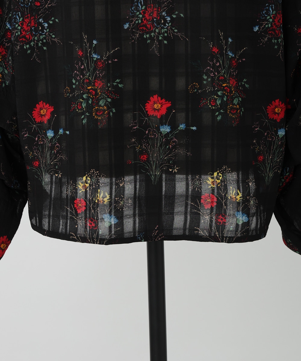 薄手のチェック地にフラワープリントを添えた、やわらかな女性らしさ漂うブラウス。スリーブはくしゅっとしたギャザーを寄せ、立体感のあるシルエットを楽しめるデザインです。シワ感のある軽やかな素材が魅力的。パンツスタイルと合わせれば、大人フェミニンなスタイリングが完成するアイテムです。