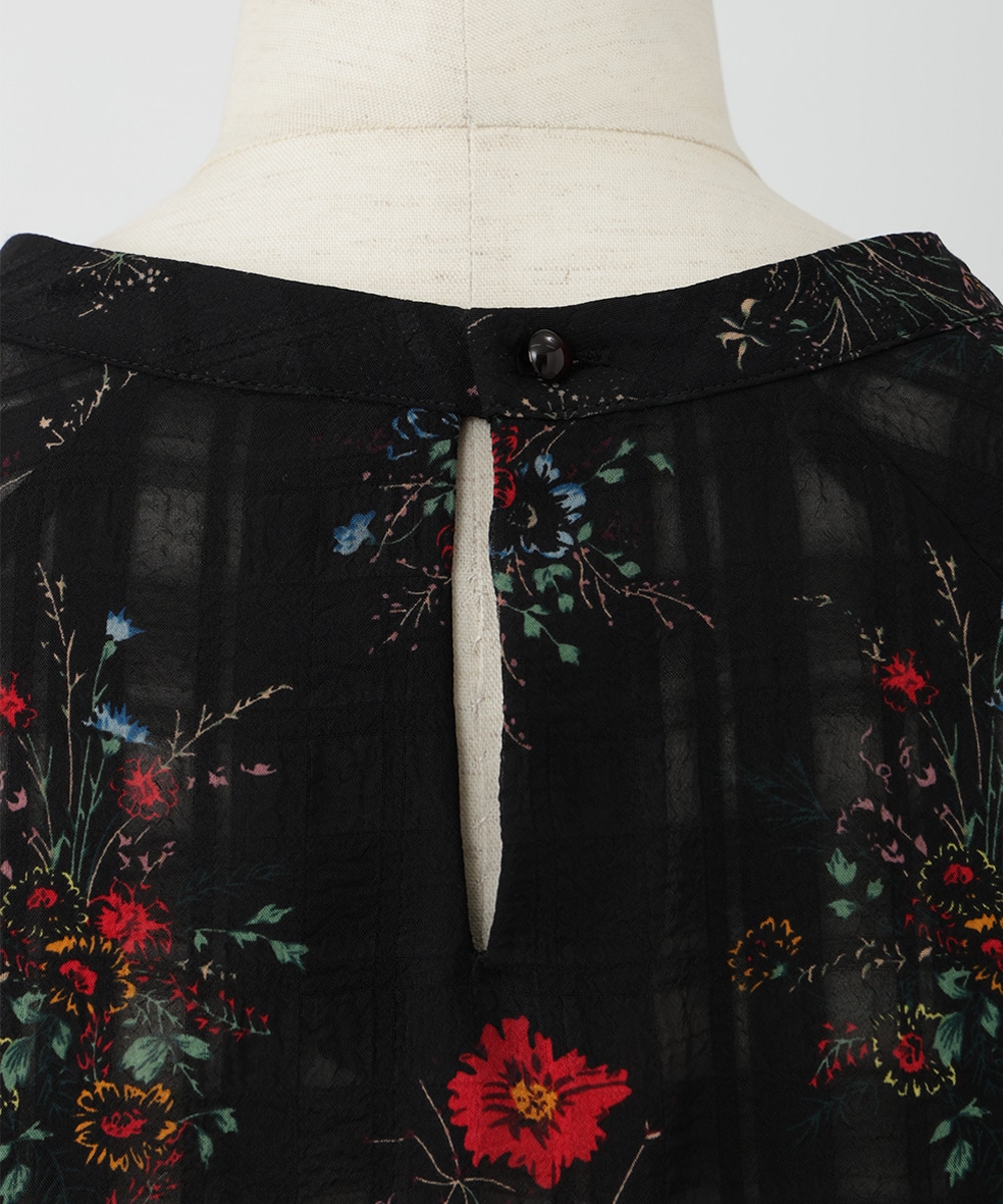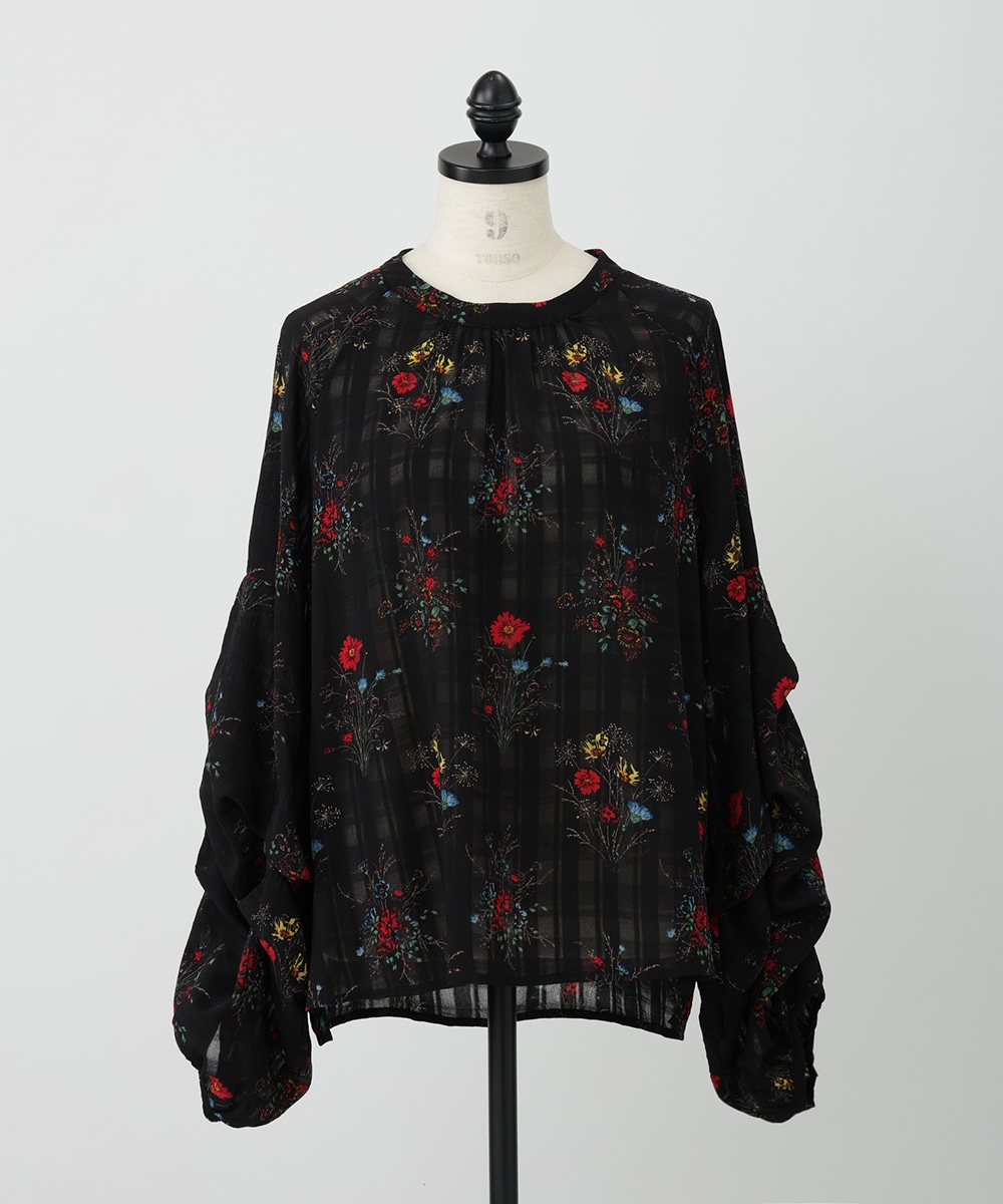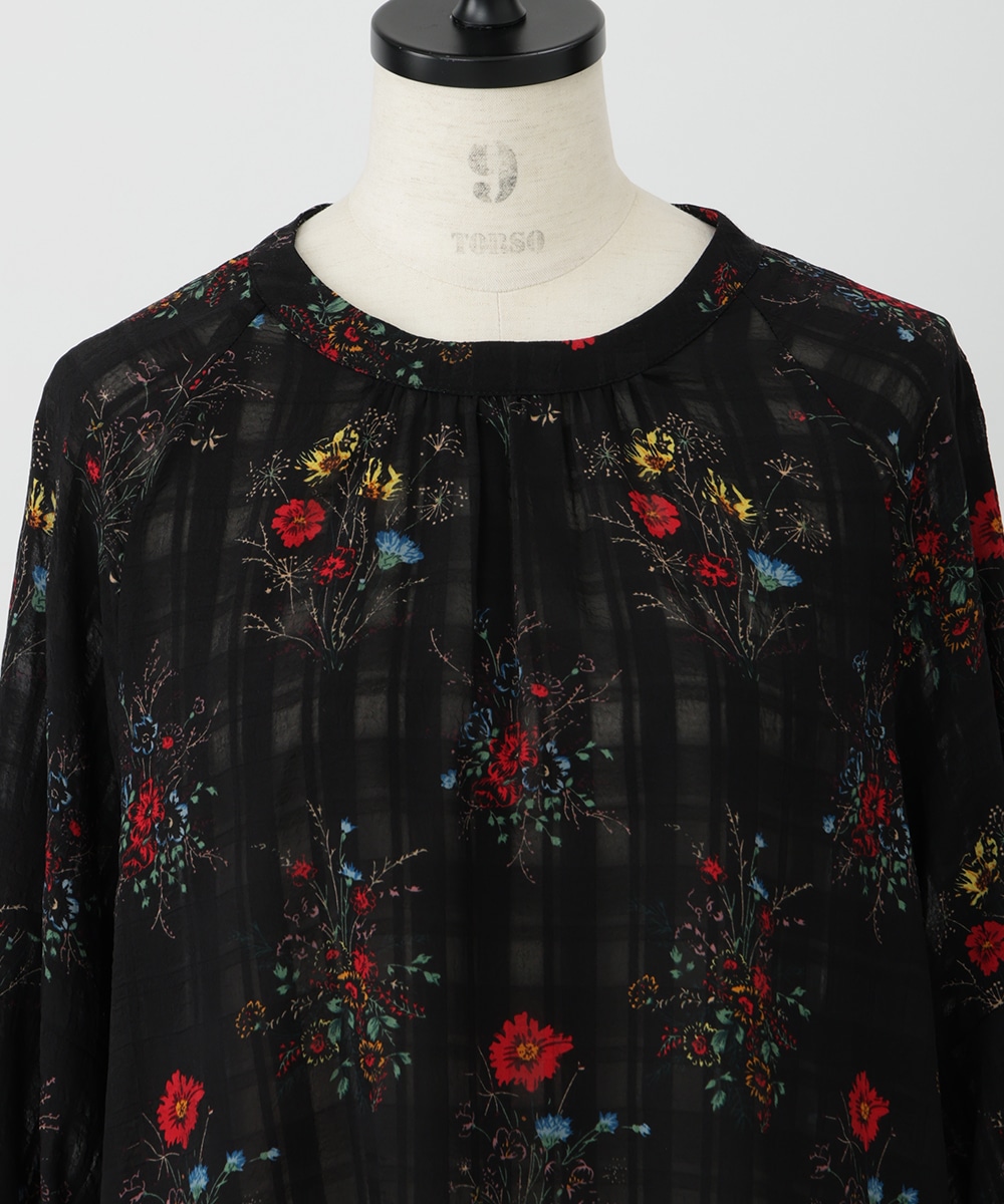 薄手のチェック地にフラワープリントを添えた、やわらかな女性らしさ漂うブラウス。スリーブはくしゅっとしたギャザーを寄せ、立体感のあるシルエットを楽しめるデザインです。シワ感のある軽やかな素材が魅力的。パンツスタイルと合わせれば、大人フェミニンなスタイリングが完成するアイテムです。
